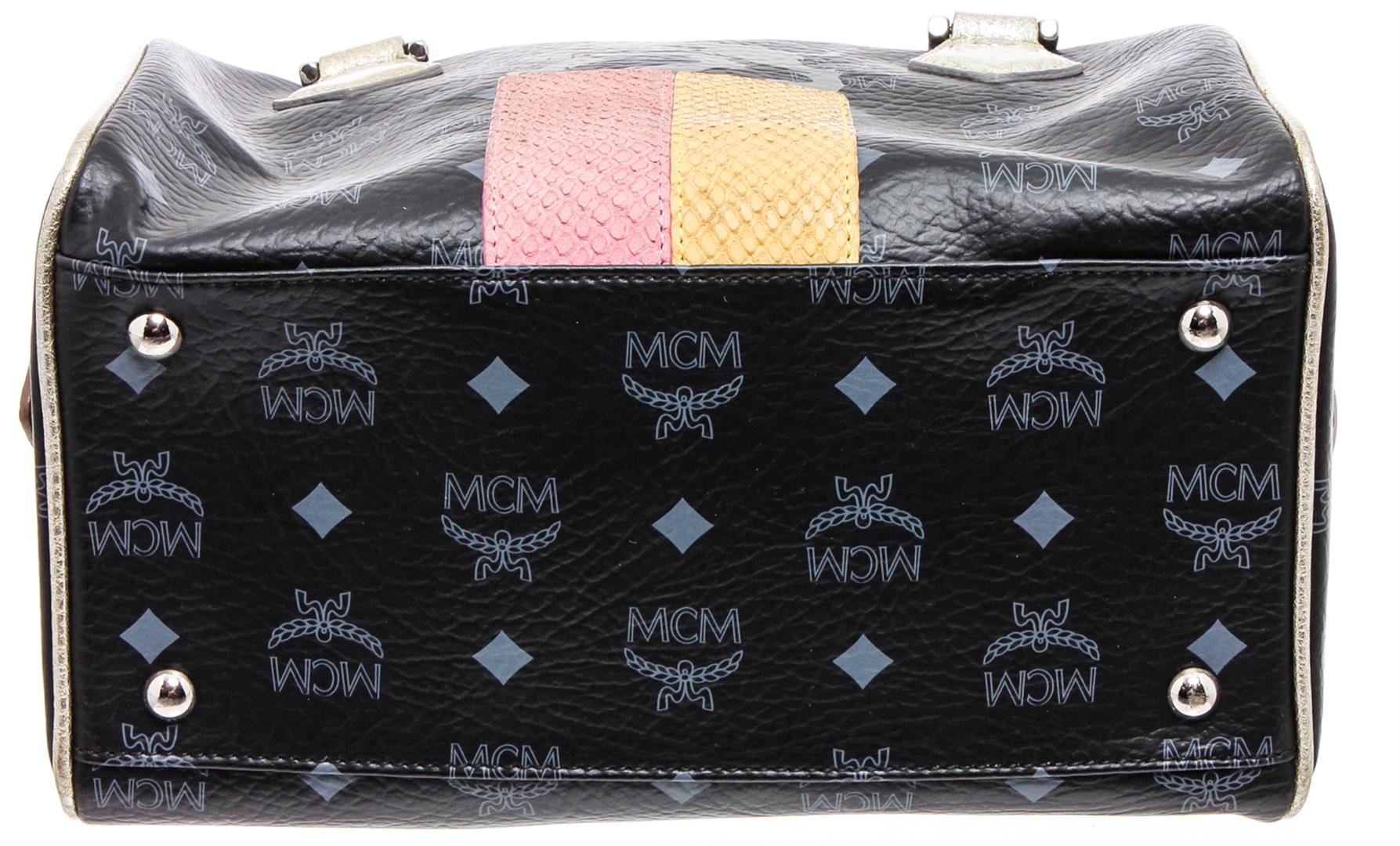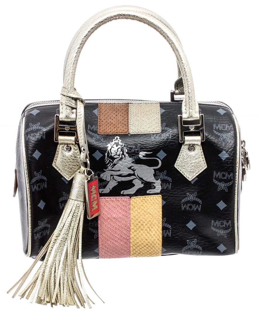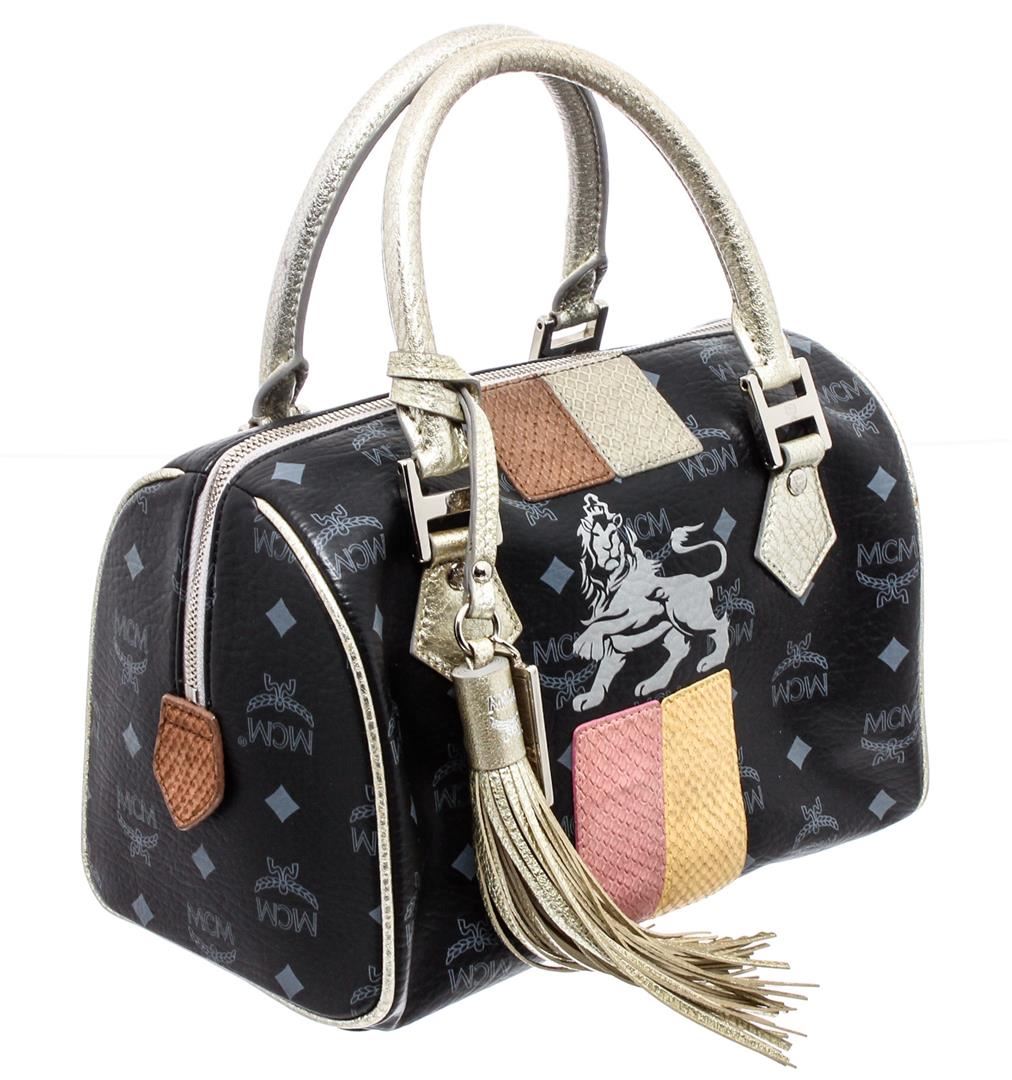 Black and grey Viestos coated canvas MCM Boston bag with silver-tone hardware, dual rolled top handles, multicolor embossed leather trim, MCM tassel charm at front, grey woven lining, three interior pockets; one with zip closure and zip closure at top.