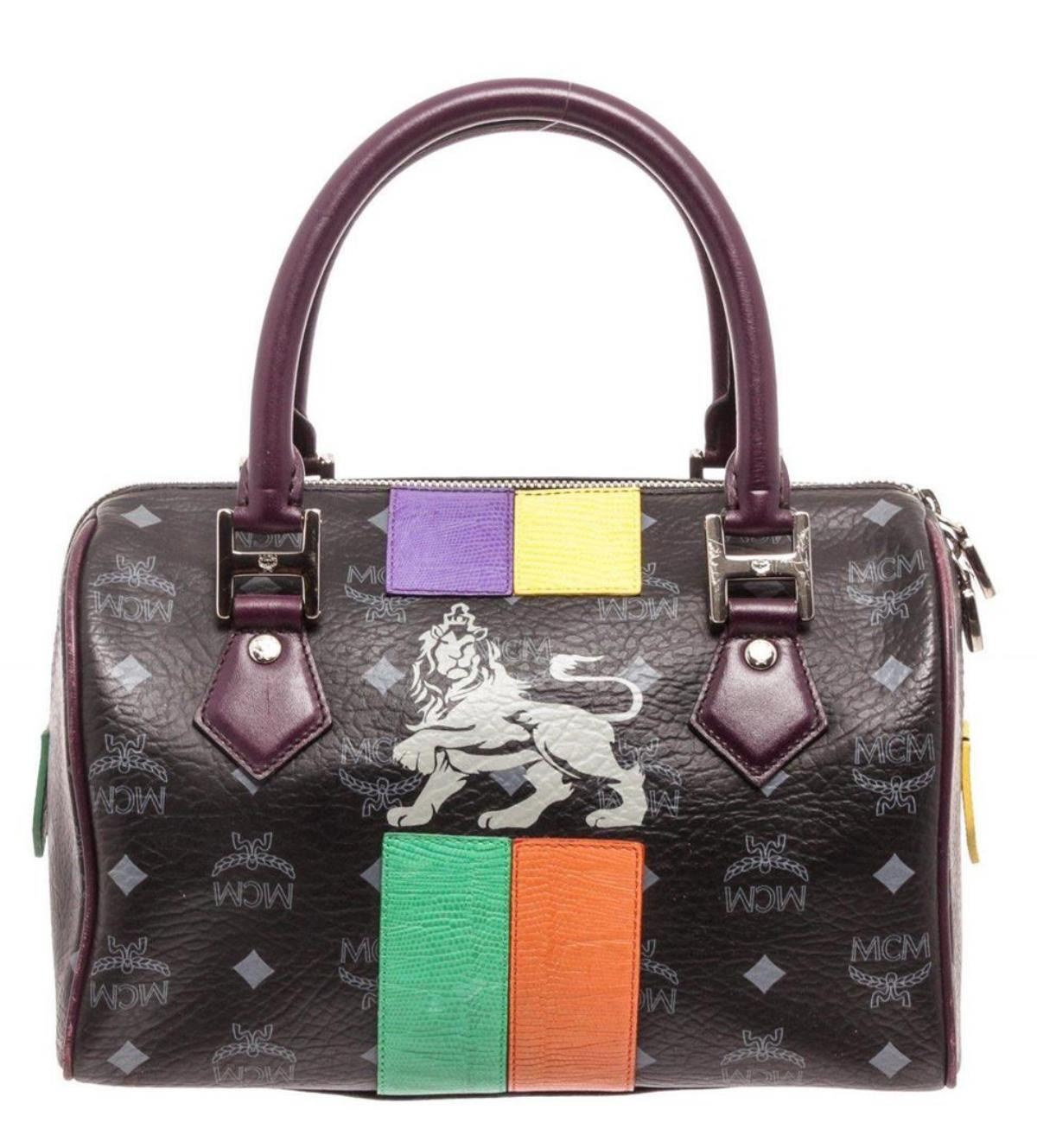 MCM Black Visetos Coated Canvas & Leather Lion Boston Satchel Bag with silver-tone hardware, Purple leather handles, croc embossed multicolor stripes and lion stamp at front, brown suede interior lining, three interior pockets and overall zip closure at top. CONDITION: Pre-Owned Good overall, please see photographs for detail.