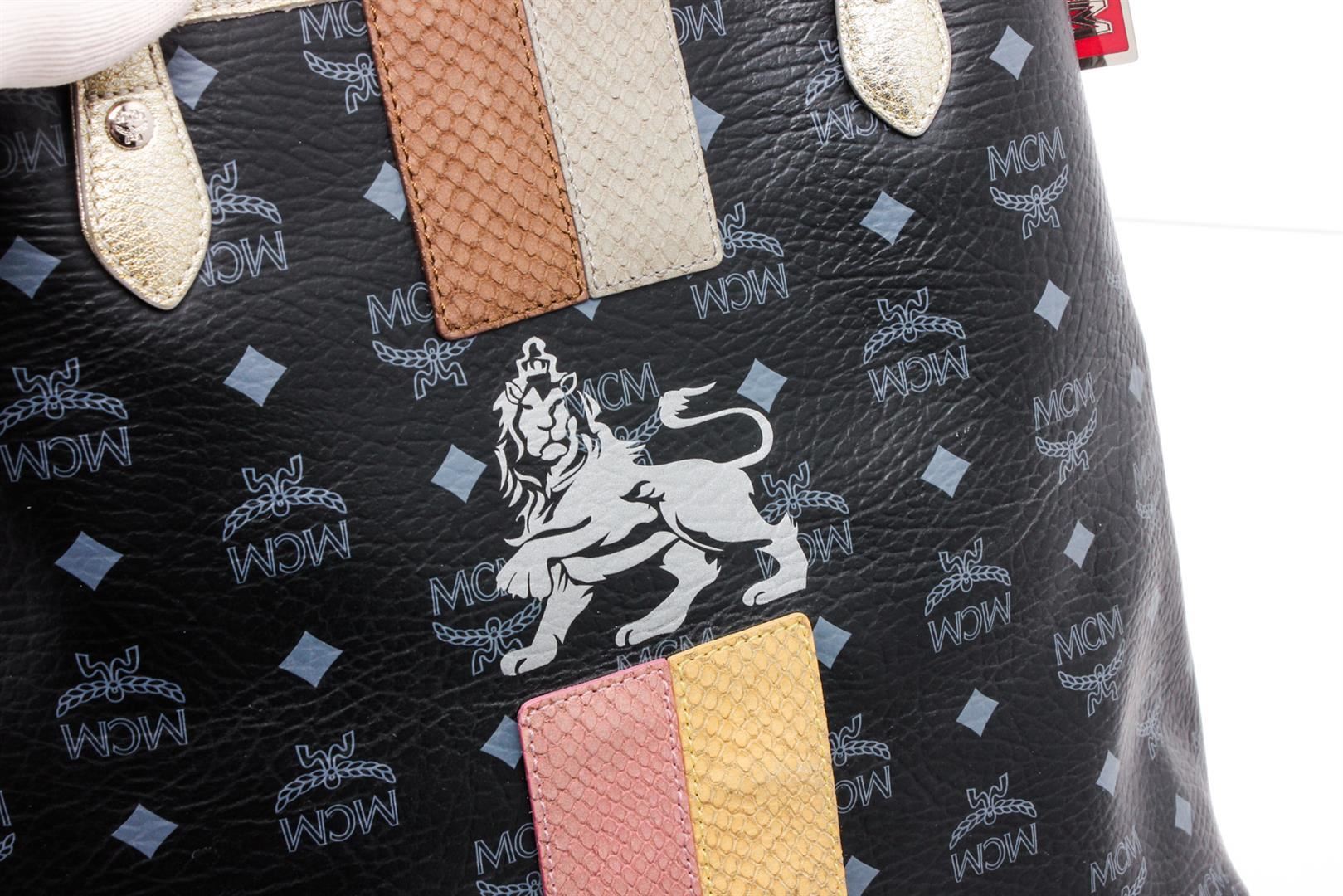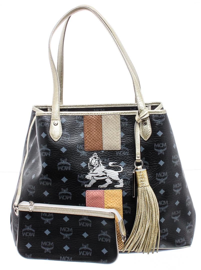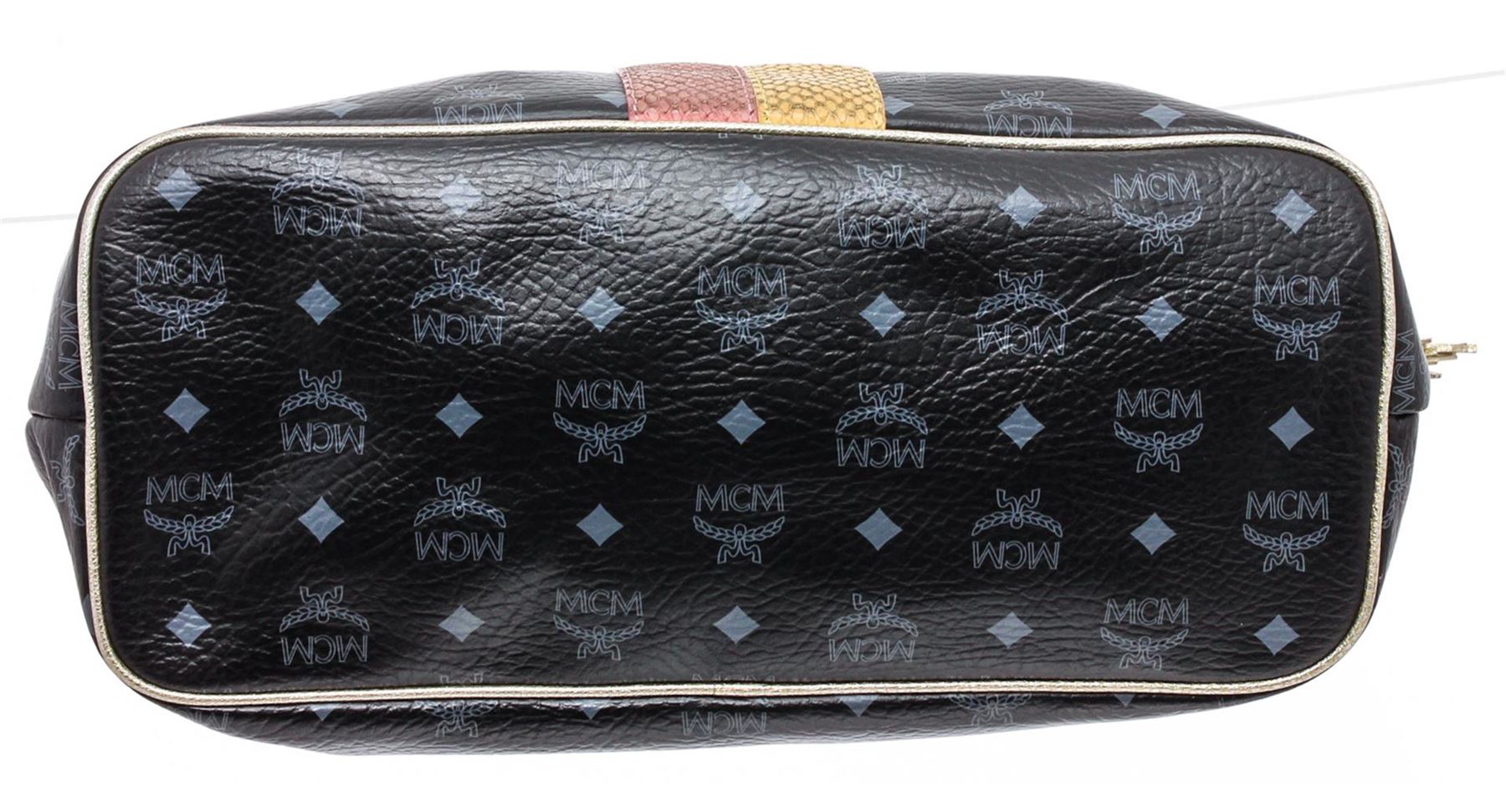 Black Visetos coated canvas MCM tote bag with metallic gold leather trim, faux snake detail at front, silver-tone hardware, dual flat shoulder straps, tonal canvas lining, and single zip pocket at interior wall.