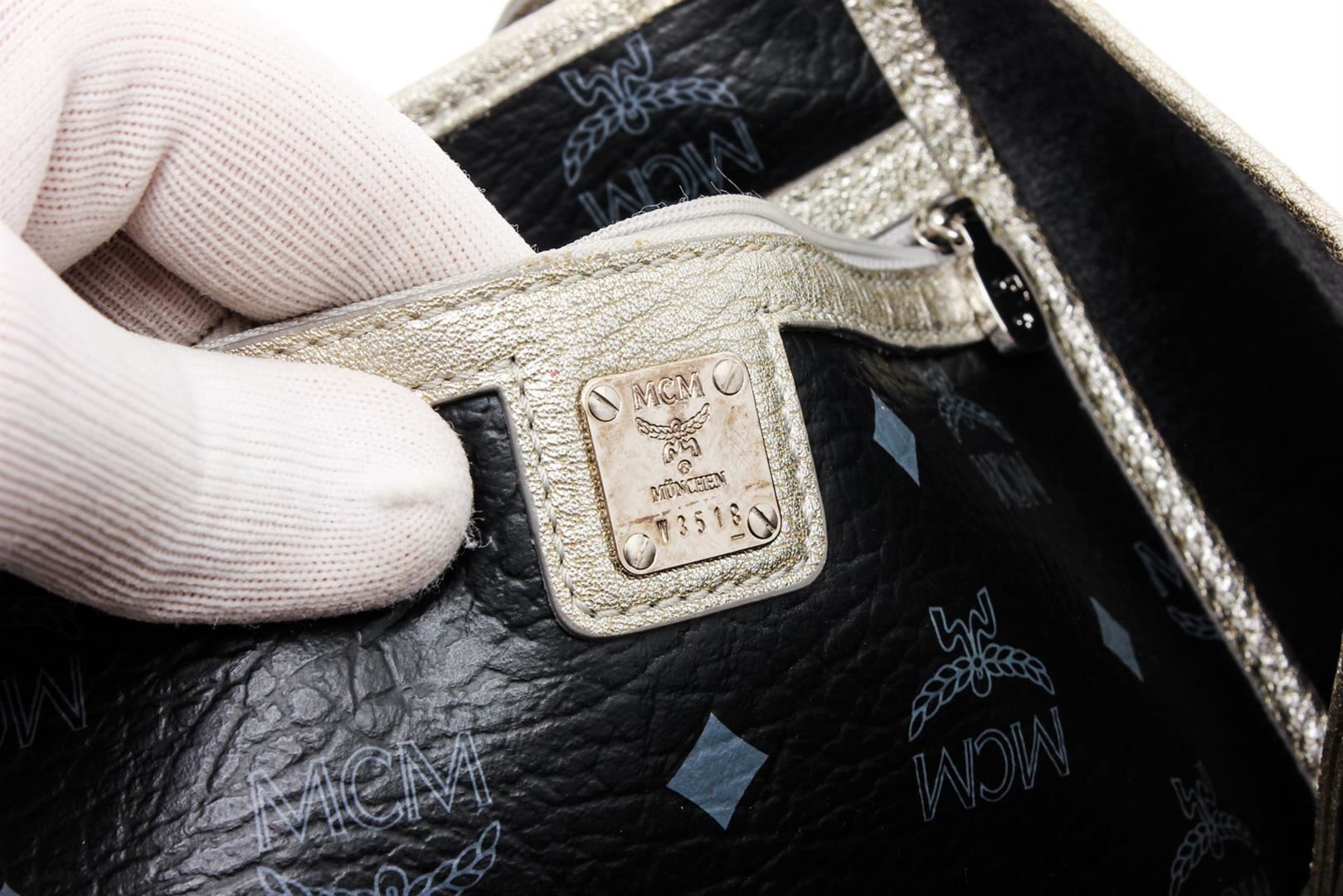 Black Visetos coated canvas MCM tote bag with metallic gold leather trim, faux snake detail at front, silver-tone hardware, dual flat shoulder straps, tonal canvas lining, and single zip pocket at interior wall.