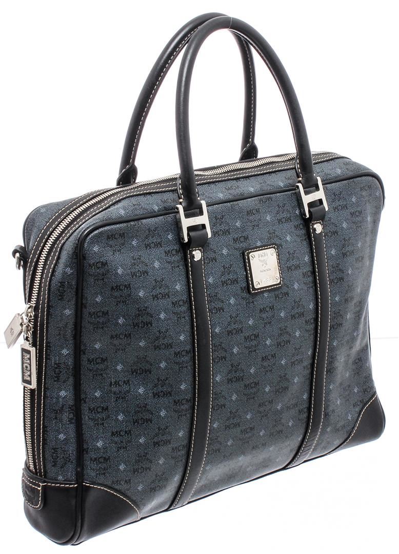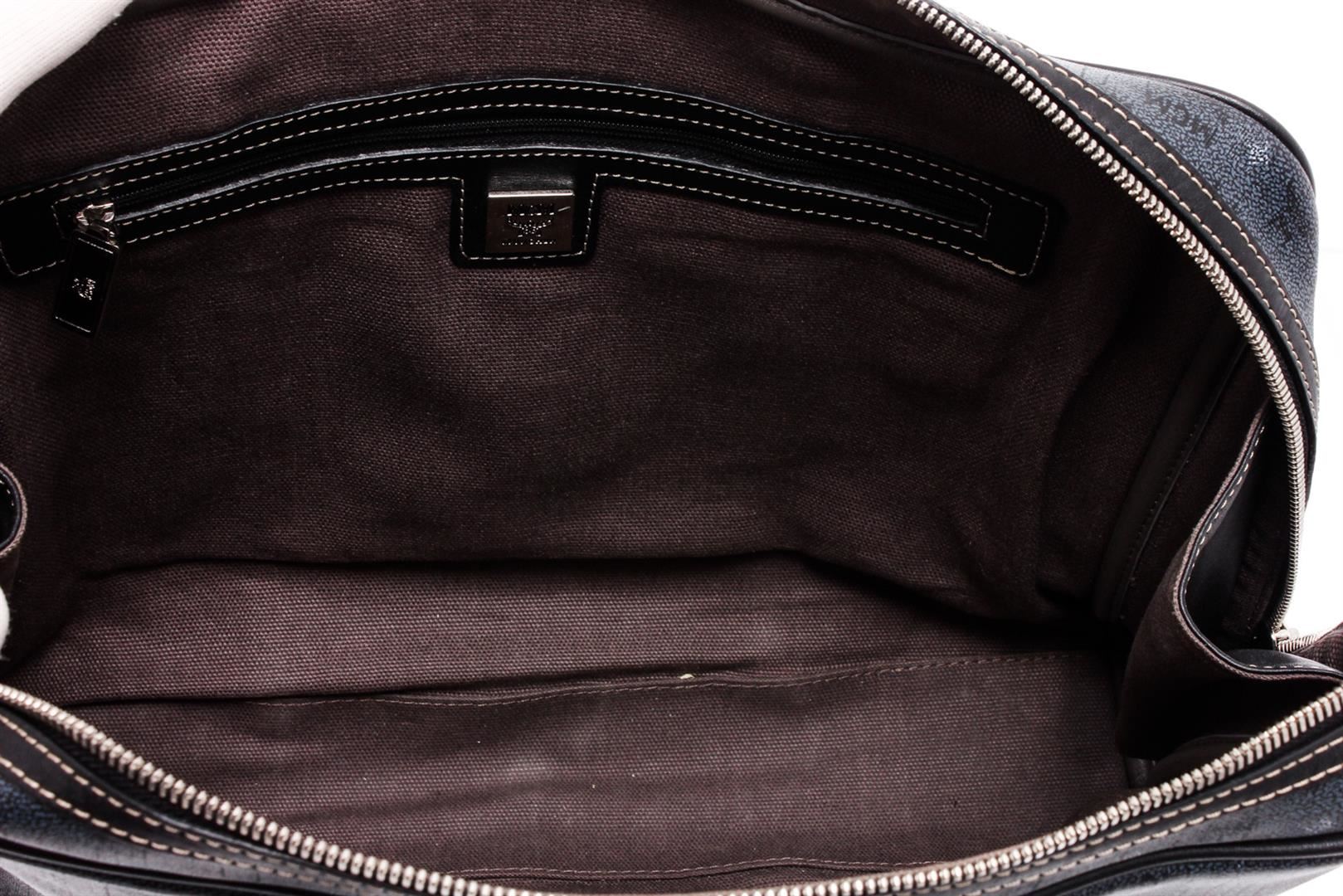 MCM black Visetos coated canvas messenger bag with silver-tone hardware, dual rolled top handles, optional detachable shoulder strap, logo placard at front face, protective feet at base, single slip pocket at back, grey canvas interior lining, three interior pockets; one with zip closure and overall zip closure at top.