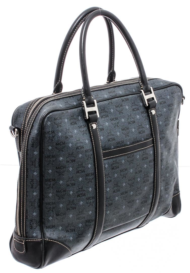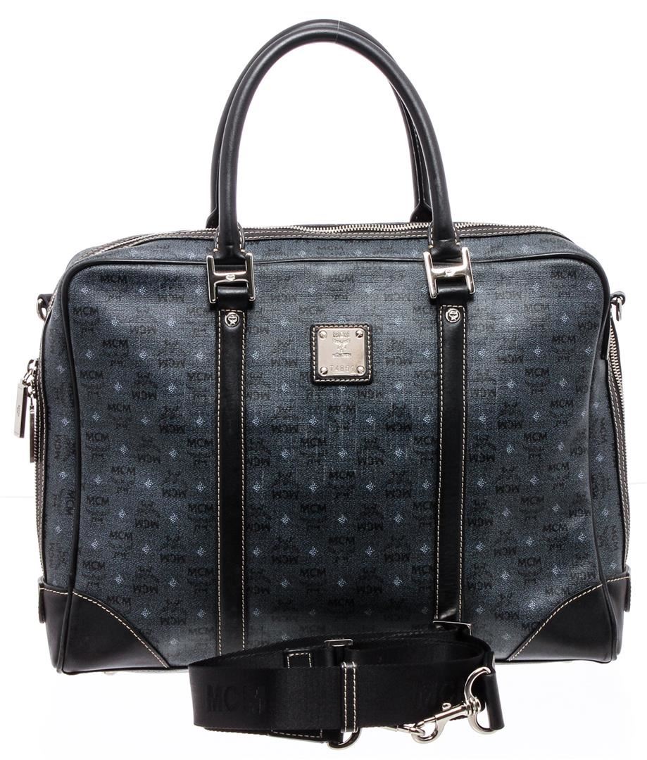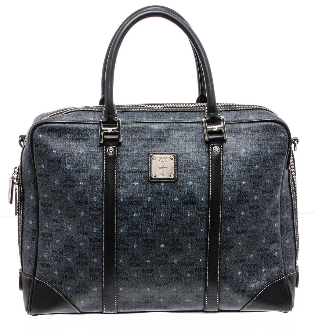 MCM black Visetos coated canvas messenger bag with silver-tone hardware, dual rolled top handles, optional detachable shoulder strap, logo placard at front face, protective feet at base, single slip pocket at back, grey canvas interior lining, three interior pockets; one with zip closure and overall zip closure at top.