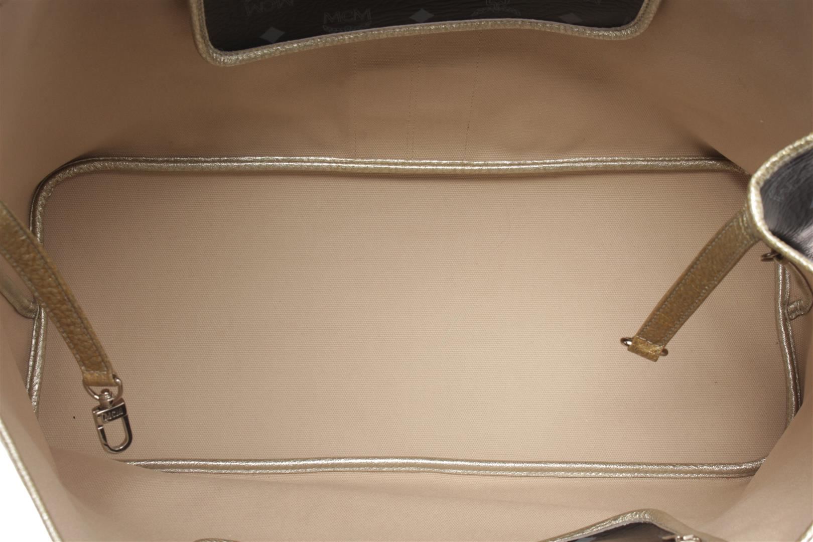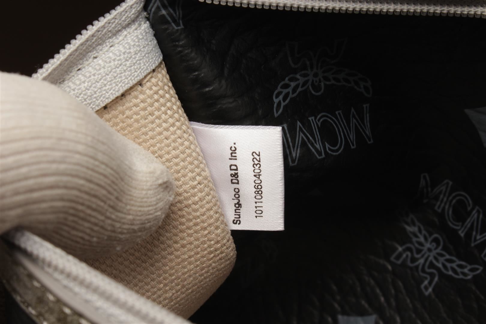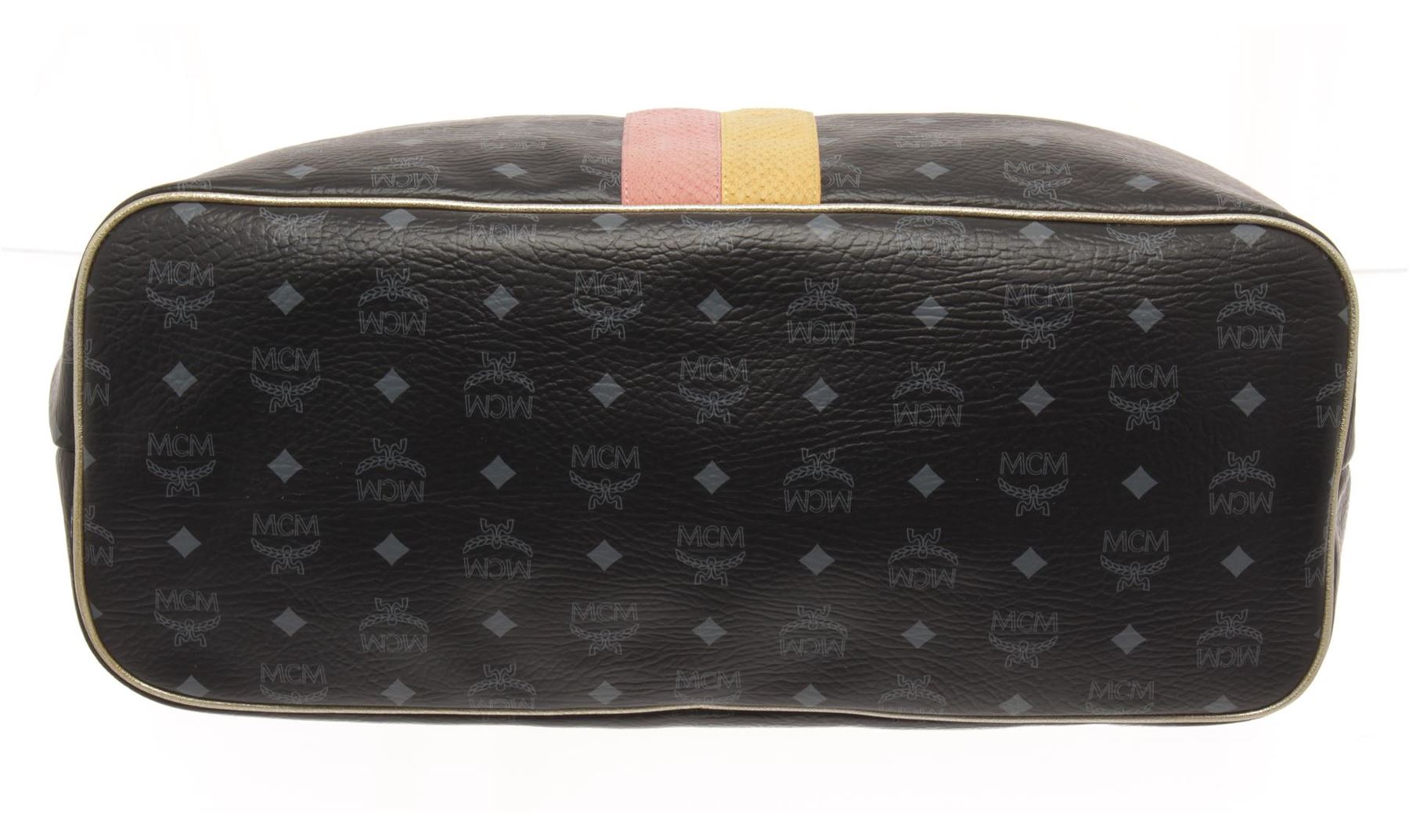 One MCM Black Visetos Leather Striped Lion Shopper Bag. Item is sold AS-IS. All available information is listed in the description and shown in the photo. MCM Black Visetos Leather Striped Lion Shopper Bag with black leather logo patterned exterior, multicolor stripes with a silver lion on front center, gold leather trims, top handles, and tassel; beige canvas lining, open top, gold-tone hardware, and one interior zip pocket.