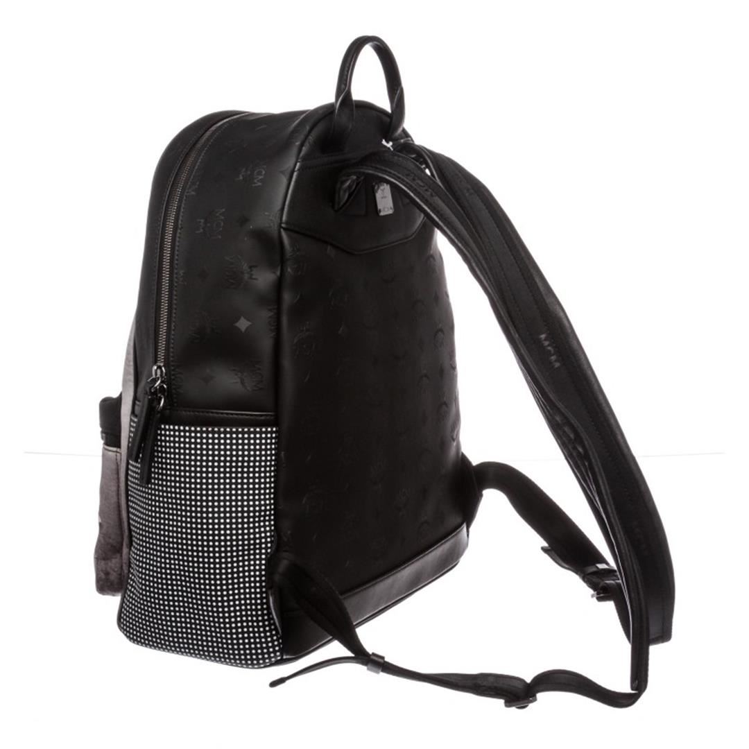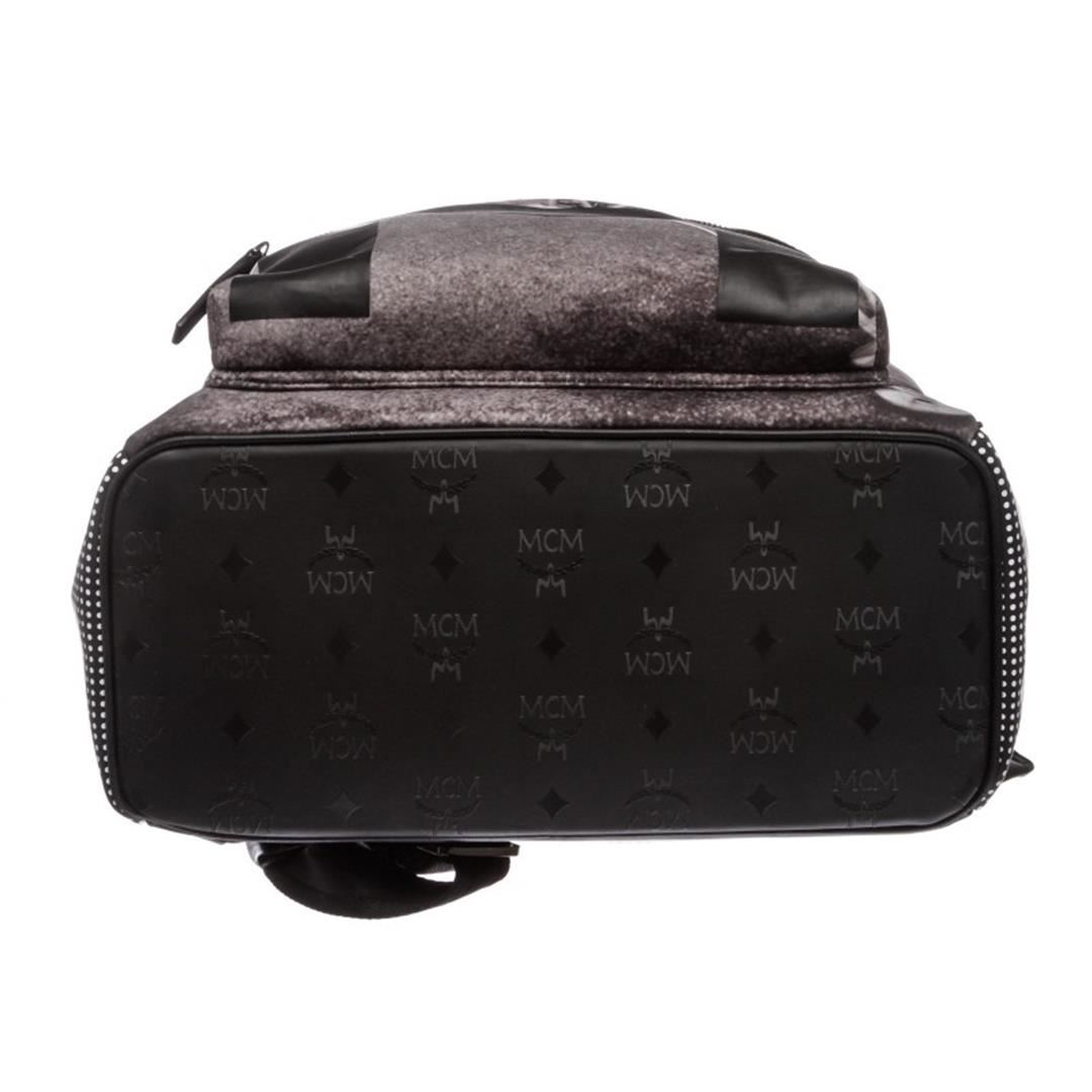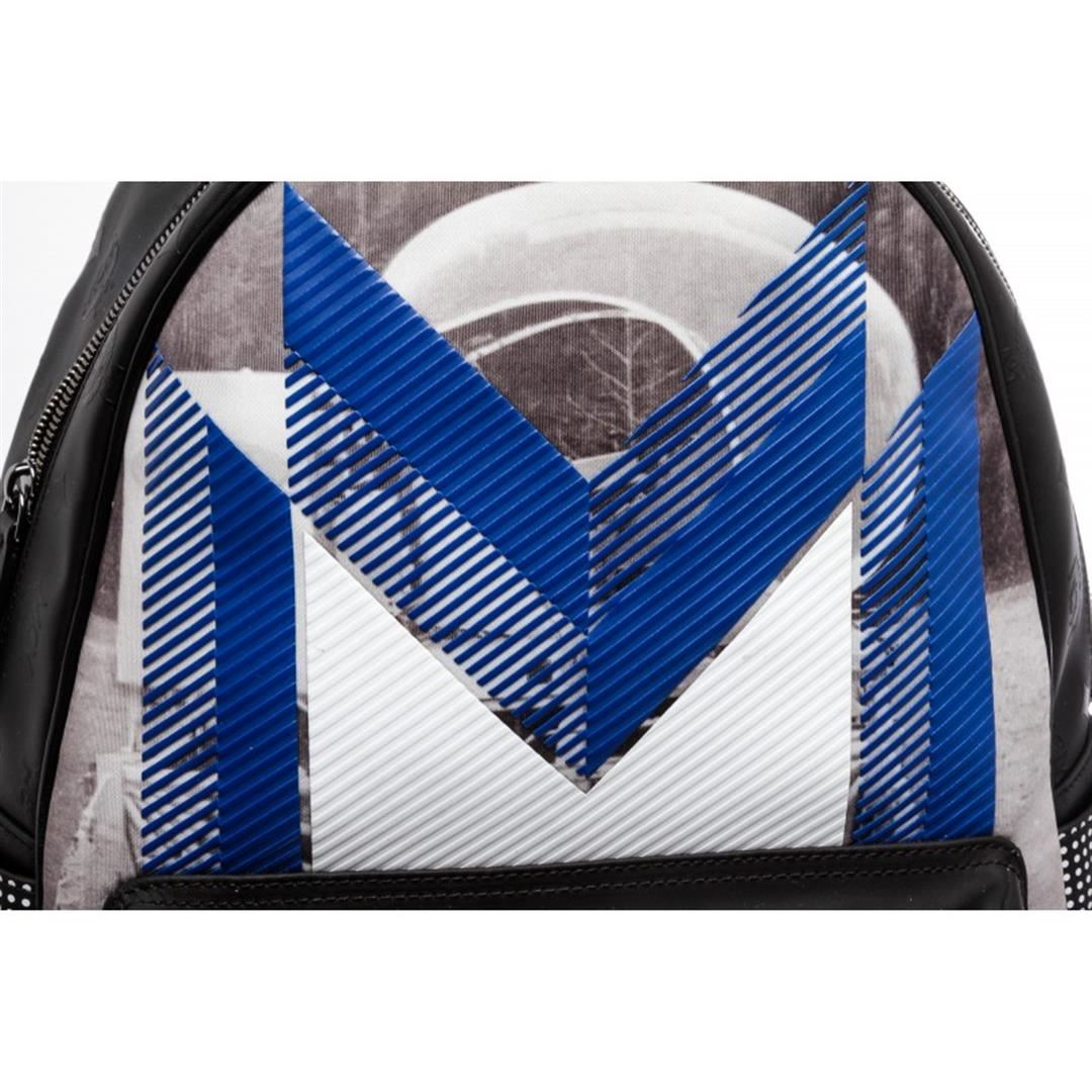 Black and Blue Visetos Coated Canvas MCM backpack with gunmetal tone hardware, dual adjustable flat shoulder straps, single flat handle, one exterior zipper compartment and two side slip pockets. Interior is fabric lined with one expandable slip pocket, one side slip pocket and one zipper pocket. Item is pre-owned.