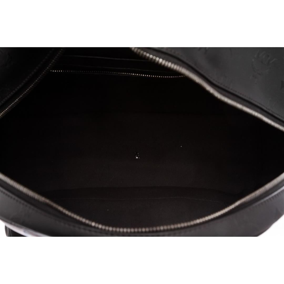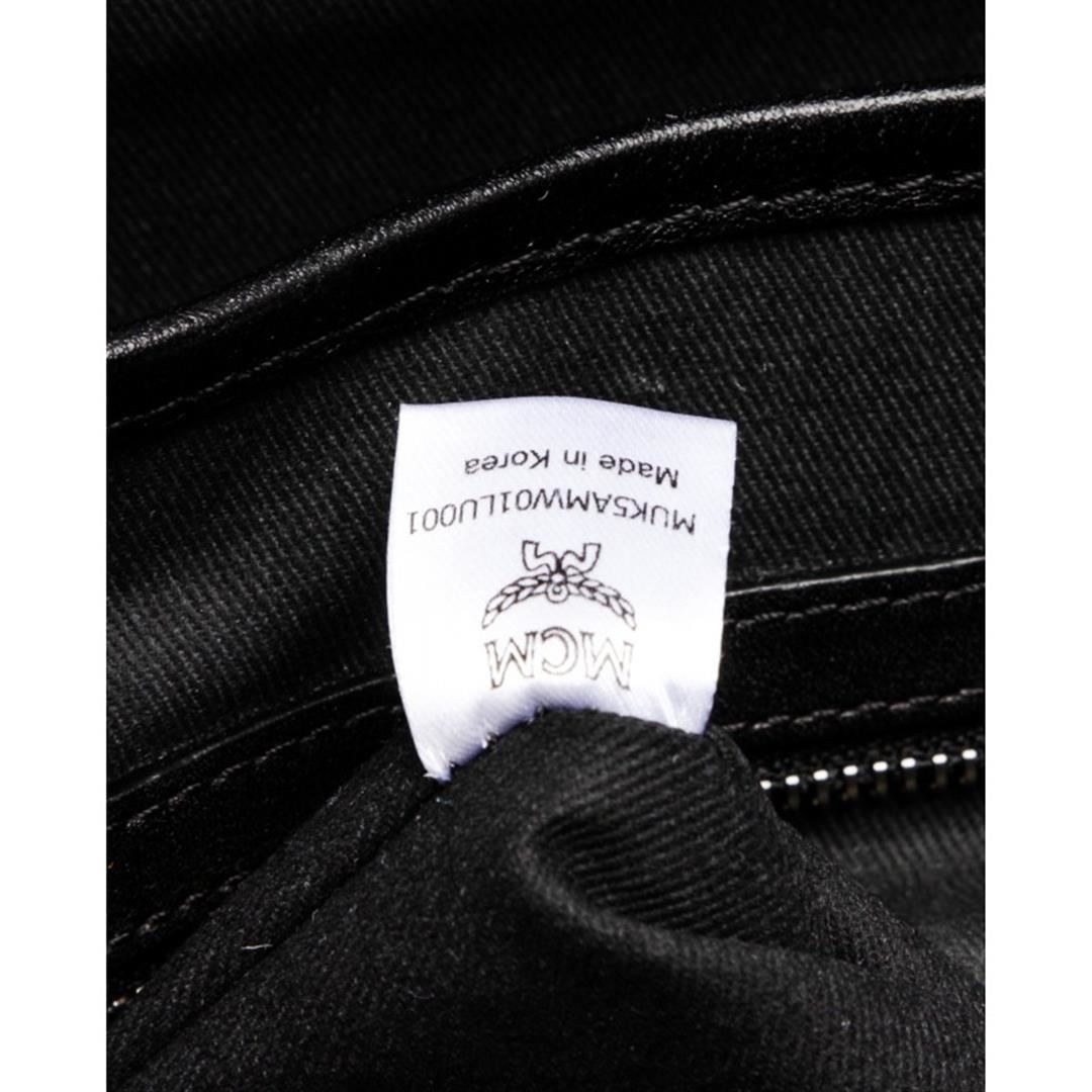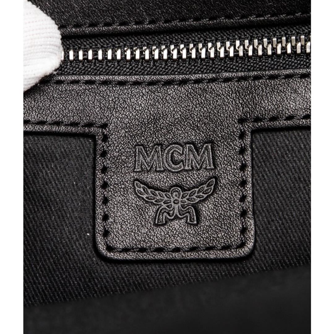 Black and Blue Visetos Coated Canvas MCM backpack with gunmetal tone hardware, dual adjustable flat shoulder straps, single flat handle, one exterior zipper compartment and two side slip pockets. Interior is fabric lined with one expandable slip pocket, one side slip pocket and one zipper pocket. Item is pre-owned.