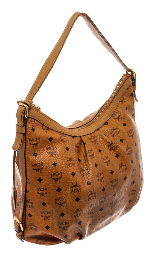 MCM Brown Canvas Leather Hobo Bag. All available information is listed in the description and shown in the photos. MCM Brown Canvas Leather Hobo Bag with gold-tone hardware, leather trim, single adjustable shoulder strap, leather trim embellishment, twill lining & three interior pockets, zip closure at top. Height: 10", Width: 12.5", Depth: 4.5" / 25.4 x 31.75 x 11.43 CM