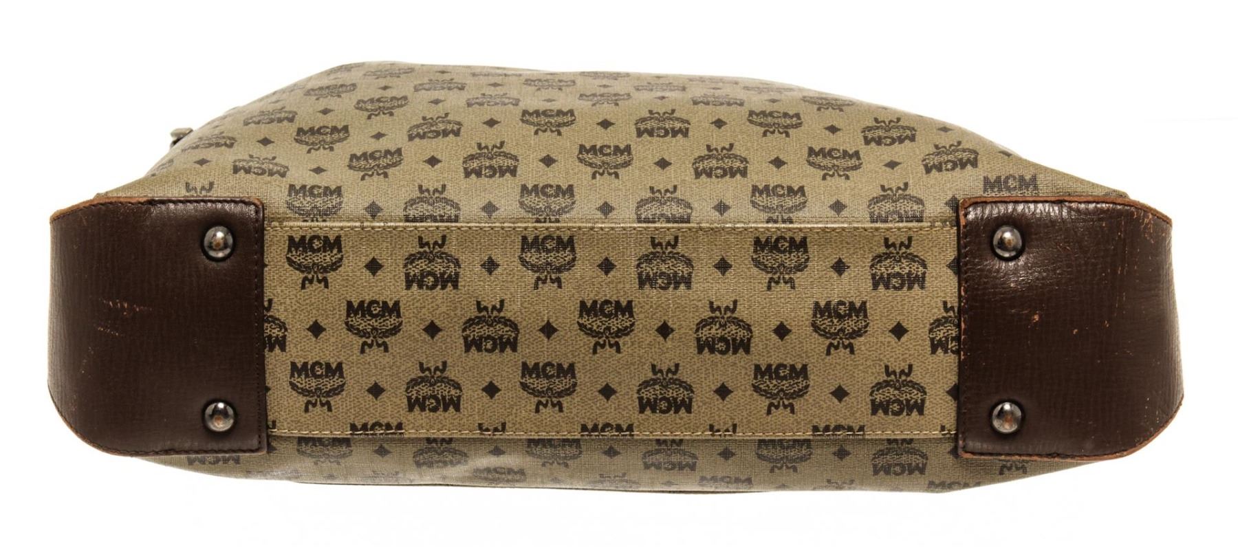 One MCM Brown Coated Canvas Crossbody Bag. Item is sold AS-IS. All available information is listed in the description and shown in the photo. MCM Brown Coated Canvas Crossbody Bag with Brown coated canvas crossbody bag with leather trim, silver-tone hardware, interior slip pockets; one with zip closure, adjustable shoulder strap, and top zipper closure. 10.5"L x 2.25"W x 10"H / 26.67 x 5.715 x 25.4 Cm