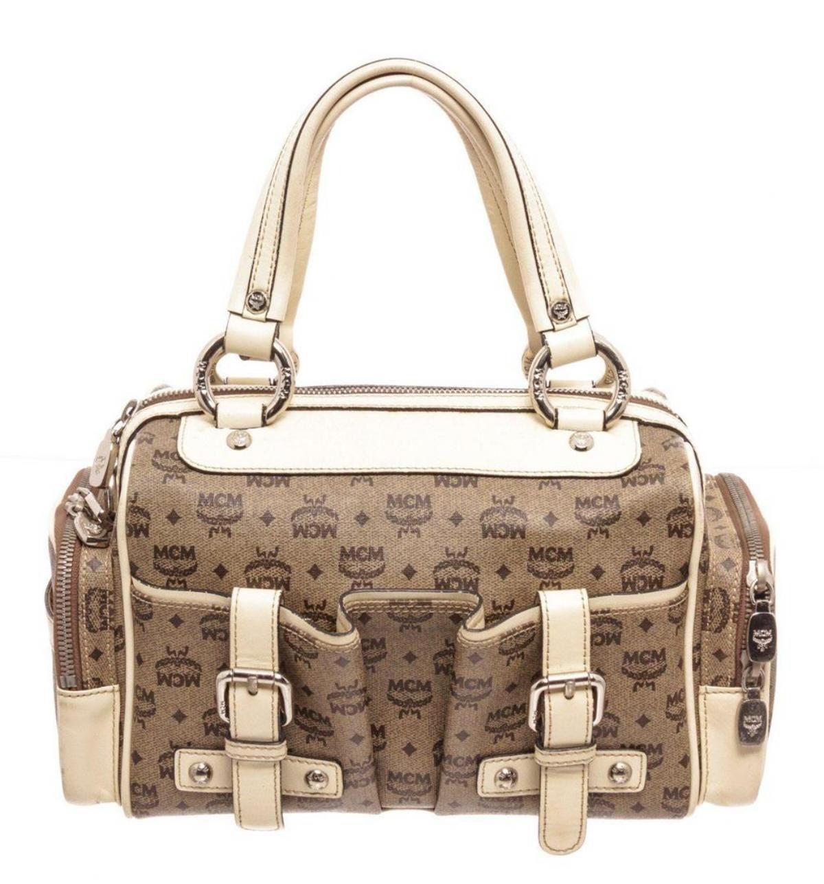 MCM Brown coated canvas Tote Bag with Silver-tone hardware, white leather trim, dual rolled top handles, two exterior slip pockets at front with buckle closure, one zip pocket at each side, brown canvas interior lining, one interior zip pocket and overall zipper closure at top. CONDITION: Pre-Owned Good overall, please see photographs for detail.