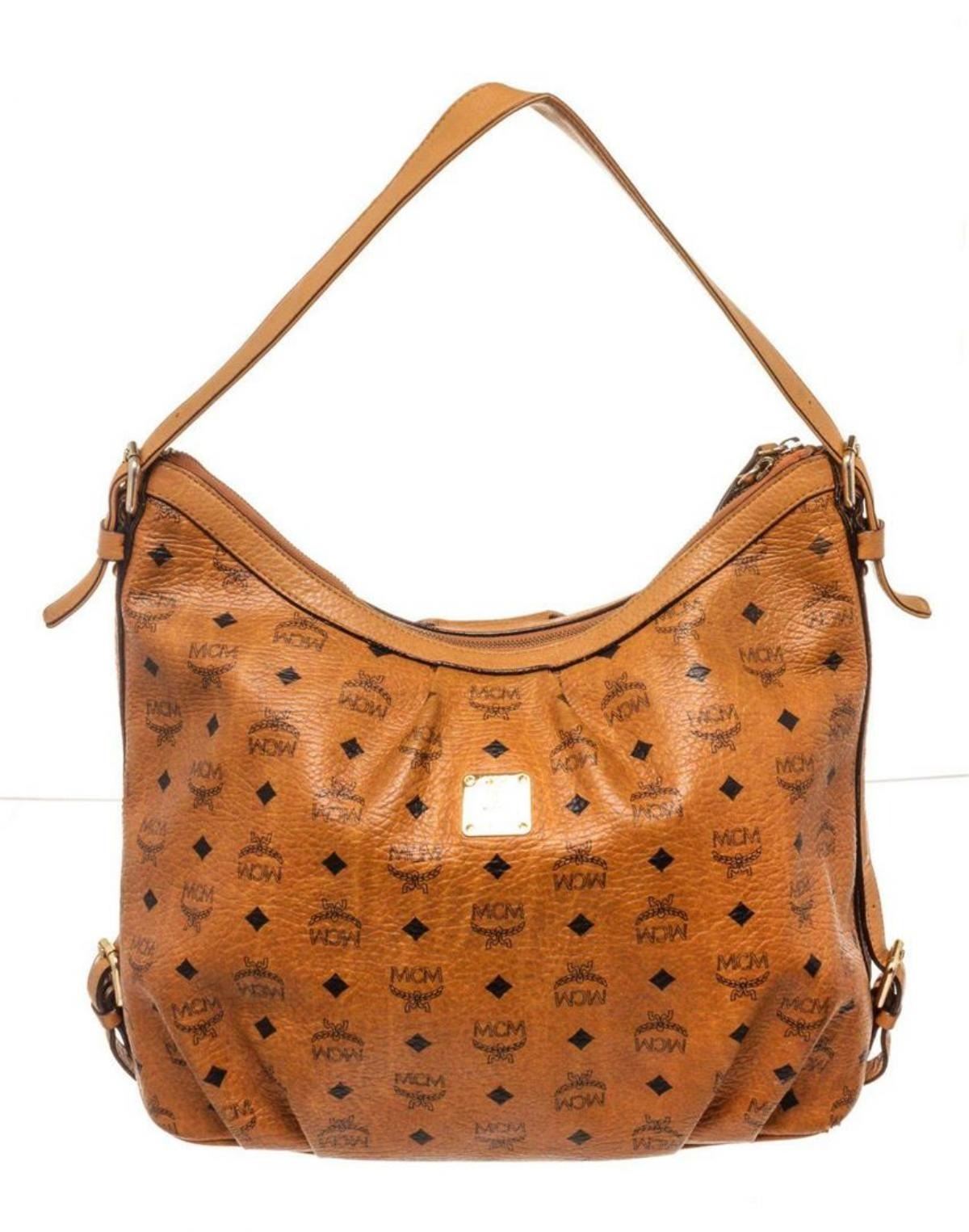 MCM Brown Visetos Coated Canvas Hobo Bag. MCM Brown Visetos Coated Canvas Hobo Bag with gold-tone hardware, trim visetos coated canvas, interior slip pocket, shoulder strap and zipper closure.