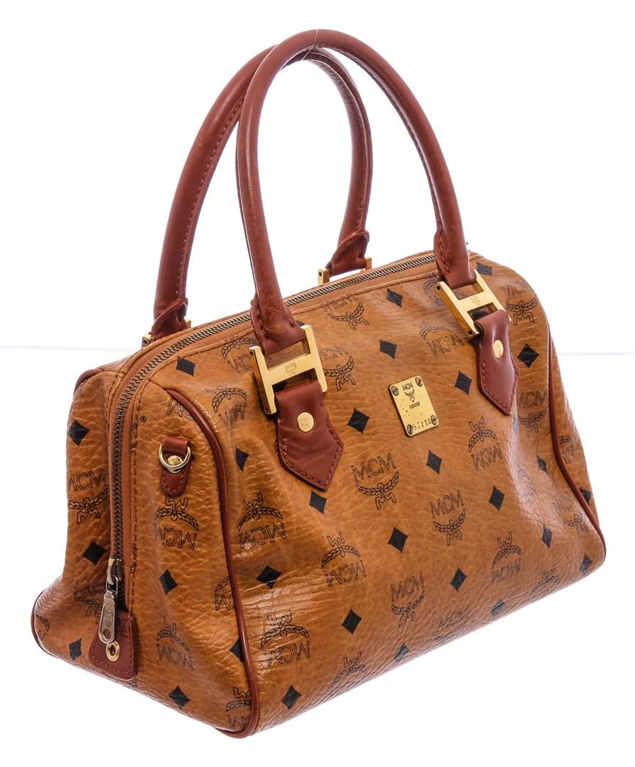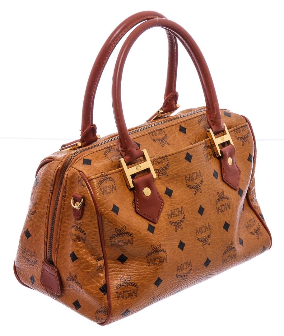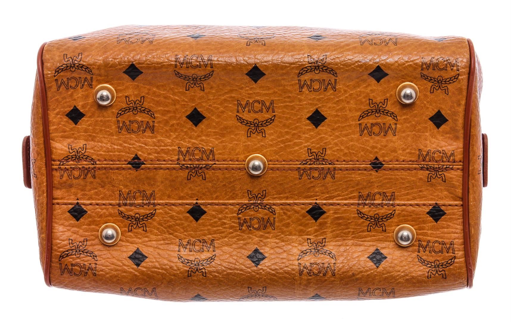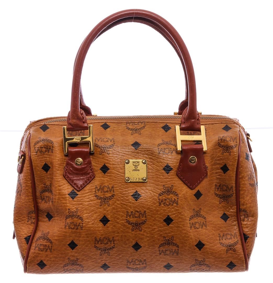One MCM Brown Visetos Leather Coated Canvas Boston Handle Bag. Brown and black Visetos coated canvas MCM Boston bag with gold-tone hardware, cinnamon leather trim, dual rolled leather top handles, logo placard at front face, single slit pocket at back, protective feet at base, orange monogram jacquard lining, dual pockets at interior walls; one with zip closure and zip closure at top.