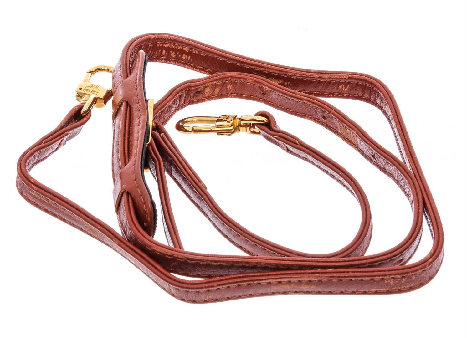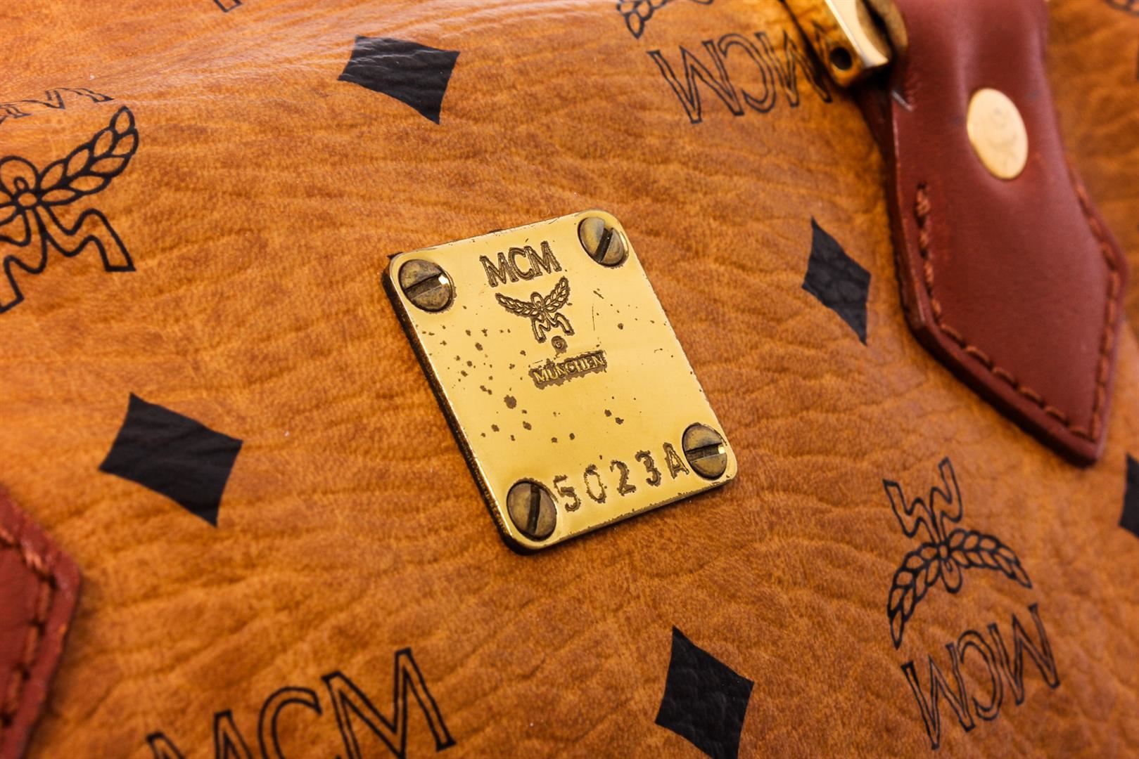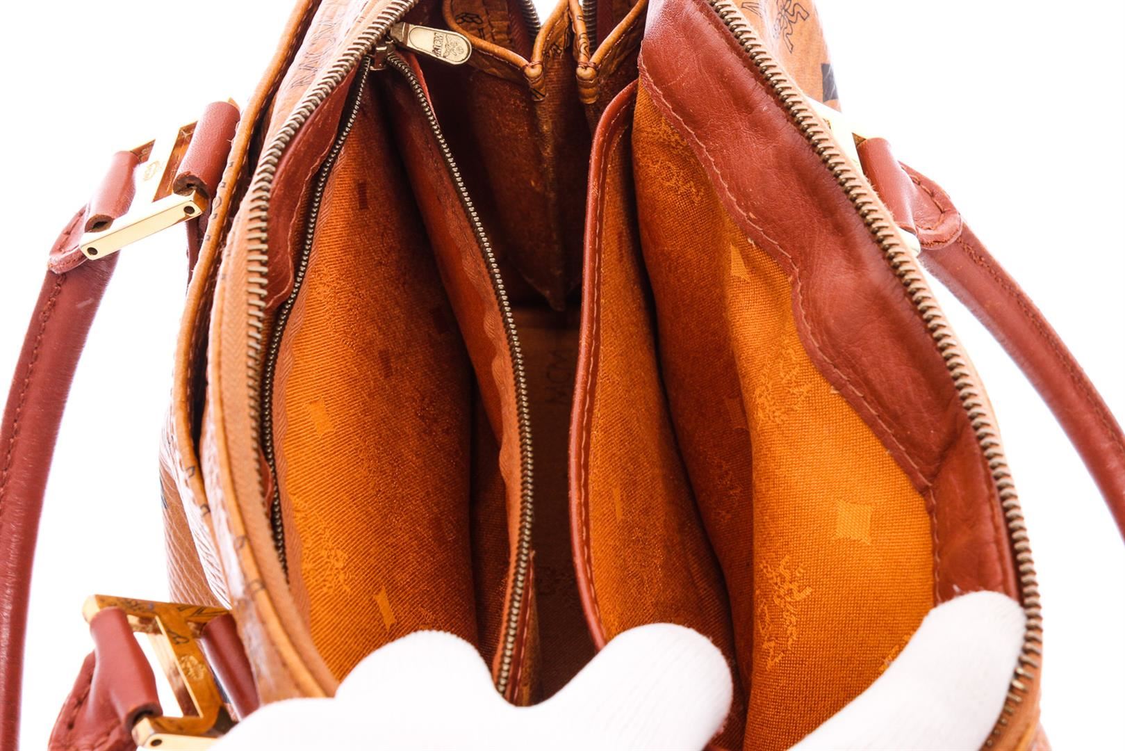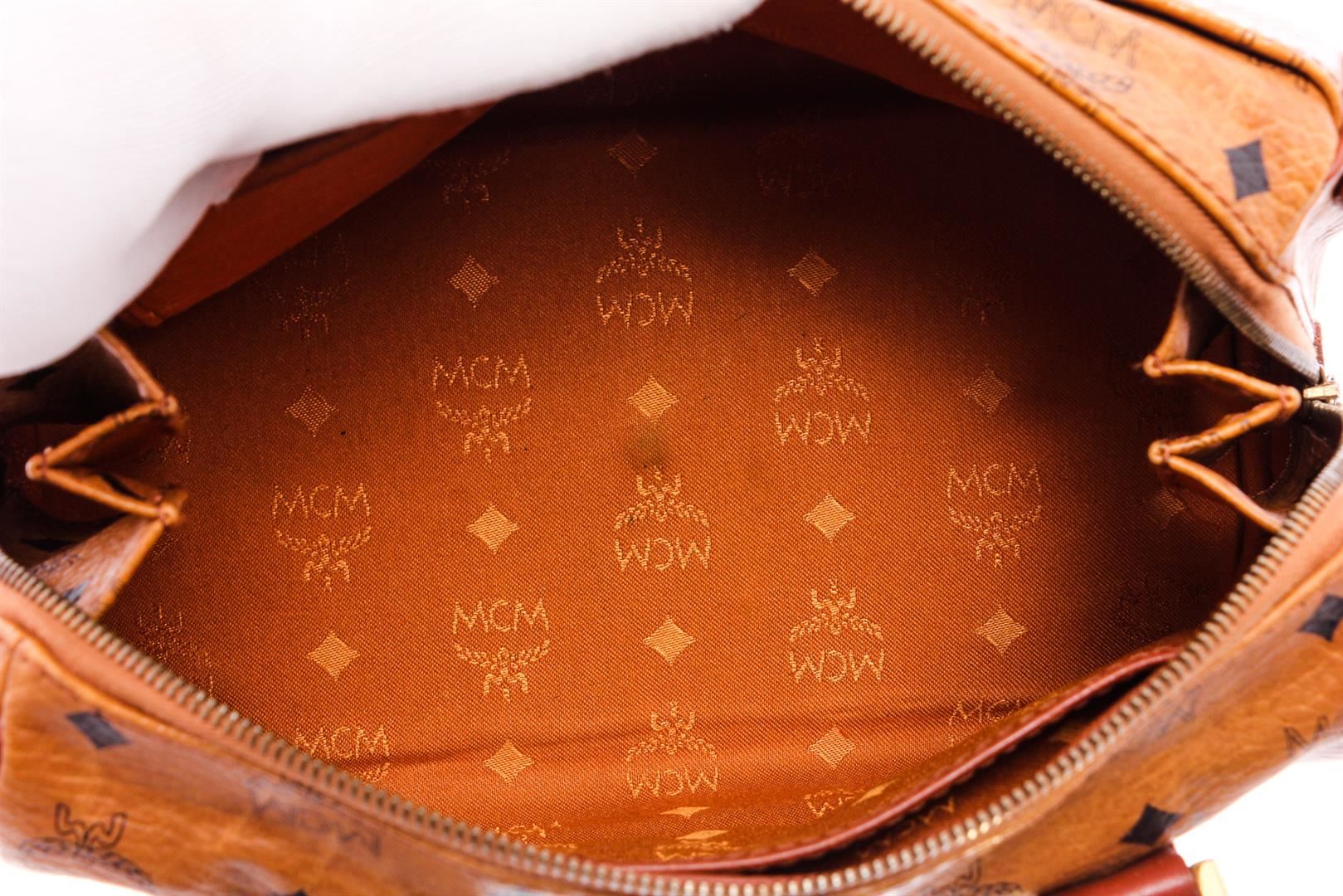 One MCM Brown Visetos Leather Coated Canvas Boston Handle Bag. Brown and black Visetos coated canvas MCM Boston bag with gold-tone hardware, cinnamon leather trim, dual rolled leather top handles, logo placard at front face, single slit pocket at back, protective feet at base, orange monogram jacquard lining, dual pockets at interior walls; one with zip closure and zip closure at top.