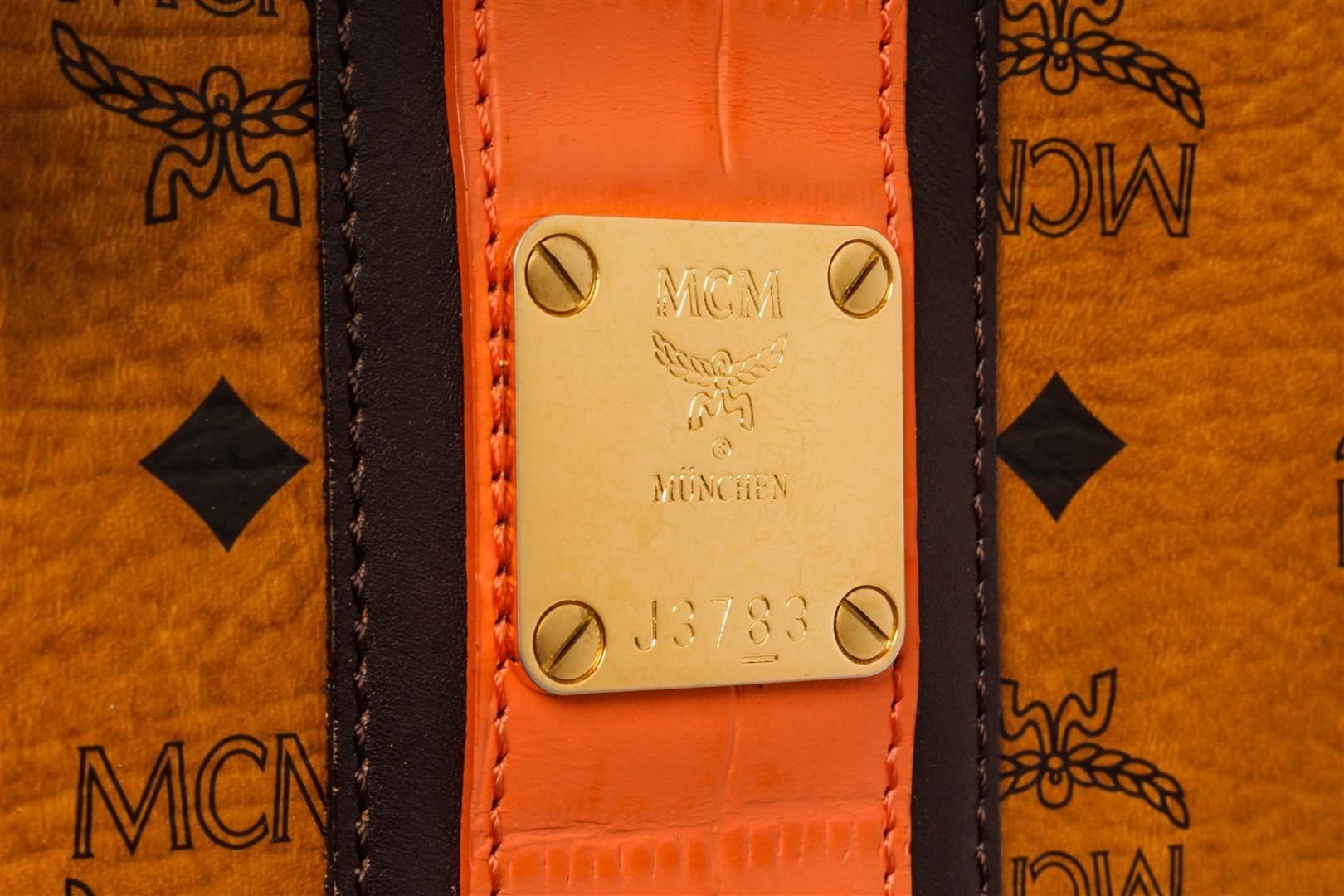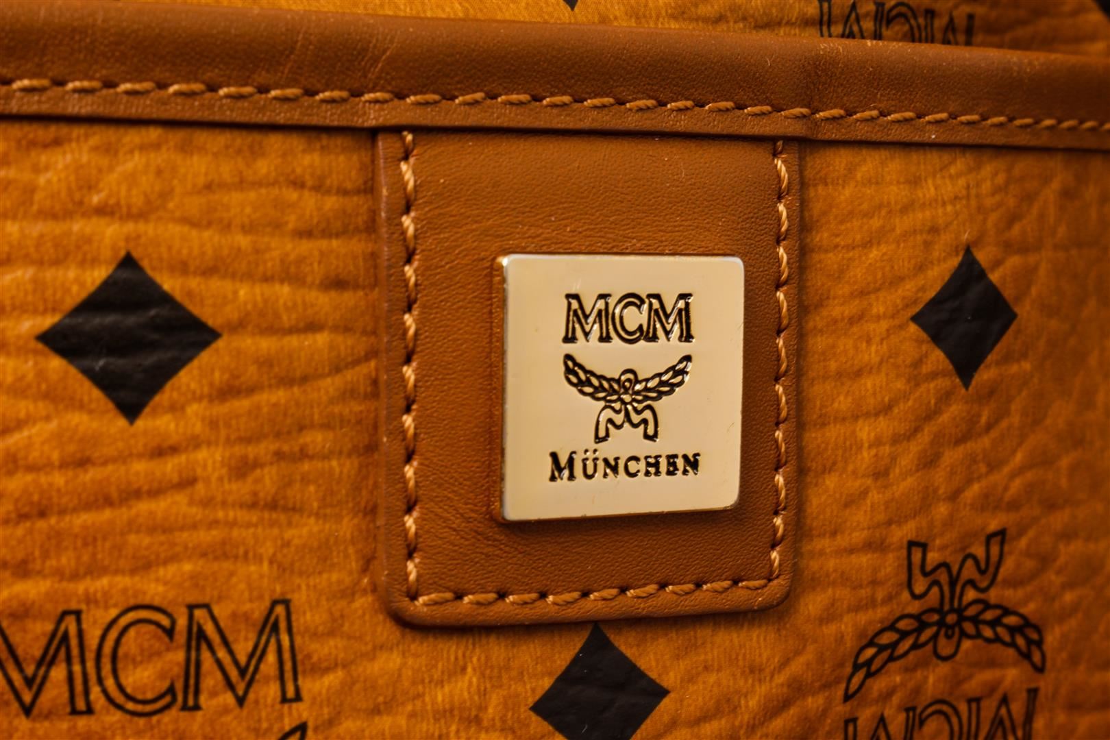 MCM Brown Visetos Leather-Trimmed Tote Bag. All available information is listed in the description and shown in the photos. MCM Brown Canvas Visetos Two Way Boston Bag with rolled leather top handles with polished gold hardware and an optional shoulder strap, The top zipper opens to a brown fabric interior with zipper and patch pockets. 86798 length: 12.00 in, Height: 8.50 in, Width: 6.50 in /30.48 x 21.59 x 16.51 CM