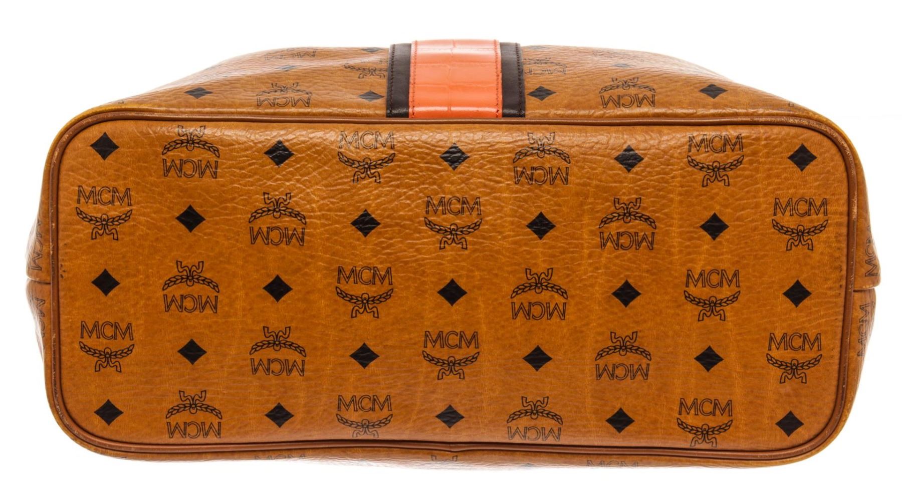 MCM Brown Visetos Leather-Trimmed Tote Bag. All available information is listed in the description and shown in the photos. MCM Brown Canvas Visetos Two Way Boston Bag with rolled leather top handles with polished gold hardware and an optional shoulder strap, The top zipper opens to a brown fabric interior with zipper and patch pockets. 86798 length: 12.00 in, Height: 8.50 in, Width: 6.50 in /30.48 x 21.59 x 16.51 CM
