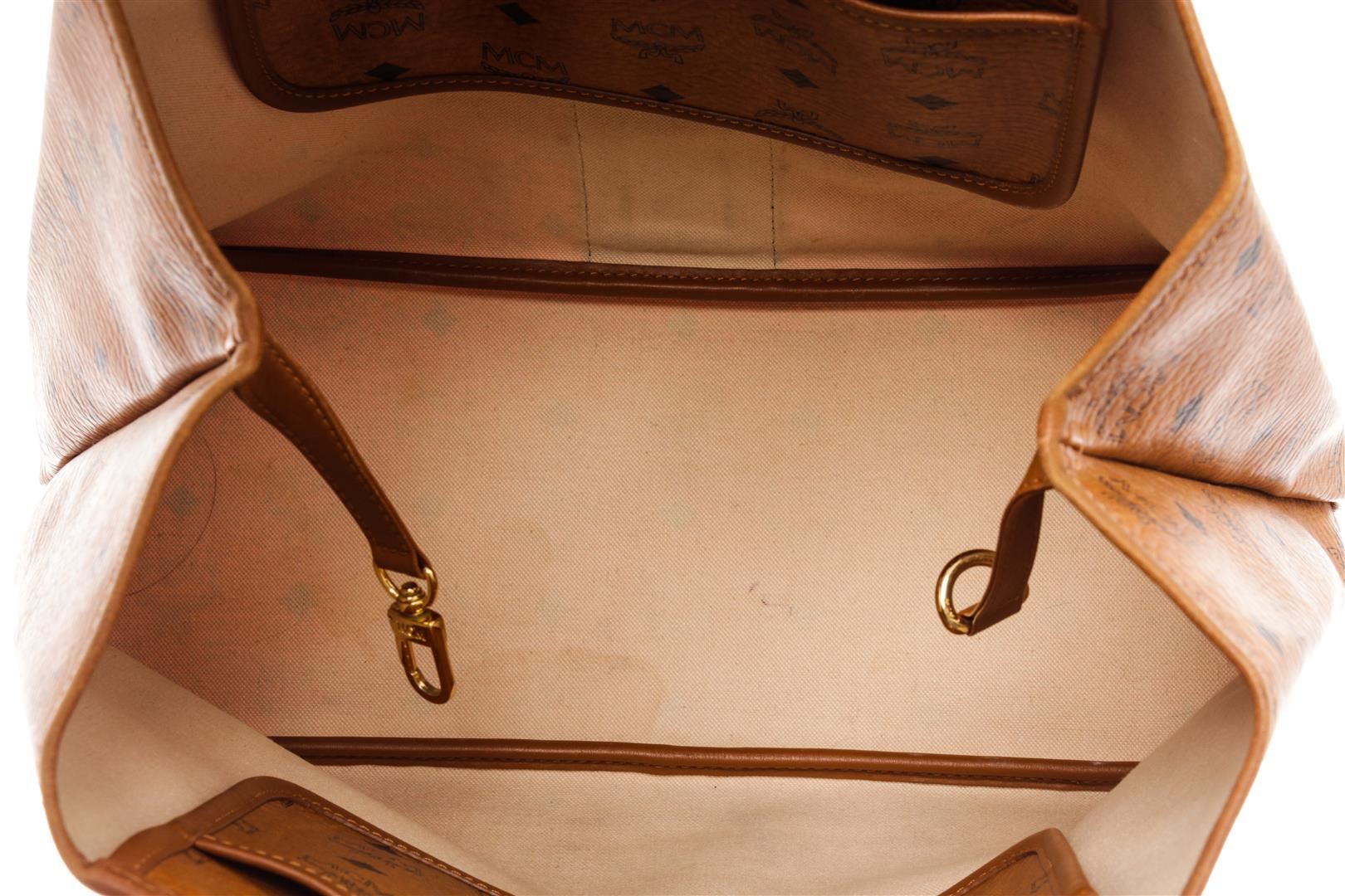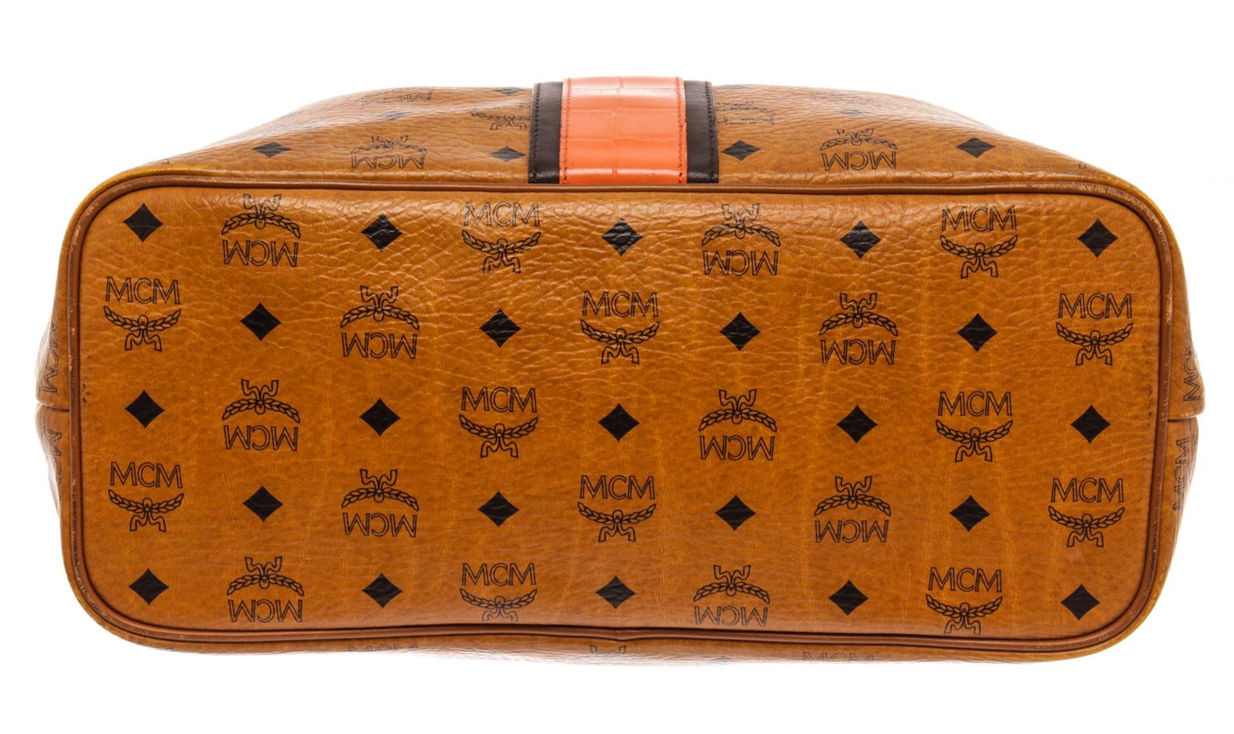 MCM Brown Visetos Leather-Trimmed Tote Bag. All available information is listed in the description and shown in the photos. MCM Brown Canvas Visetos Two Way Boston Bag with rolled leather top handles with polished gold hardware and an optional shoulder strap, The top zipper opens to a brown fabric interior with zipper and patch pockets. 86798 length: 12.00 in, Height: 8.50 in, Width: 6.50 in /30.48 x 21.59 x 16.51 CM