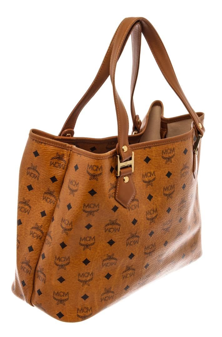 MCM Brown Visetos Leather-Trimmed Tote Bag. All available information is listed in the description and shown in the photos. MCM Brown Canvas Visetos Two Way Boston Bag with rolled leather top handles with polished gold hardware and an optional shoulder strap, The top zipper opens to a brown fabric interior with zipper and patch pockets. 86798 length: 12.00 in, Height: 8.50 in, Width: 6.50 in /30.48 x 21.59 x 16.51 CM