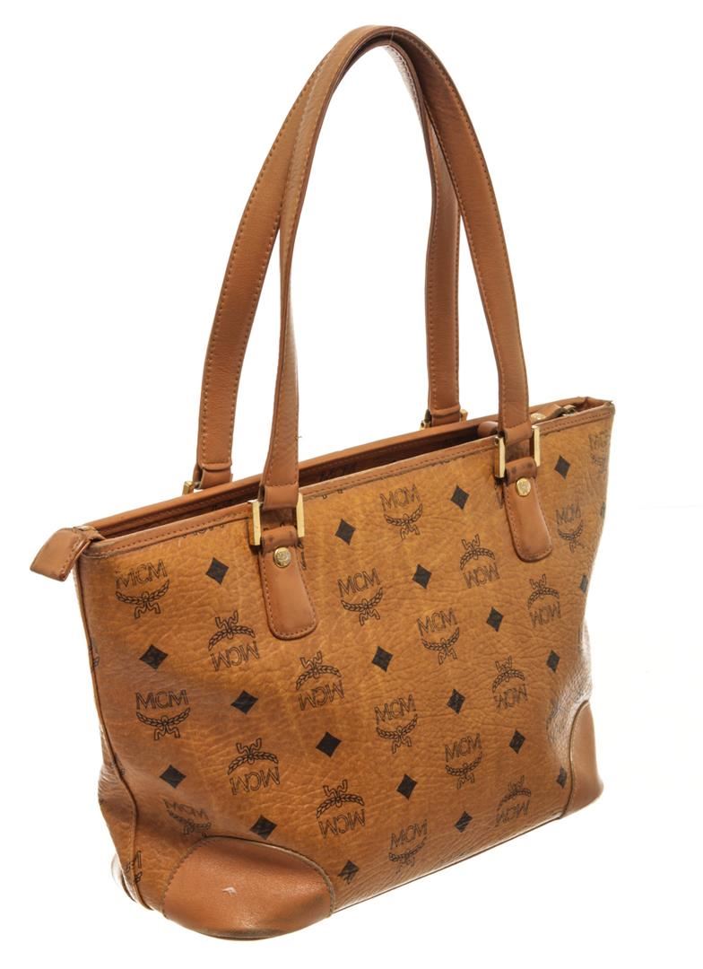 One MCM Camel Leather Shoulder Bag. Item is sold AS-IS. All available information is listed in the description and shown in the photo. MCM Camel Leather Shoulder Bag with shoulder strap, two interior slip pockets/one interior zipper pocket, fabric lining, gold-tone hardware, zipper closure. There are some marks on the bottom of the bag, stains on the interior lining. Please refer to photos. W 38 cm x H 30 cm x L 16 cm / 14.96" x 11.81" x 6.29" Inches