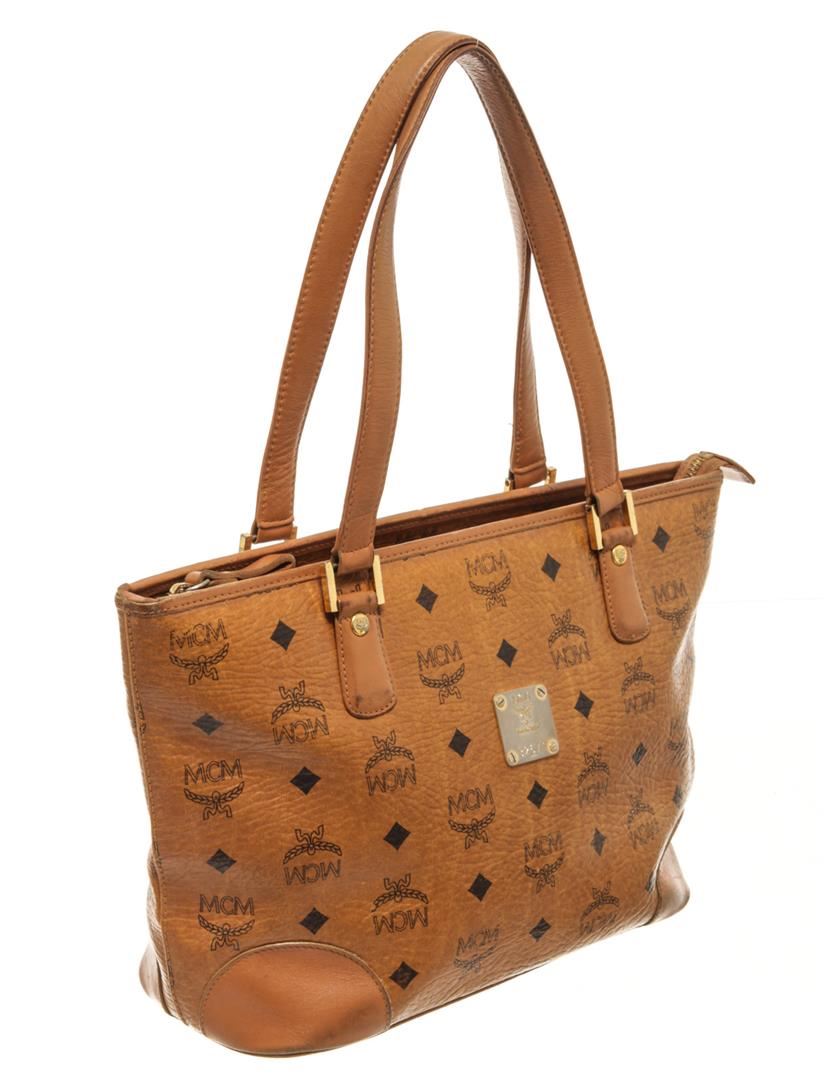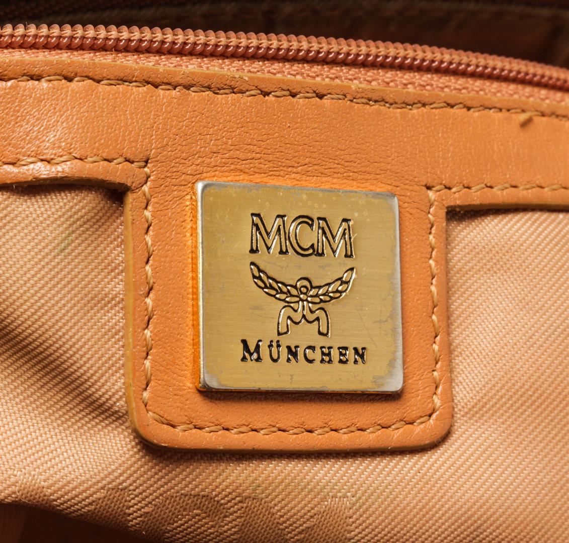 One MCM Camel Leather Shoulder Bag. Item is sold AS-IS. All available information is listed in the description and shown in the photo. MCM Camel Leather Shoulder Bag with shoulder strap, two interior slip pockets/one interior zipper pocket, fabric lining, gold-tone hardware, zipper closure. There are some marks on the bottom of the bag, stains on the interior lining. Please refer to photos. W 38 cm x H 30 cm x L 16 cm / 14.96" x 11.81" x 6.29" Inches
