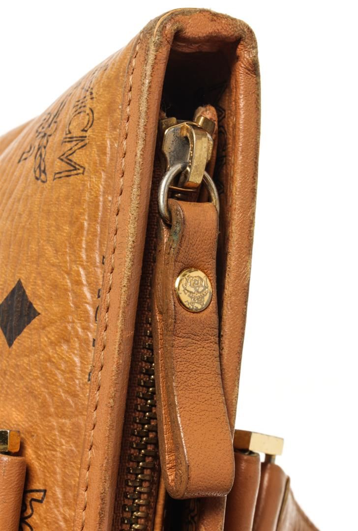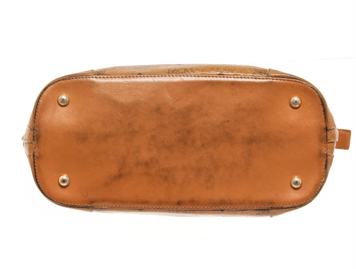 One MCM Camel Leather Shoulder Bag. Item is sold AS-IS. All available information is listed in the description and shown in the photo. MCM Camel Leather Shoulder Bag with shoulder strap, two interior slip pockets/one interior zipper pocket, fabric lining, gold-tone hardware, zipper closure. There are some marks on the bottom of the bag, stains on the interior lining. Please refer to photos. W 38 cm x H 30 cm x L 16 cm / 14.96" x 11.81" x 6.29" Inches