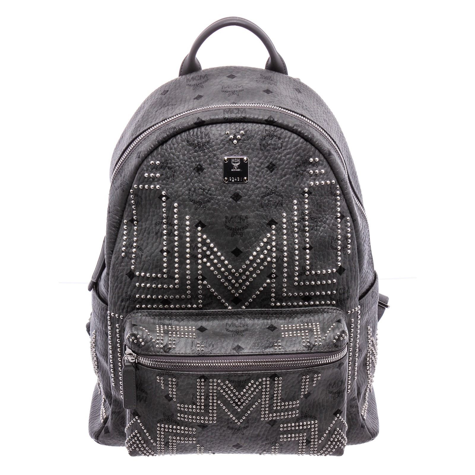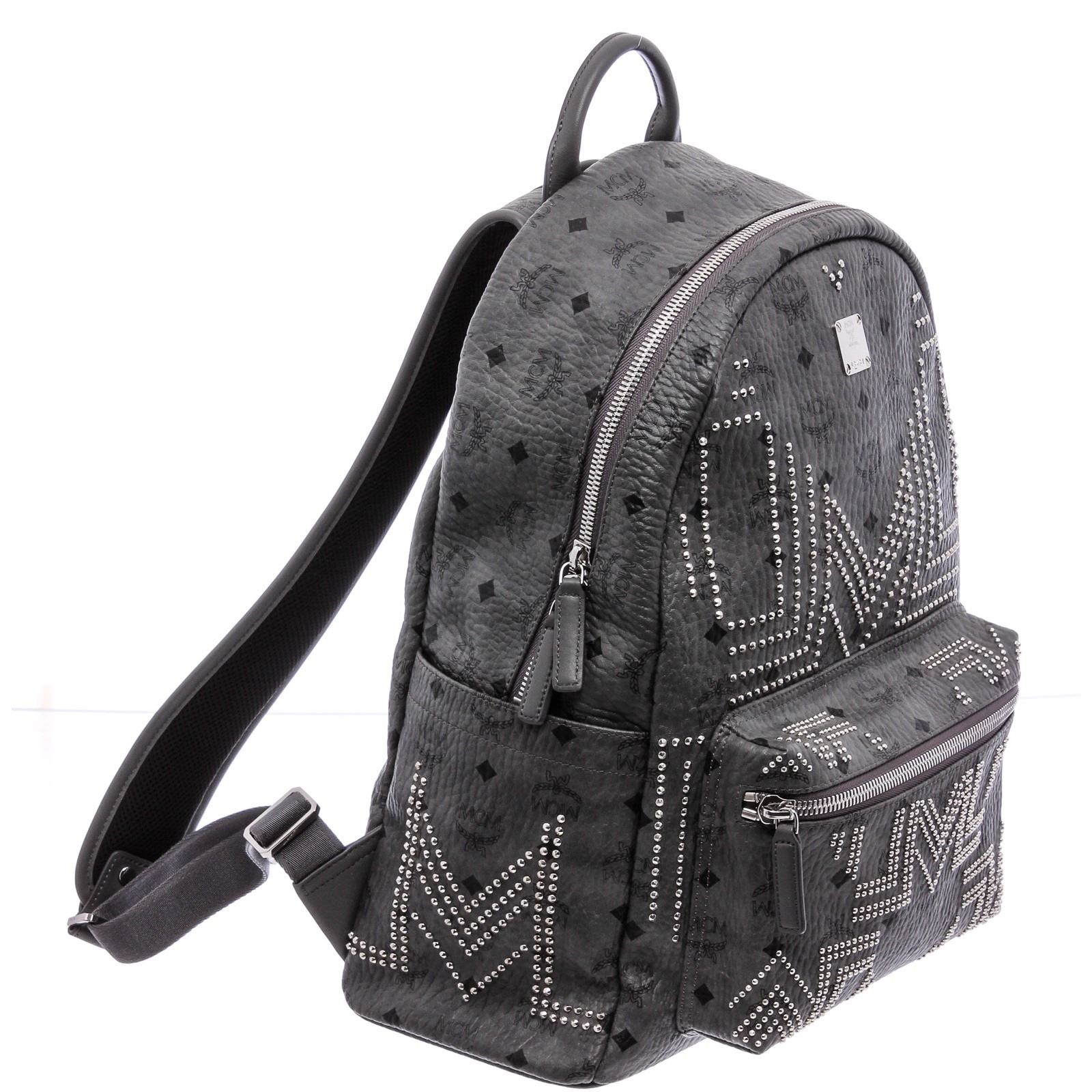 Style: MCM Gray Visetos Canvas Leather Medium Studded Backpack