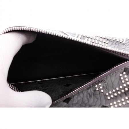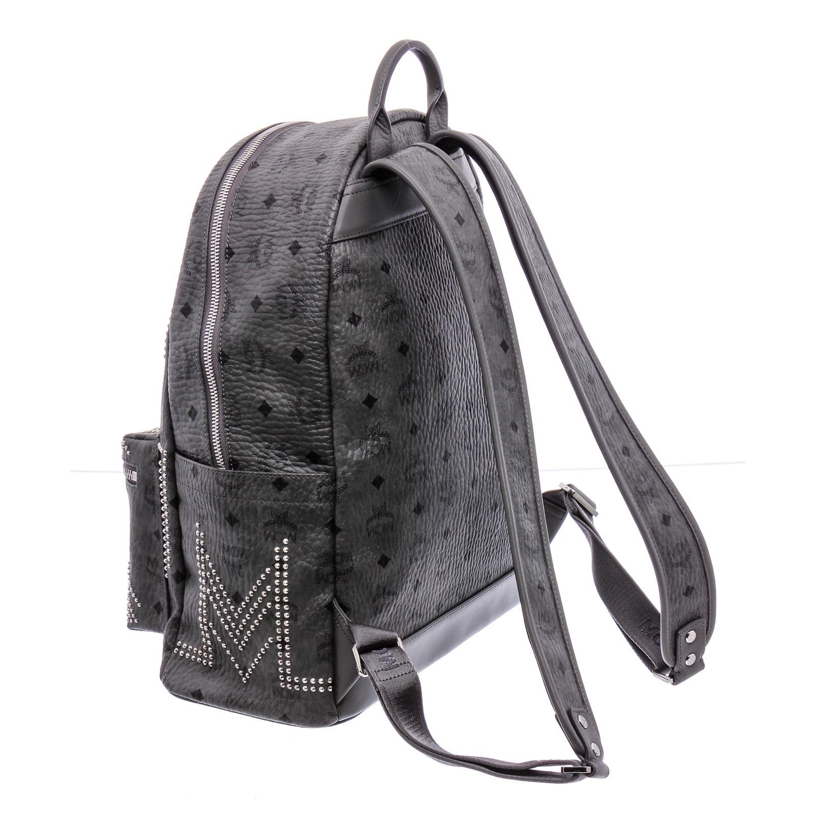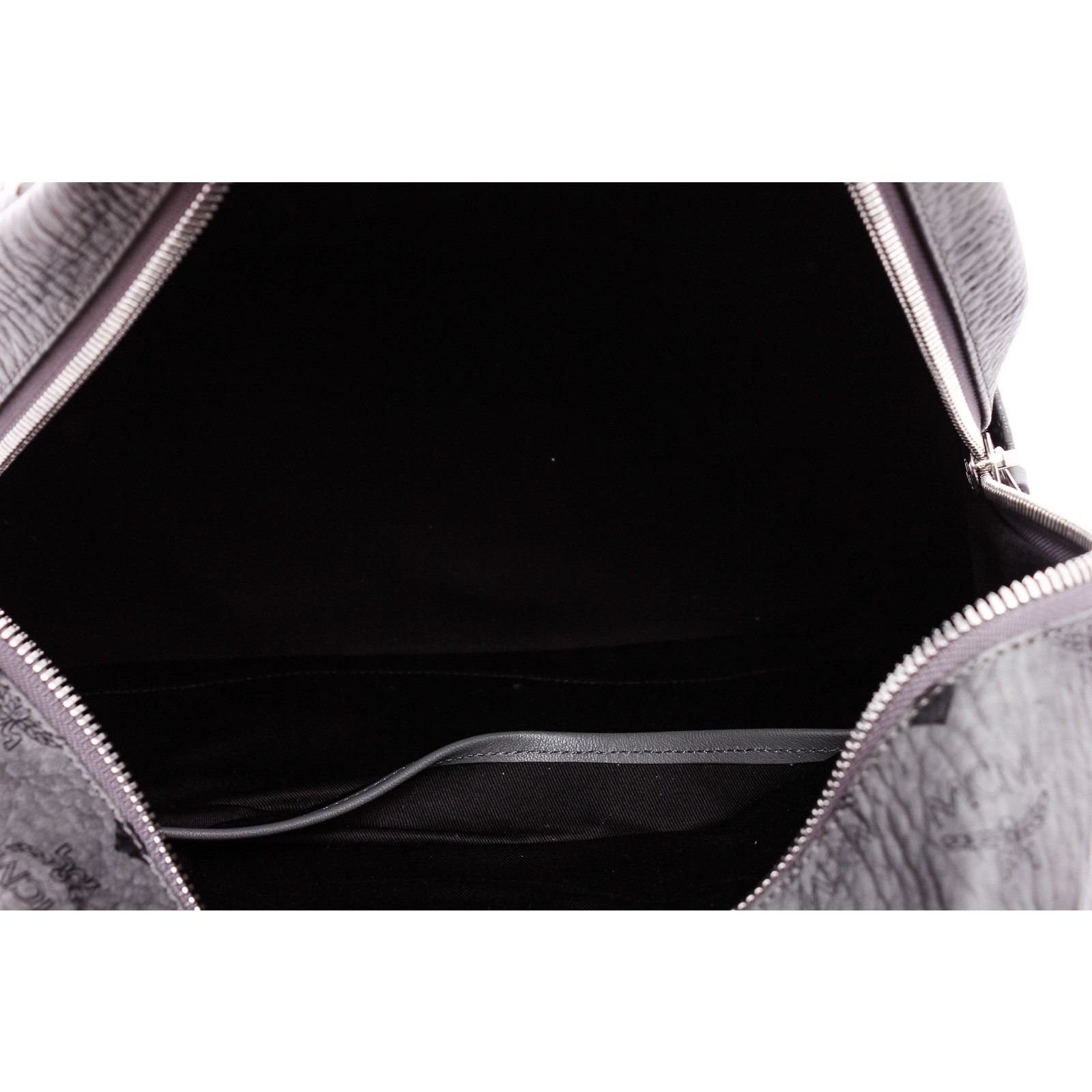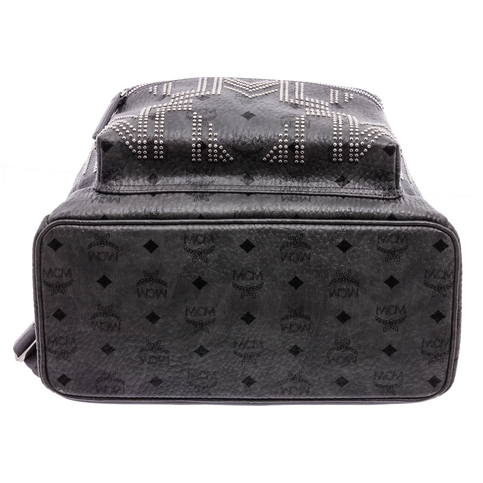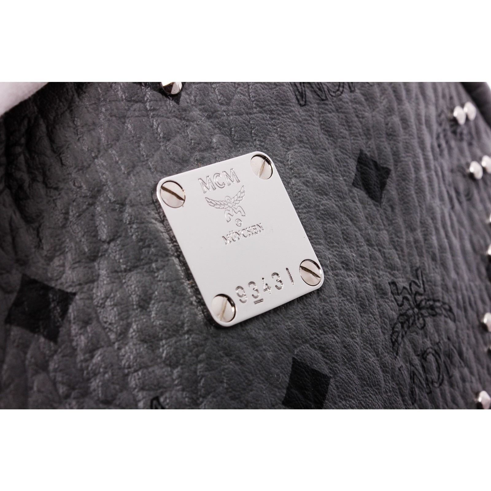 Gray and Black Visetos canvas leather MCM Medium studded backpack with silver-tone hardware, black cloth interior lining, two interior slip pockets and two-way zipper closure at top.