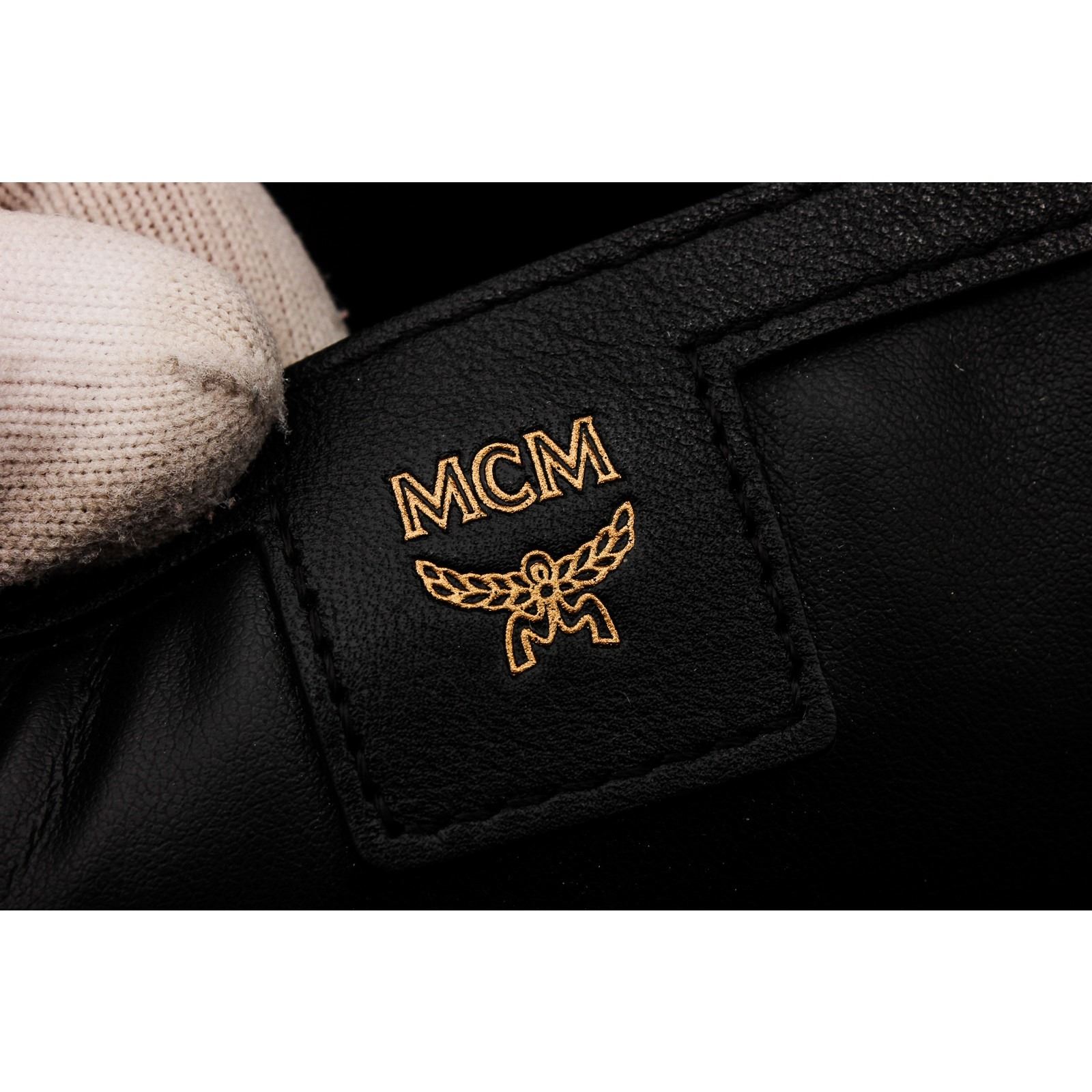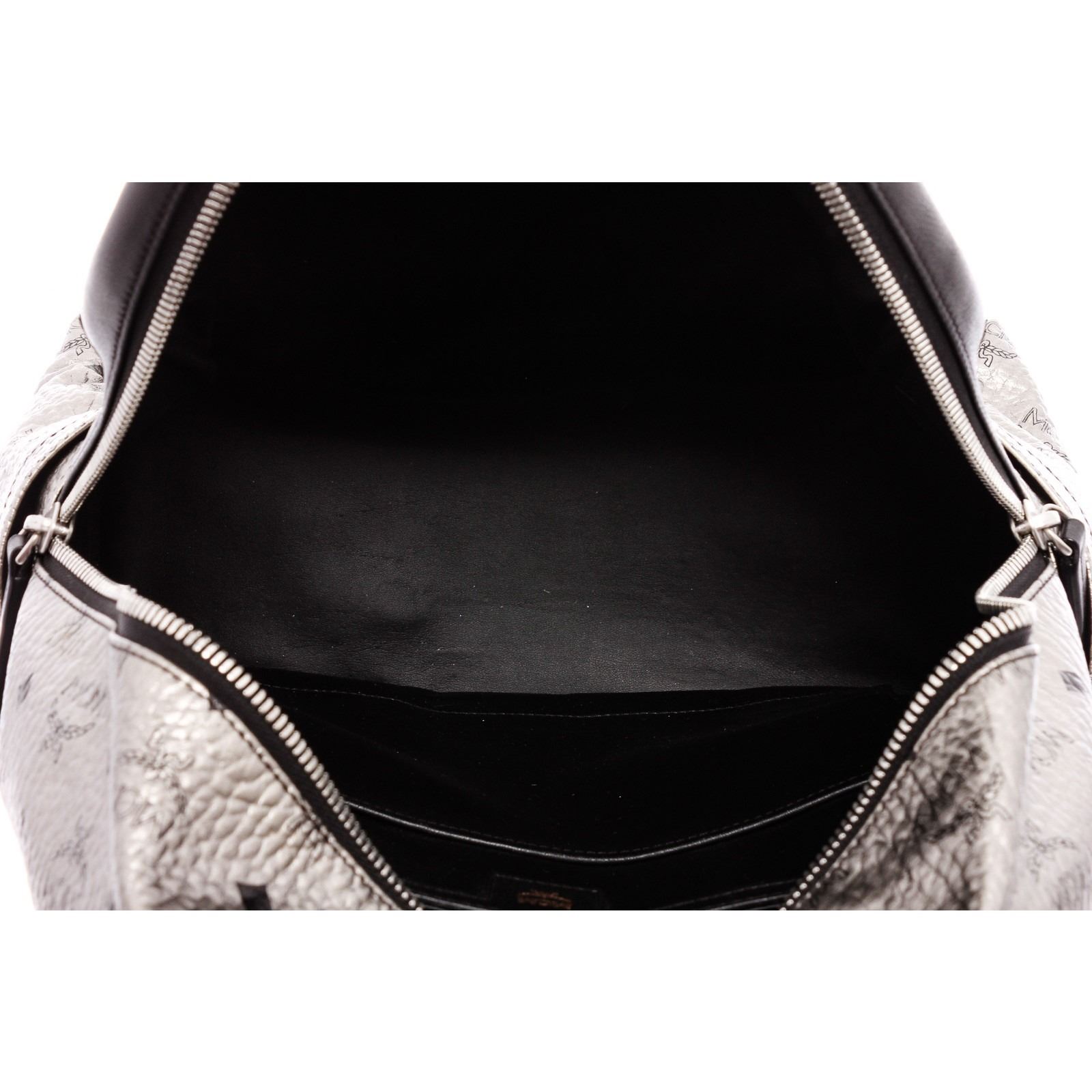 Metallic Silver and Black Visetos coated canvas MCM Stark backpack with multi-tonal hardware, dual adjustable flat shoulder straps, single flat top handle, three exterior pockets; one with zip closure, stud embellishments at front face, black leather lining, dual slip pockets at interior wall, single media compartment and two-way zip-around closure at top.