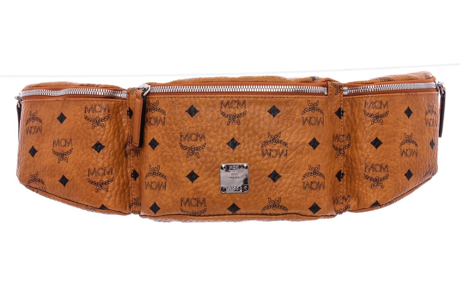 Cognac MCM visetos coated canvas Large Jemison sling bag with silver-tone hardware, debossed metal plate at front, three exterior zip pockets; one with slip pocket, brown fabric lining and adjustable logo belt strap.