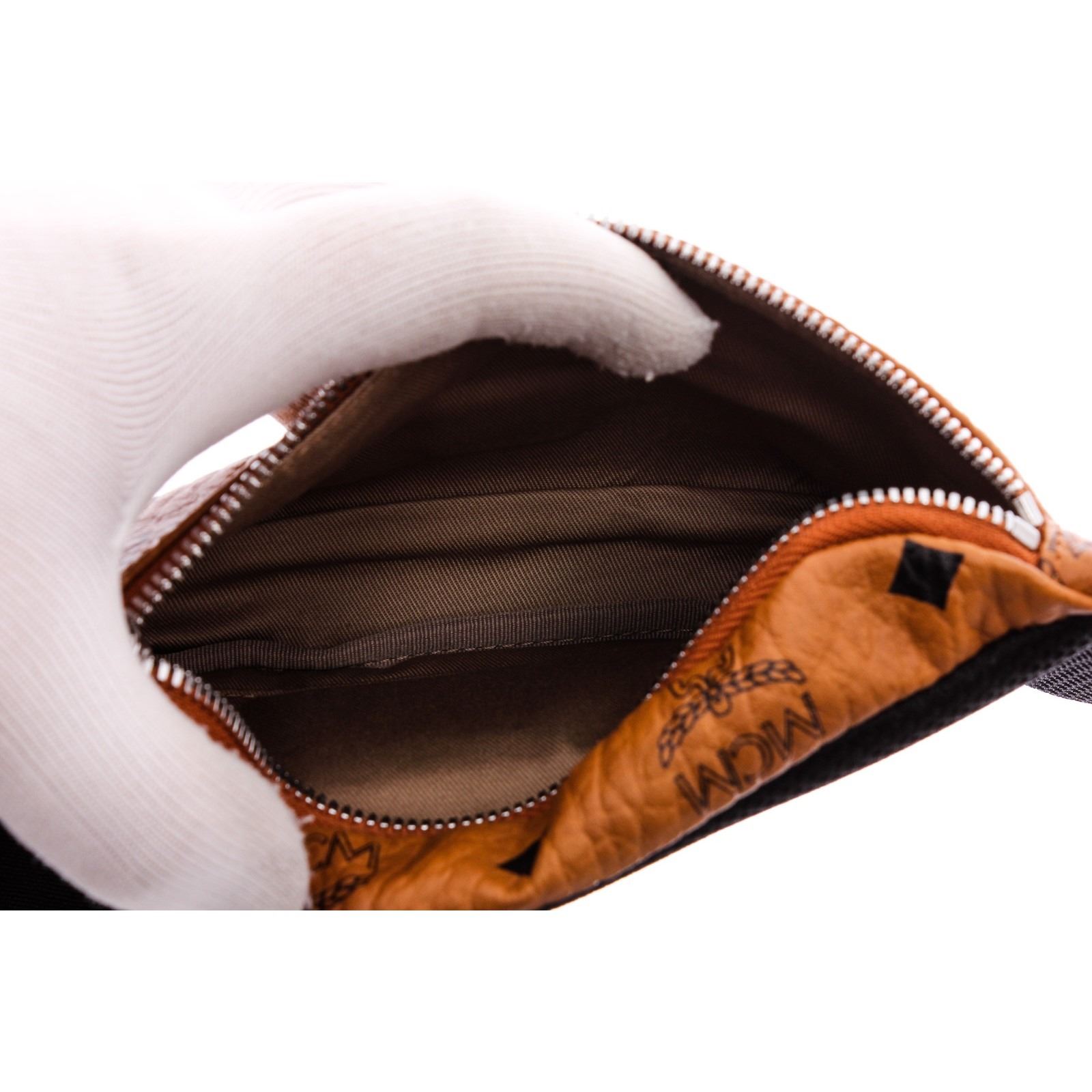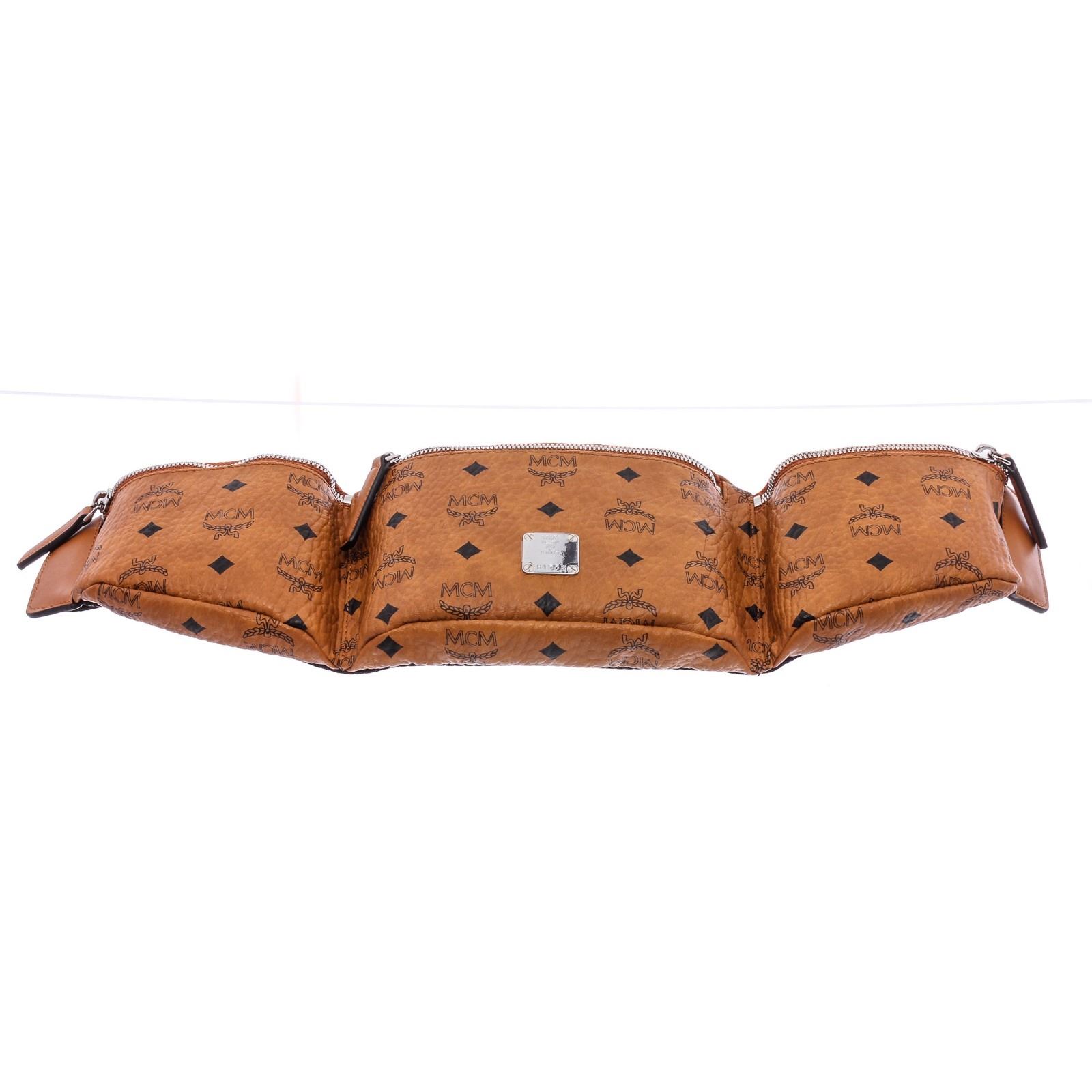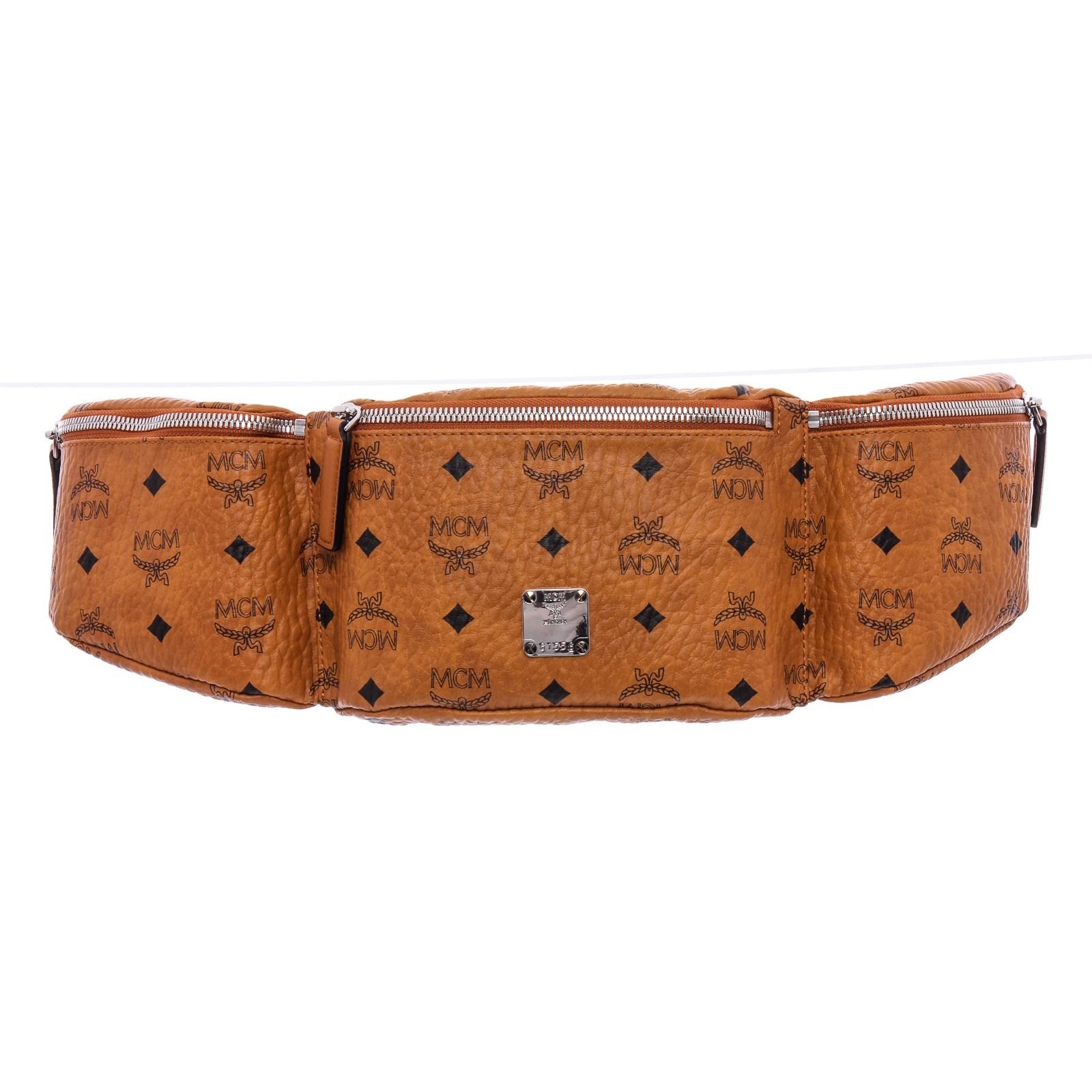 Cognac MCM visetos coated canvas Large Jemison sling bag with silver-tone hardware, debossed metal plate at front, three exterior zip pockets; one with slip pocket, brown fabric lining and adjustable logo belt strap.