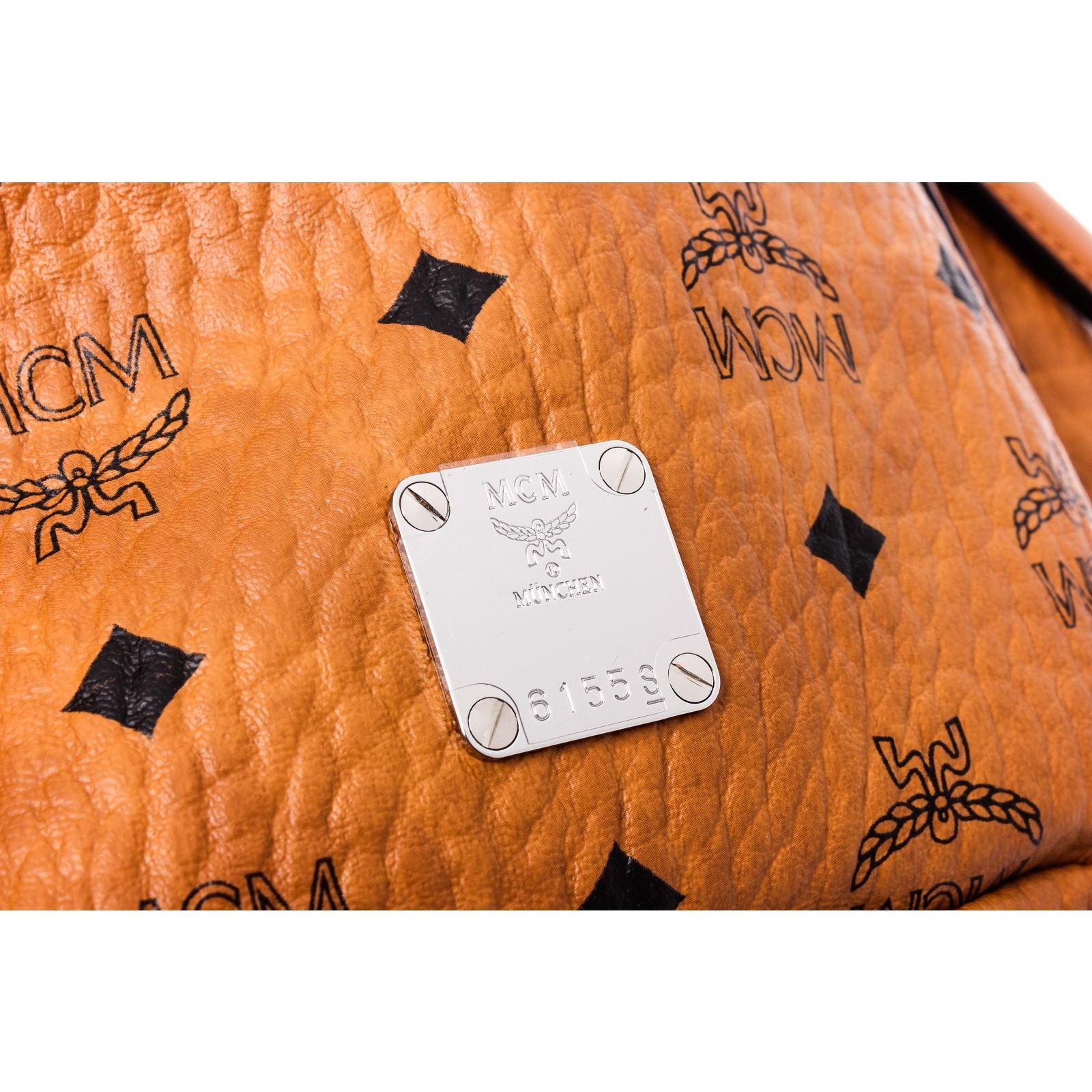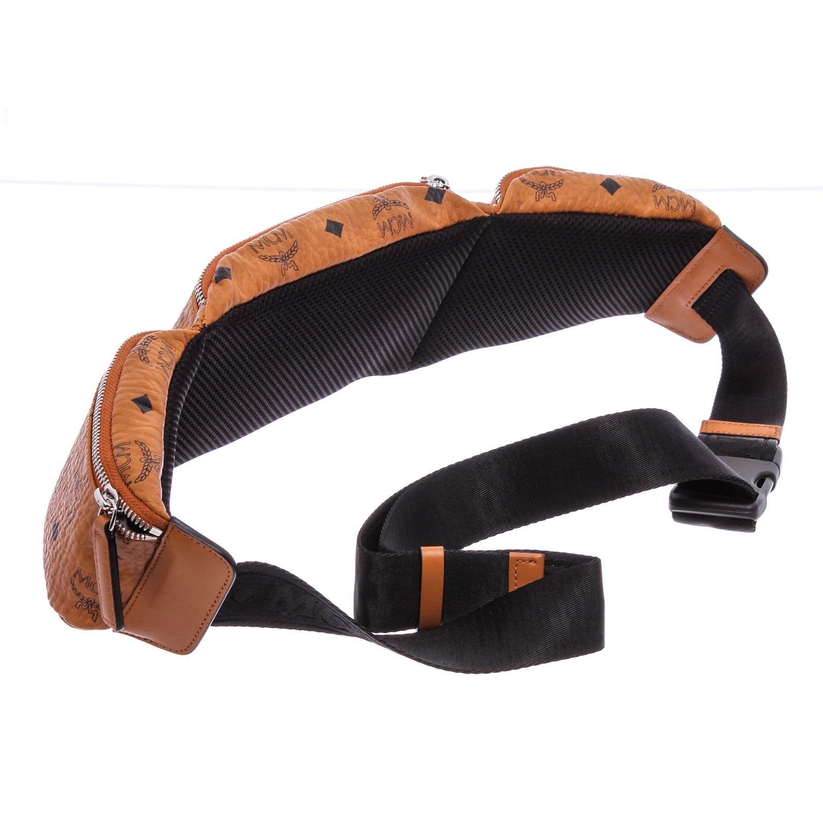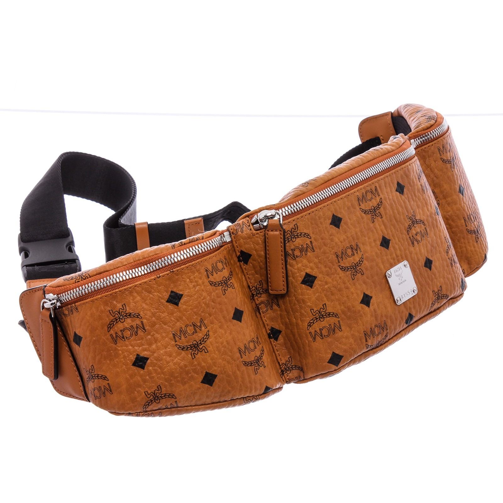 Cognac MCM visetos coated canvas Large Jemison sling bag with silver-tone hardware, debossed metal plate at front, three exterior zip pockets; one with slip pocket, brown fabric lining and adjustable logo belt strap.