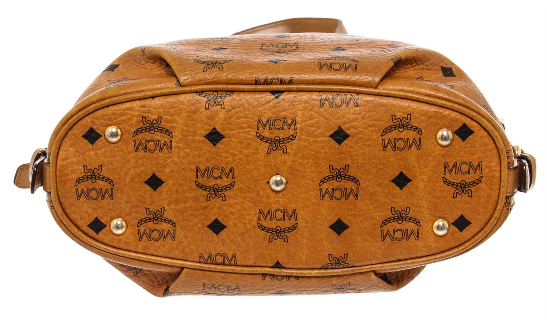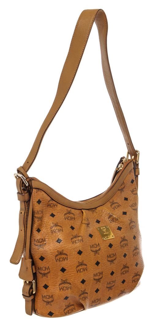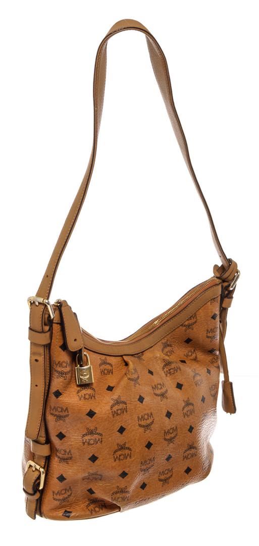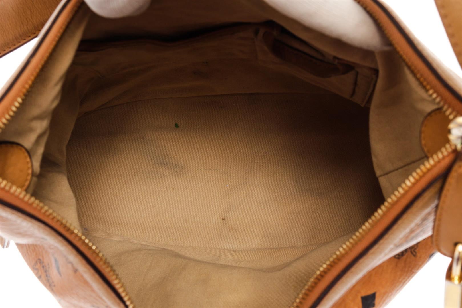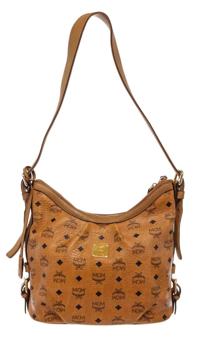 MCM hobo bag features cognac Monogram Visetos coated canvas, gold-tone hardware, single shoulder strap, beige canvas lining three interior pockets, zip closure at top and protective feet at base. Height 11", Width: 13.5", Depth: 6", Shoulder St