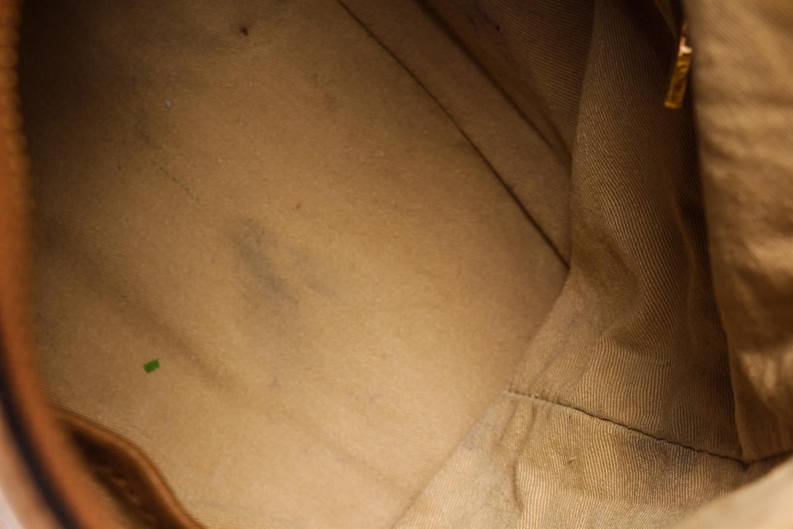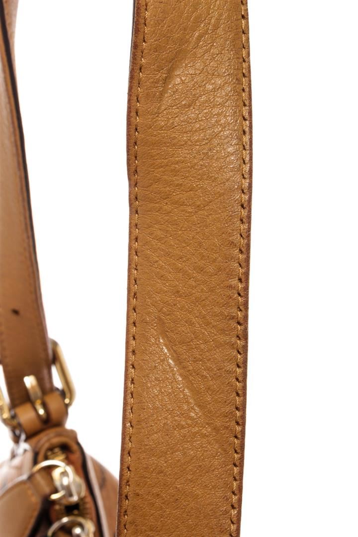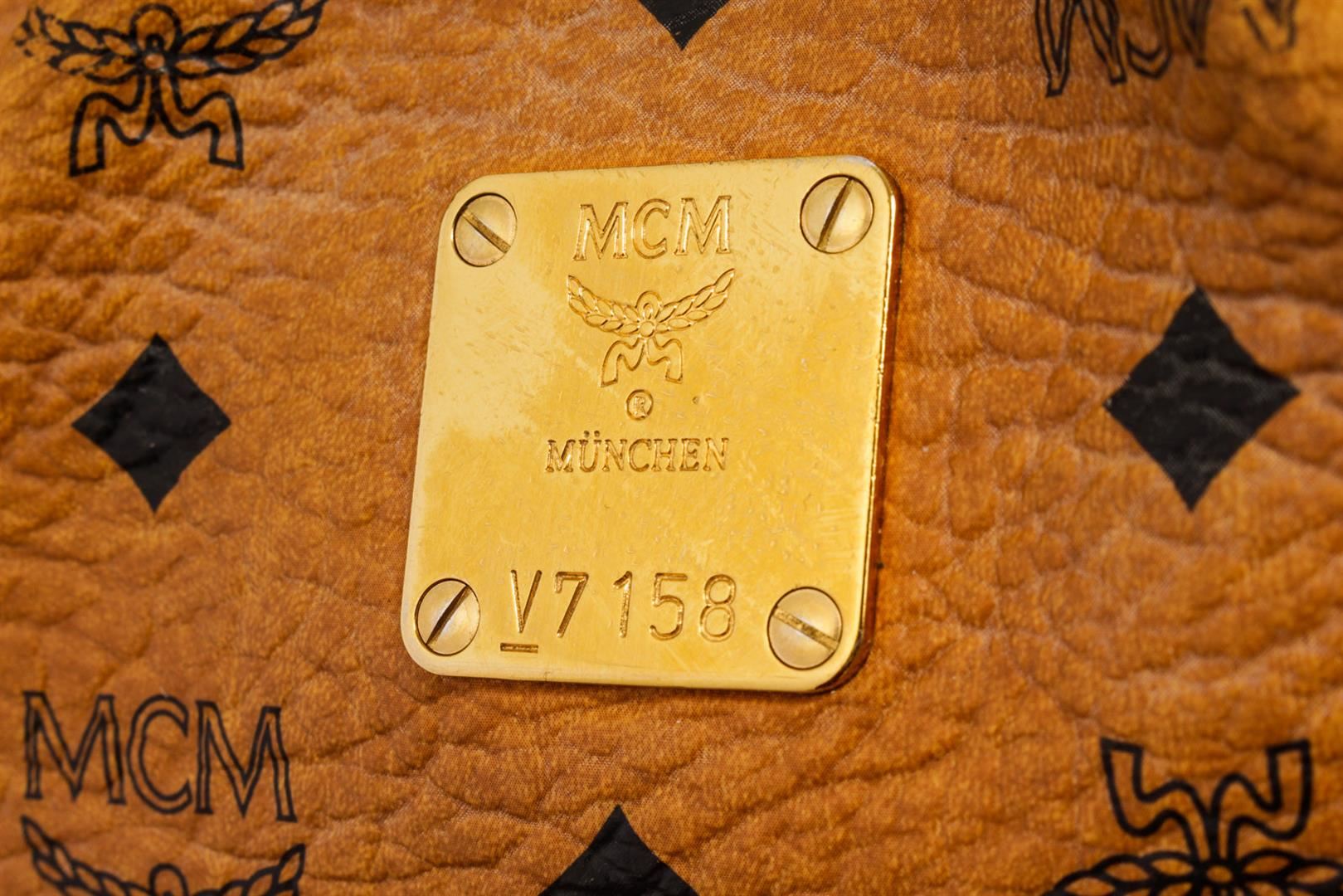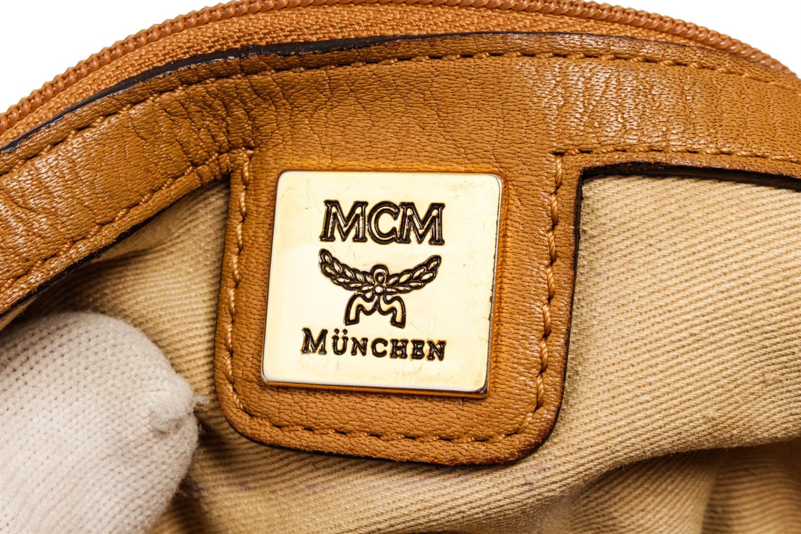 MCM hobo bag features cognac Monogram Visetos coated canvas, gold-tone hardware, single shoulder strap, beige canvas lining three interior pockets, zip closure at top and protective feet at base. Height 11", Width: 13.5", Depth: 6", Shoulder St