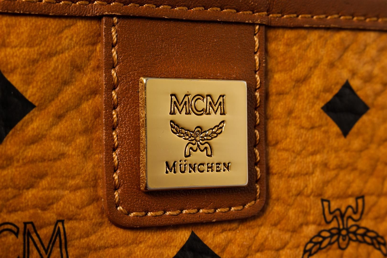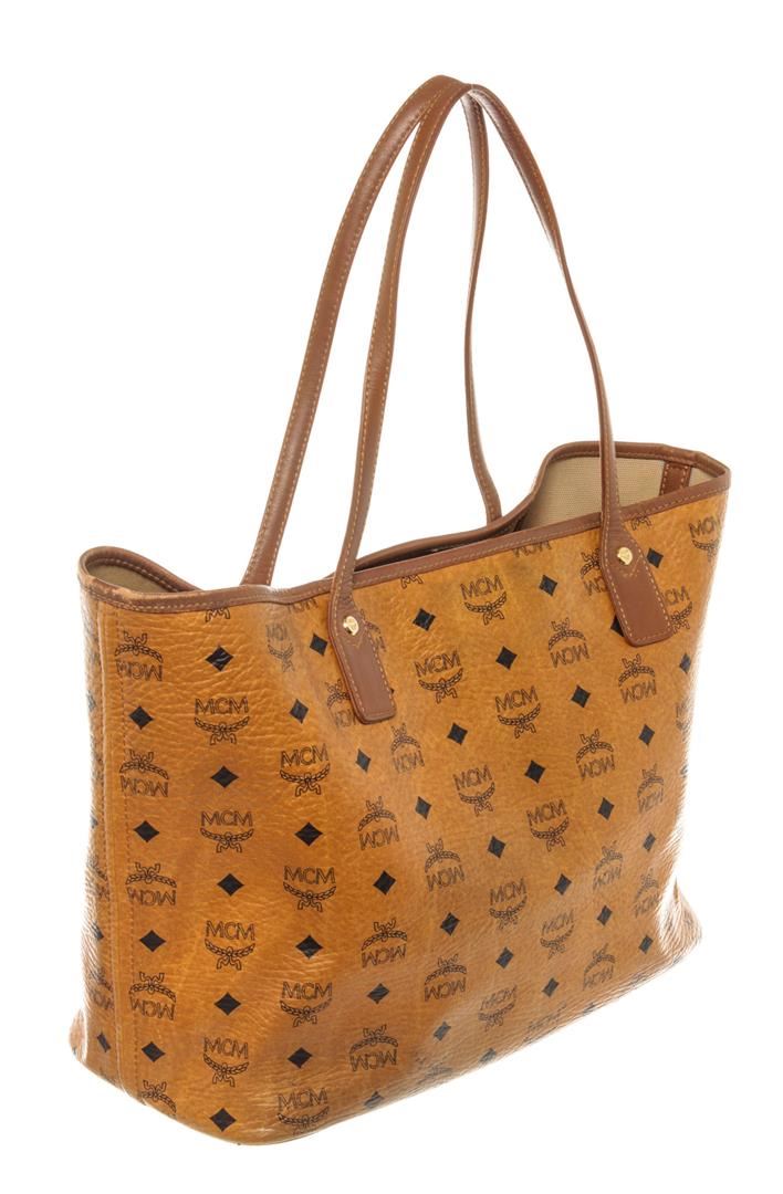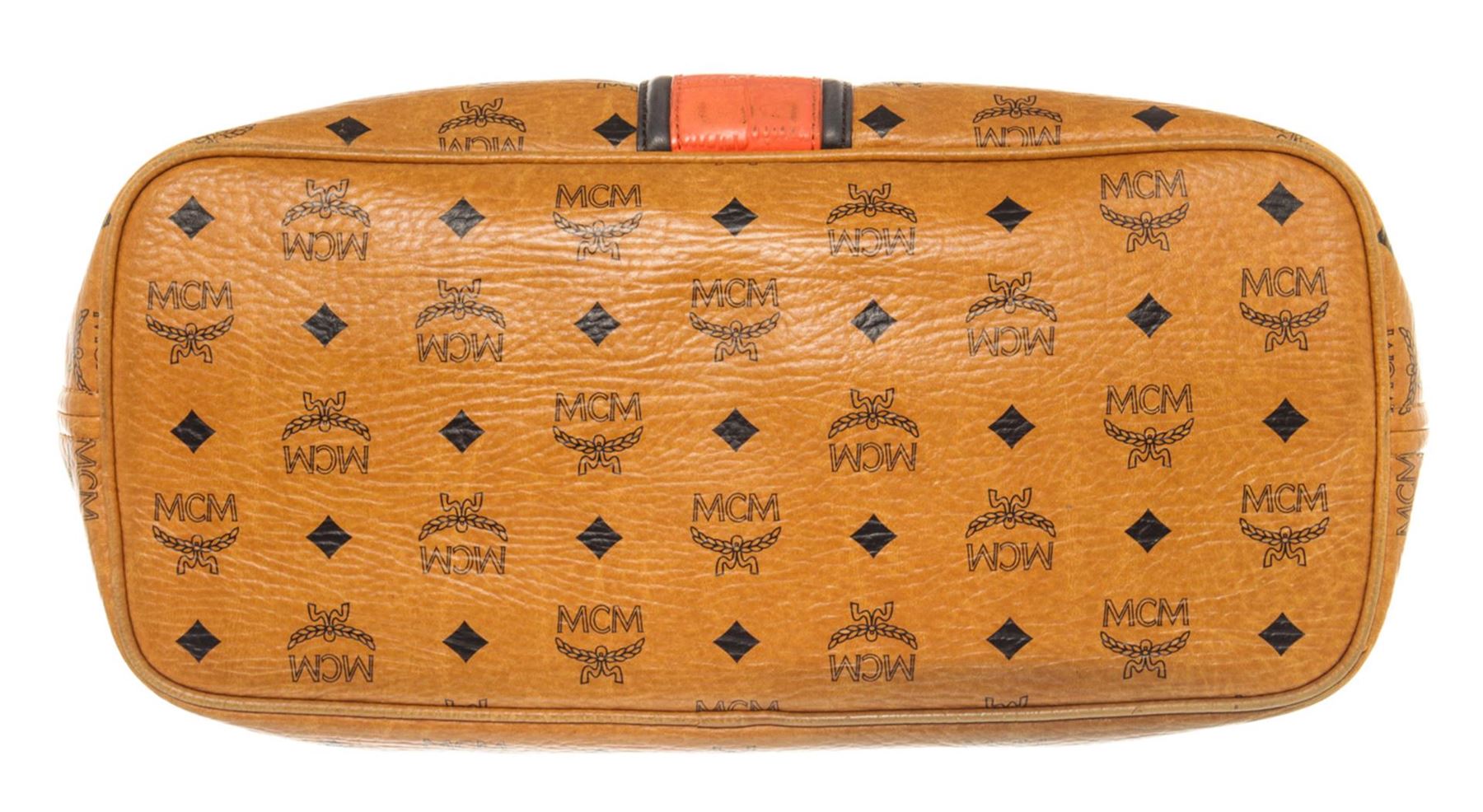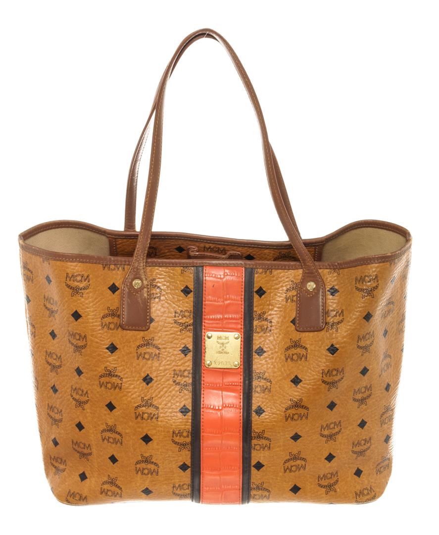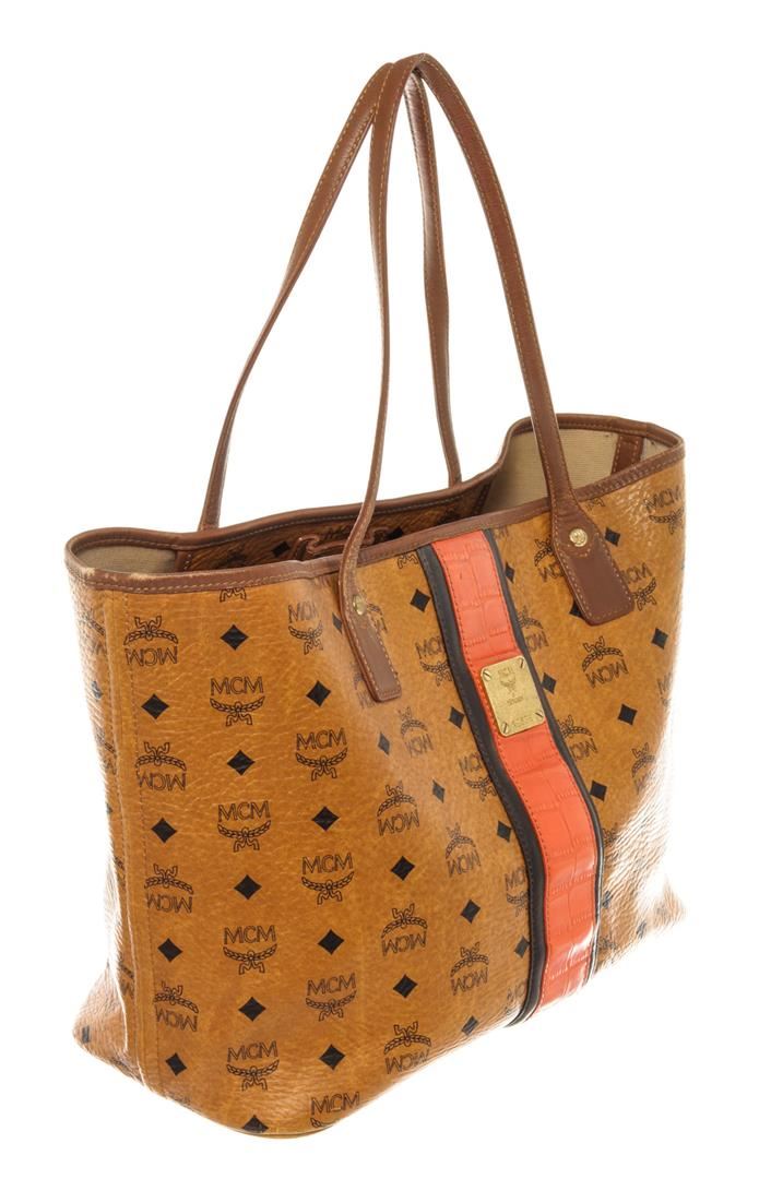 The MCM tote bag is finely crafted of brown Visetos coated canvas and the classic black MCM monogram print. It has an orange stripe running through at the front, dual flat leather handles, gold-tone hardware, open top and fabric-lined interior. 17.75"