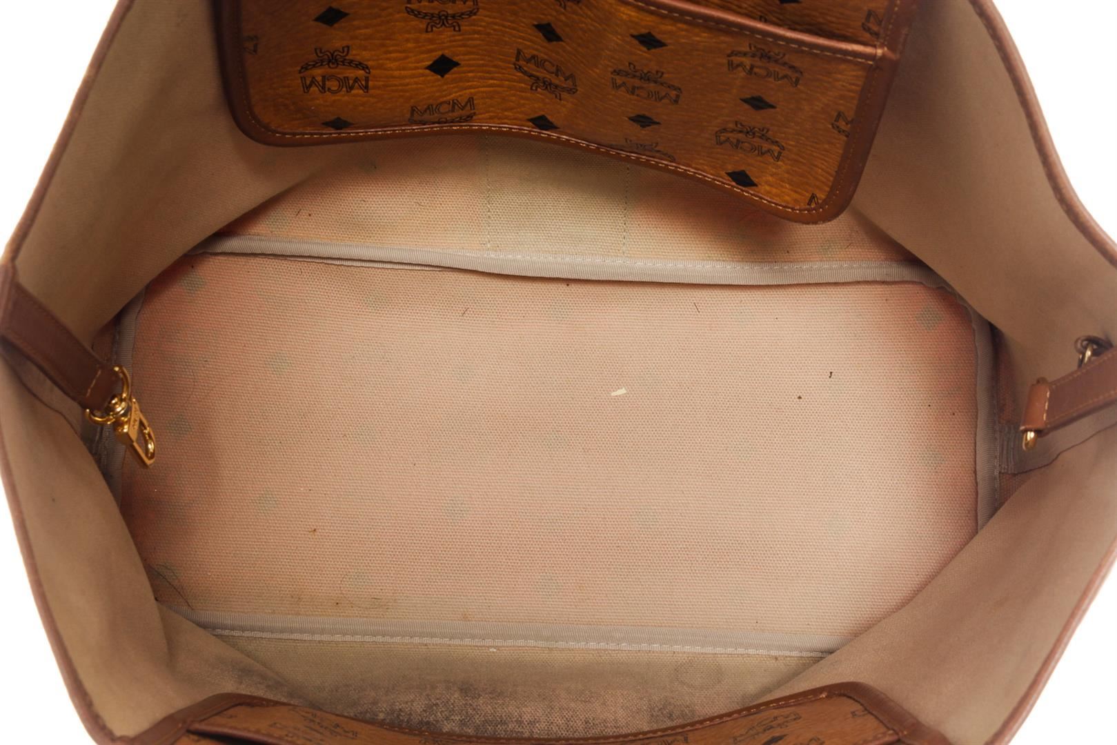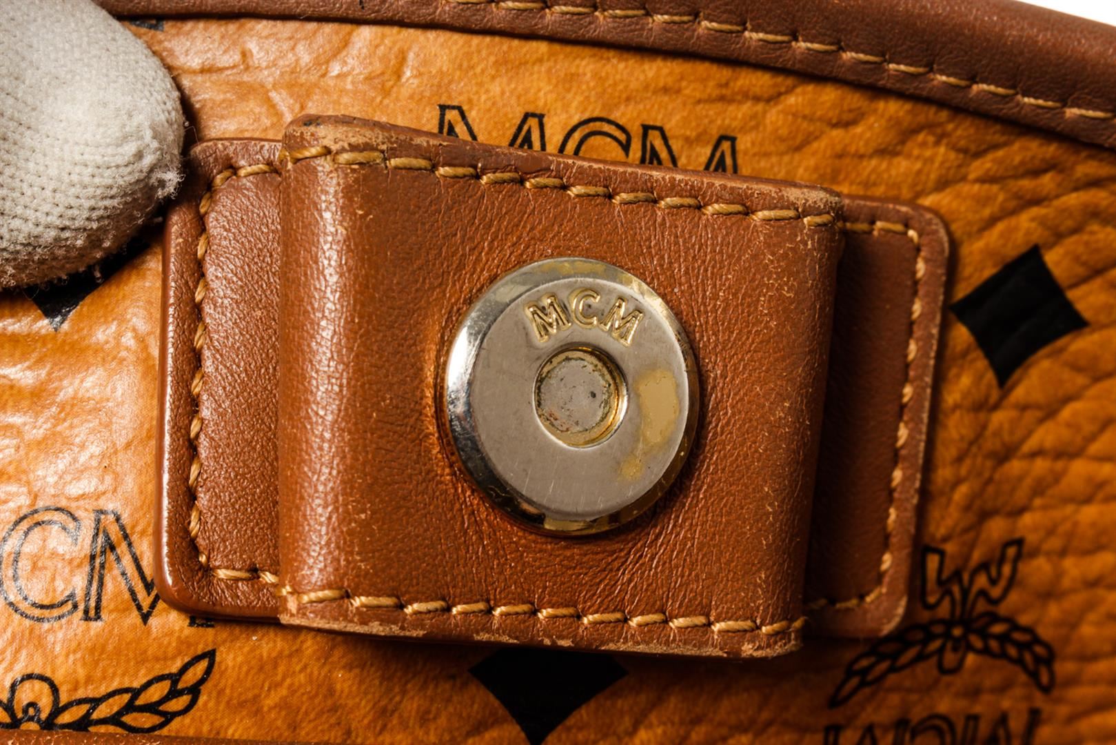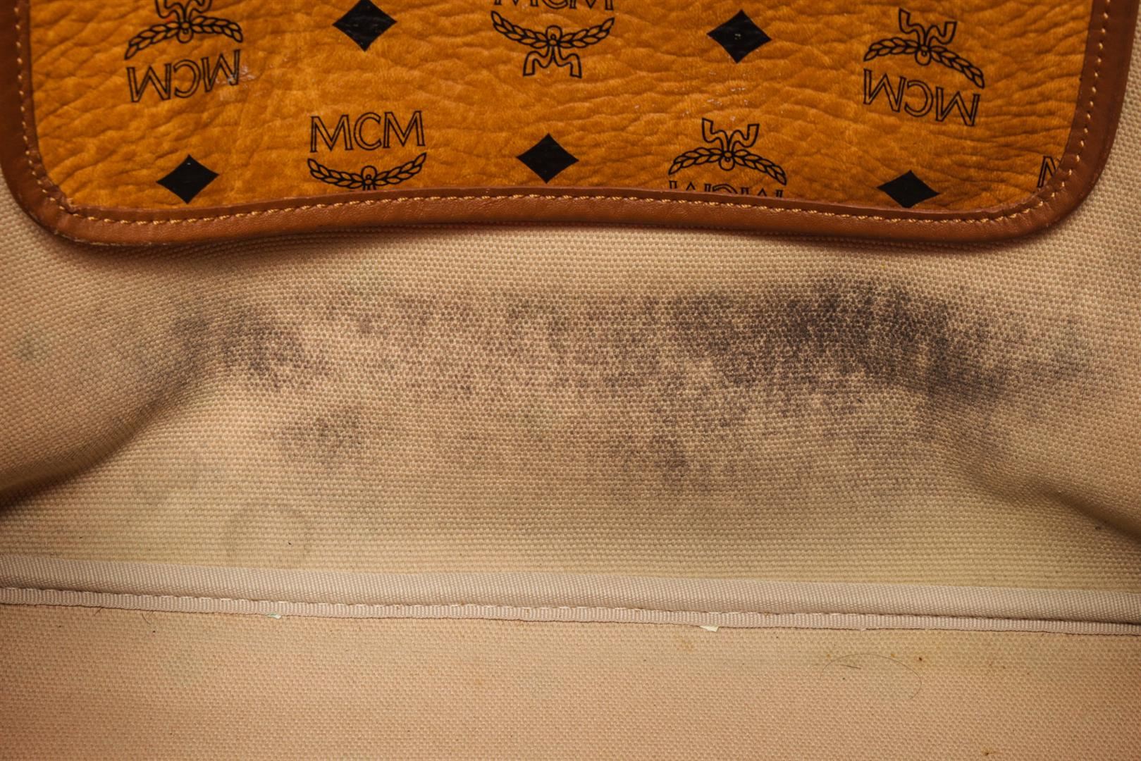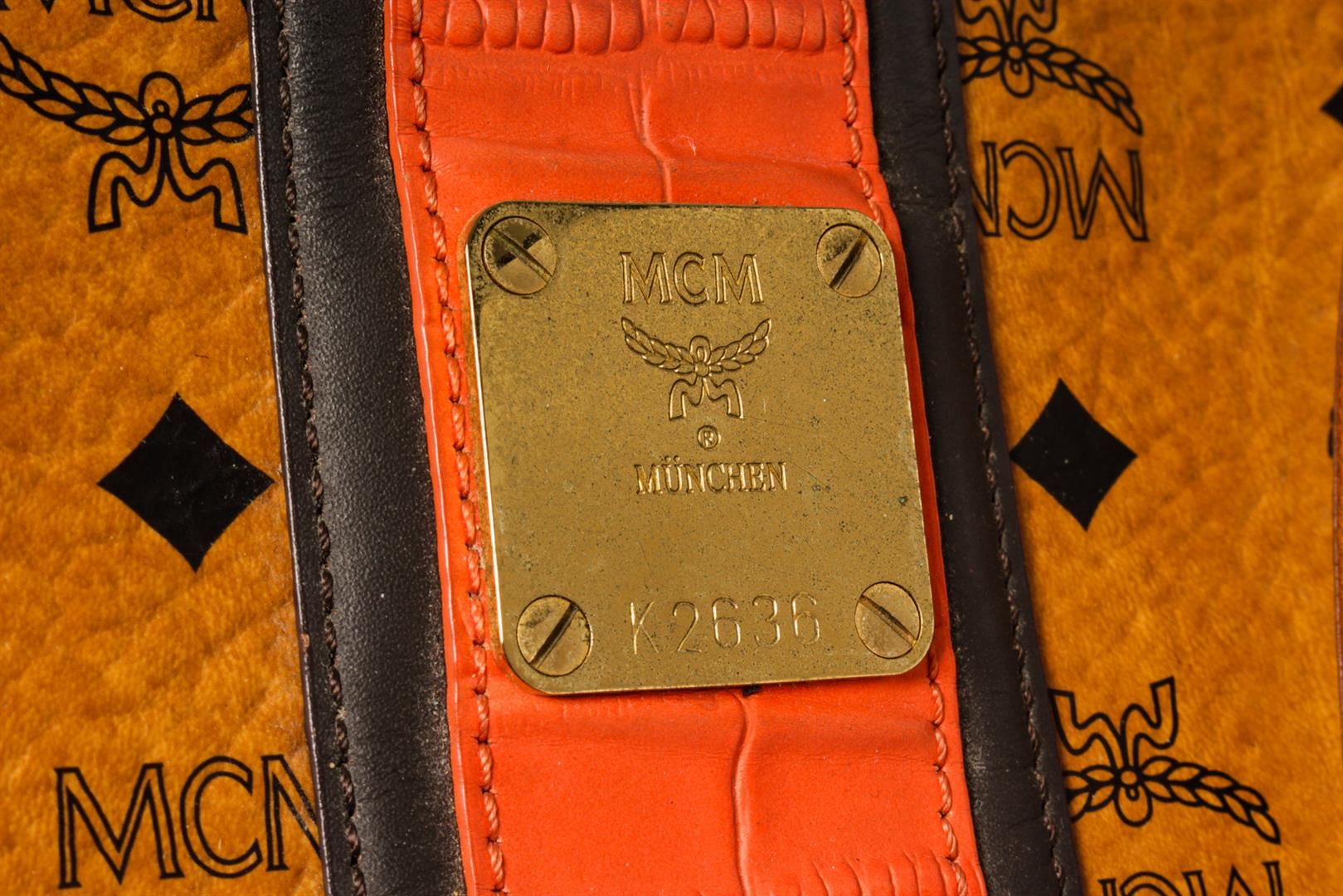 The MCM tote bag is finely crafted of brown Visetos coated canvas and the classic black MCM monogram print. It has an orange stripe running through at the front, dual flat leather handles, gold-tone hardware, open top and fabric-lined interior. 17.75"