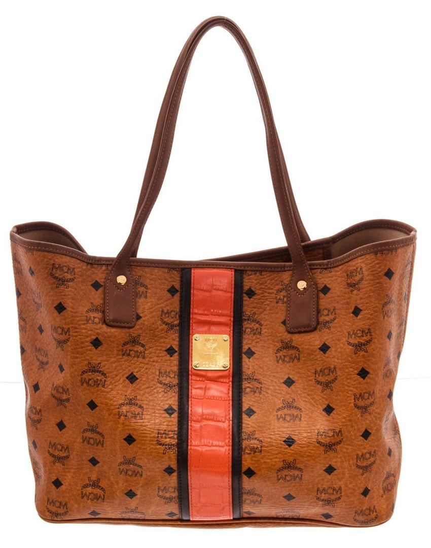 MCM cognac Visetos coated canvas shopper shoulder bag with leather trim, orange croc center stripe, gold-tone hardware, two interior slip pockets and leather straps. Measurements: Length: 10.5 in / 27 cm Width: 7 in / 18 cm 17 in / 43 cmCONDITION: Pre-Owned Good overall, please see photographs for detail.