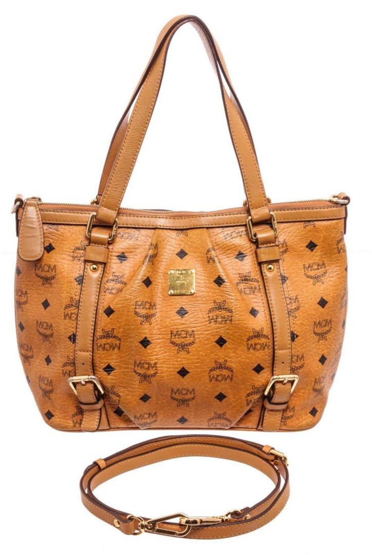 MCM Cognac Visetos Coated Canvas 2 Way Shoulder Bag with gold-tone hardware, Dual flat top handles, single flat detachable shoulder strap, brown canvas interior lining, three interior pockets, and zipper closure. Measurements: Length: 17.5 in / 44 cm Width: 5.5 in / 14 cm 16 in / 41 cmCONDITION: Pre-Owned Good overall, please see photographs for detail.