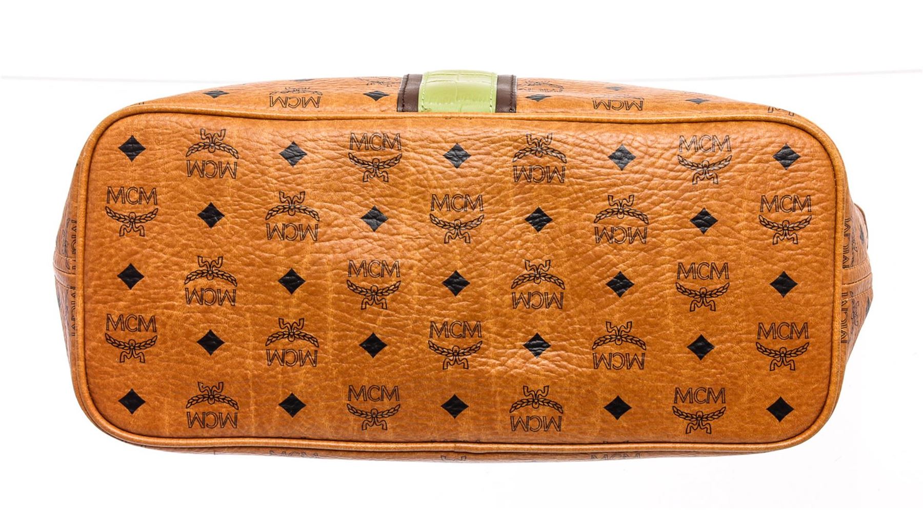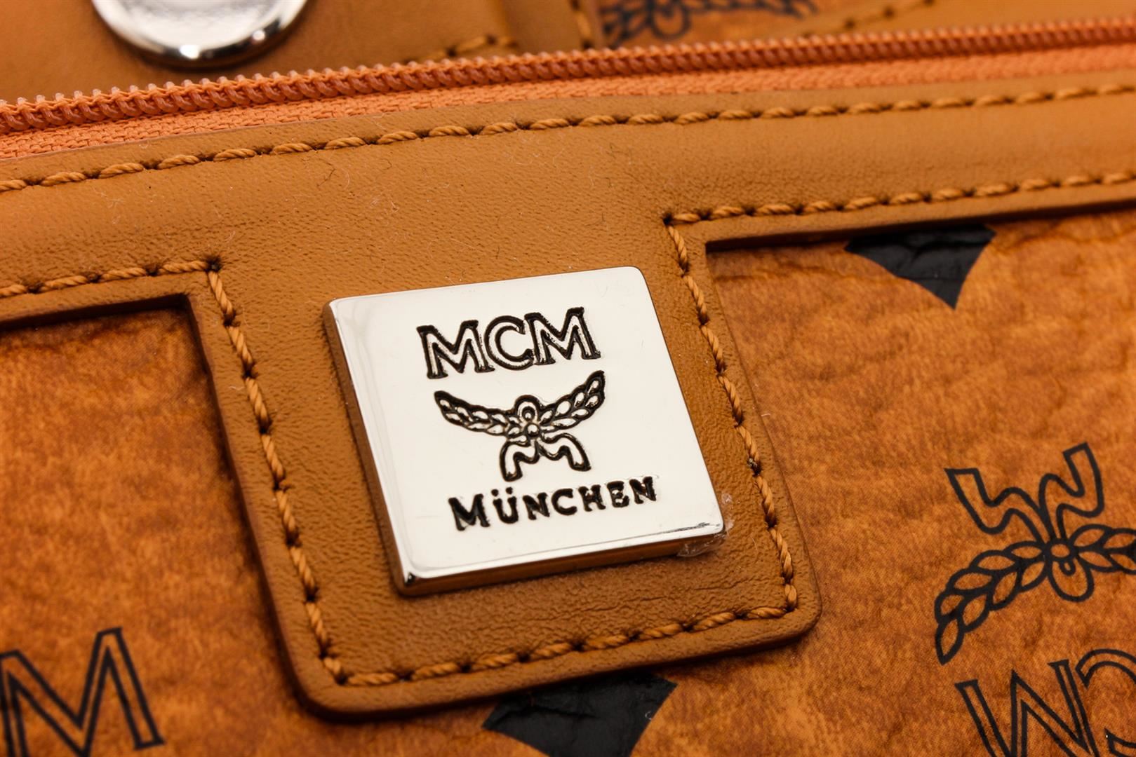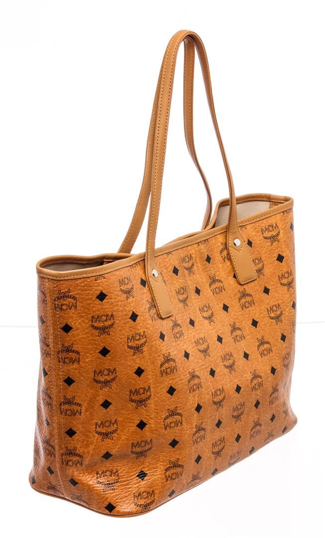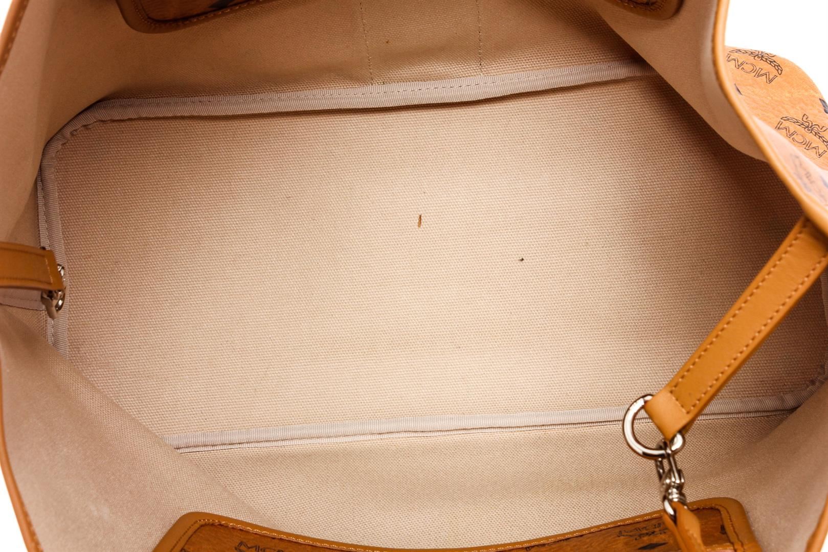 Cognac Visetos MCM coated canvas and leather large tote bag with silver-tone hardware, dual flat handles, tonal canvas lining, one zip pocket at interior wall and magnetic snap closure closure at top.