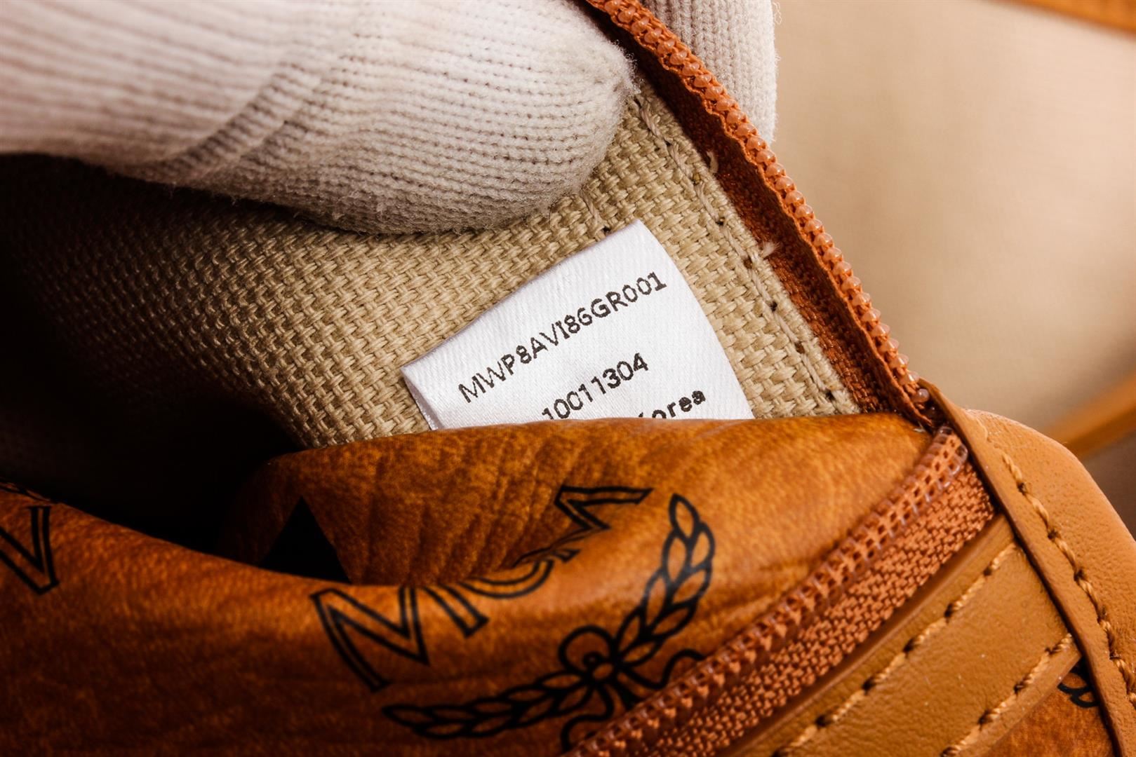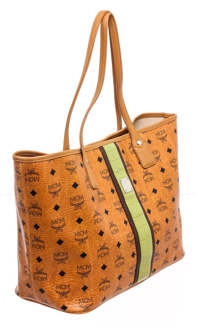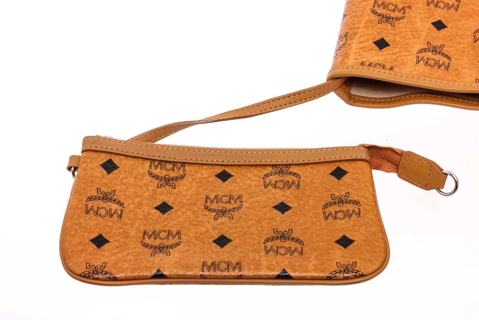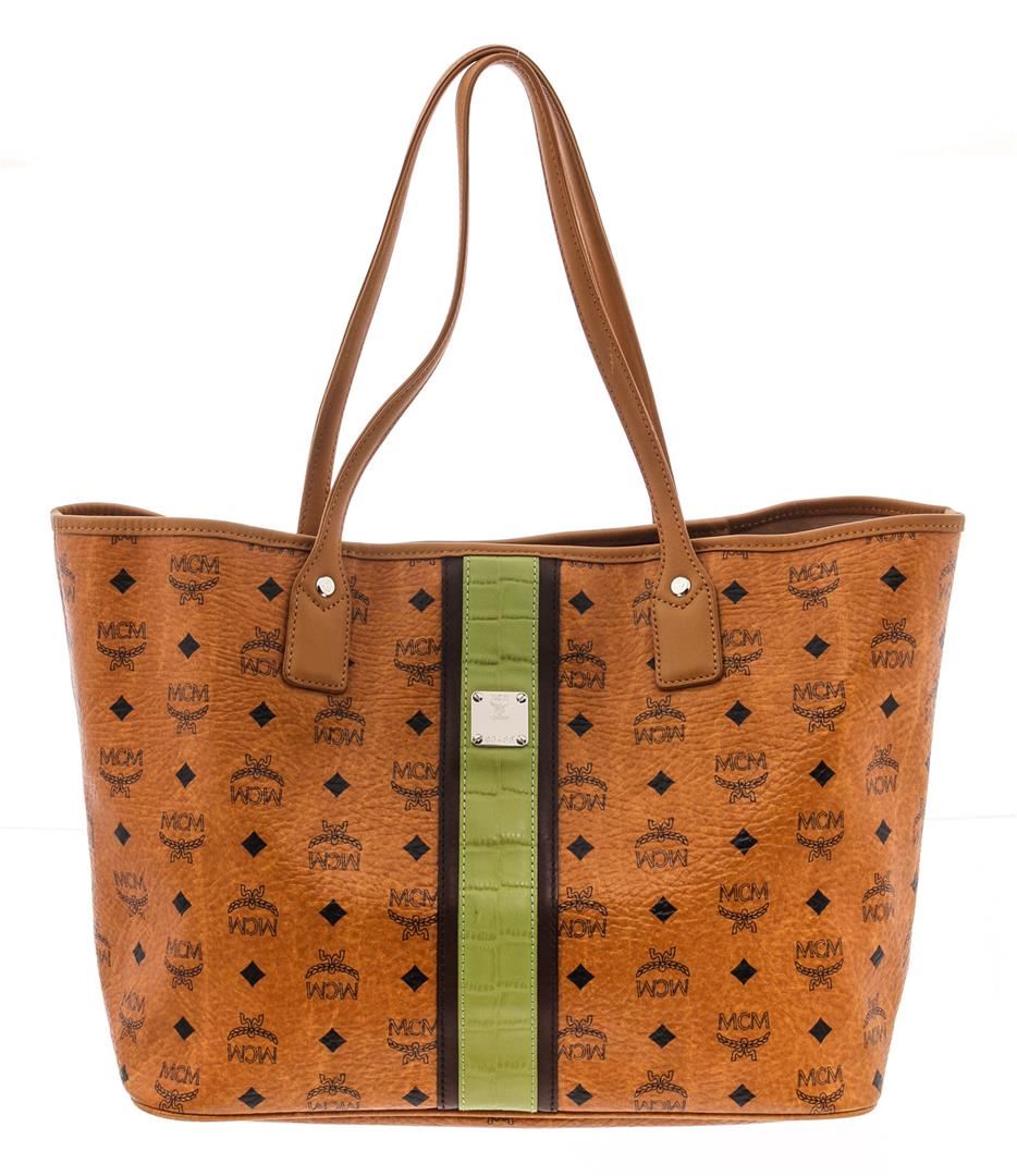 Cognac Visetos MCM coated canvas and leather large tote bag with silver-tone hardware, dual flat handles, tonal canvas lining, one zip pocket at interior wall and magnetic snap closure closure at top.