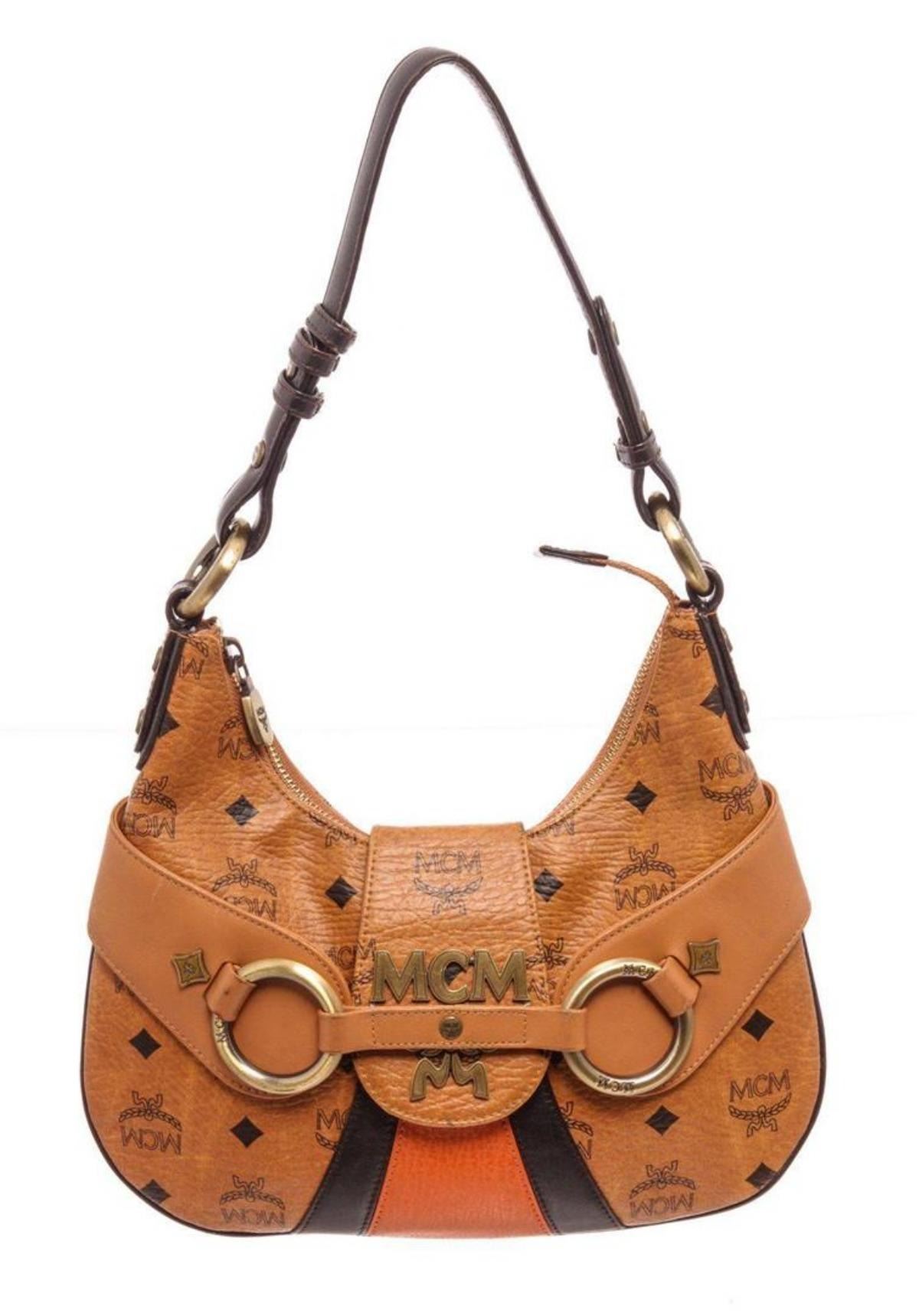 MCM Cognac Visetos Coated Canvas & Leather Satchel Bag with gold-tone hardware, single flat shoulder strap, brown canvas interior lining, one interior zip pocket and two interior slip pockets, overall zipper closure at top. Measurements: Length: 10 in / 25 cm Width: 3 in / 8 cm 7.5 in / 19 cmCONDITION: Pre-Owned Good overall, please see photographs for detail.