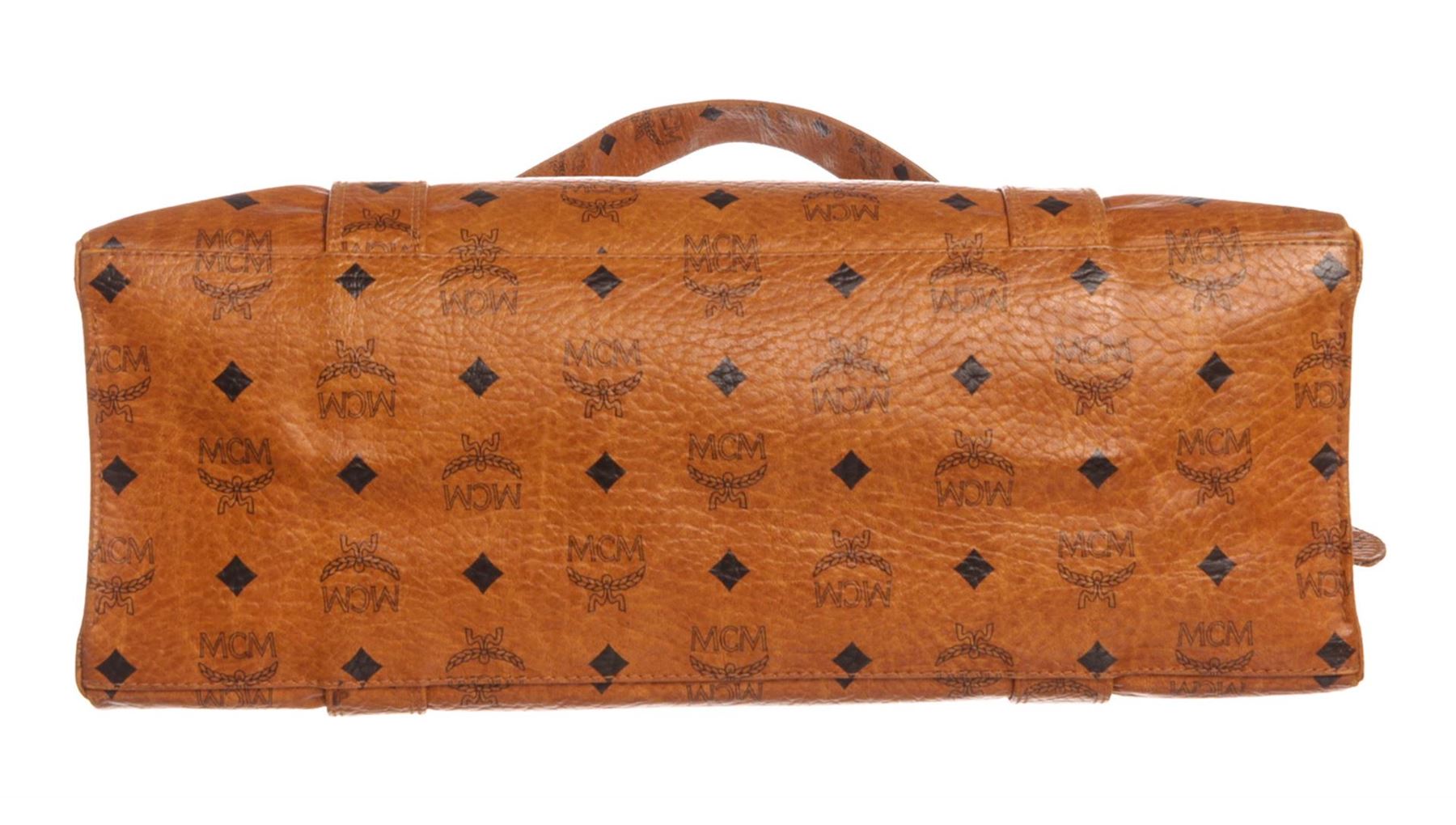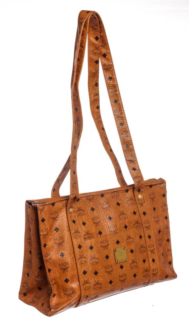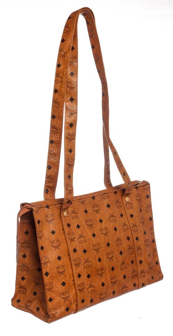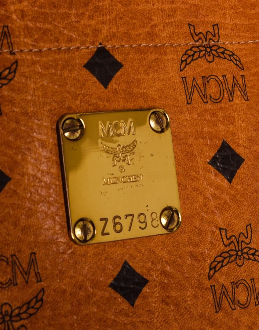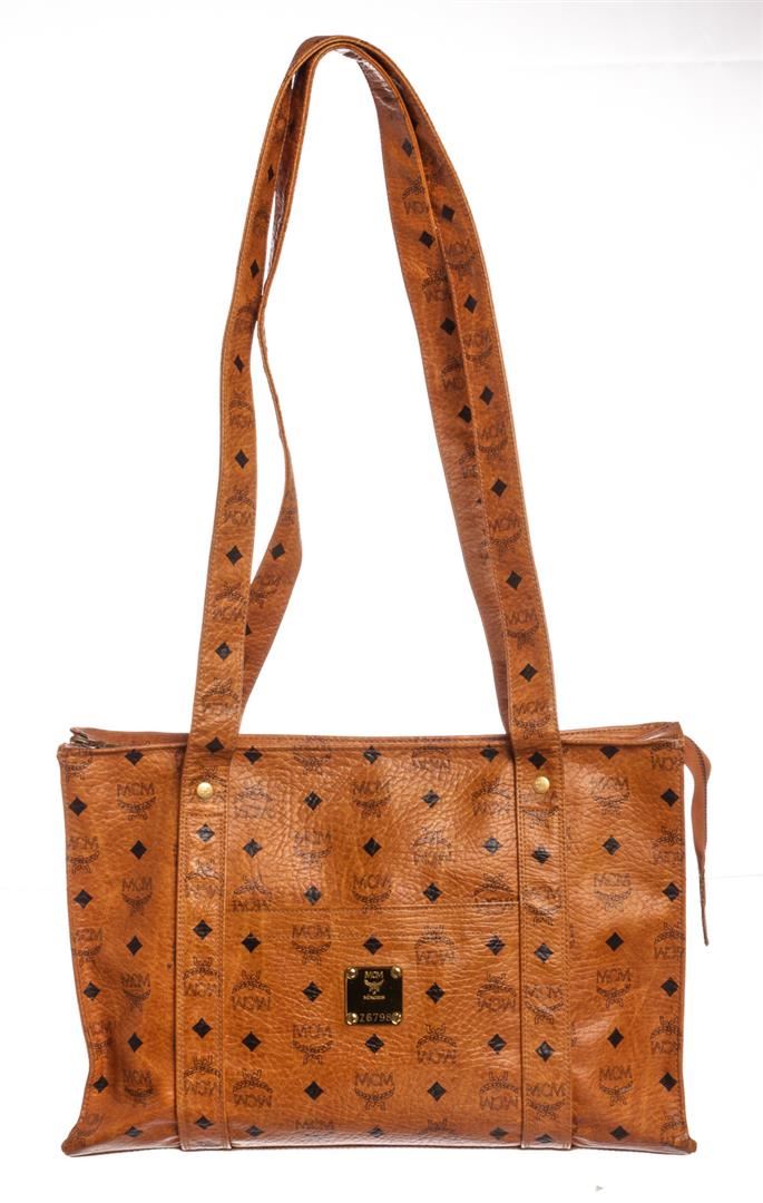 Cognac MCM visetos coated canvas vintage large tote bag with gold-tone hardware, tonal canvas lining, one side zip pocket and overall zipper top closure.