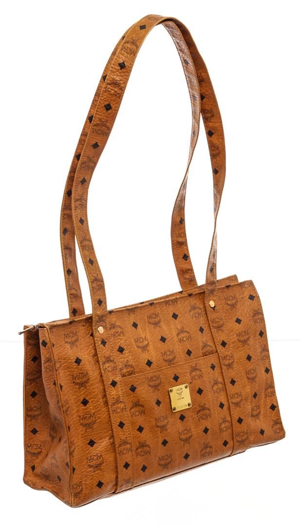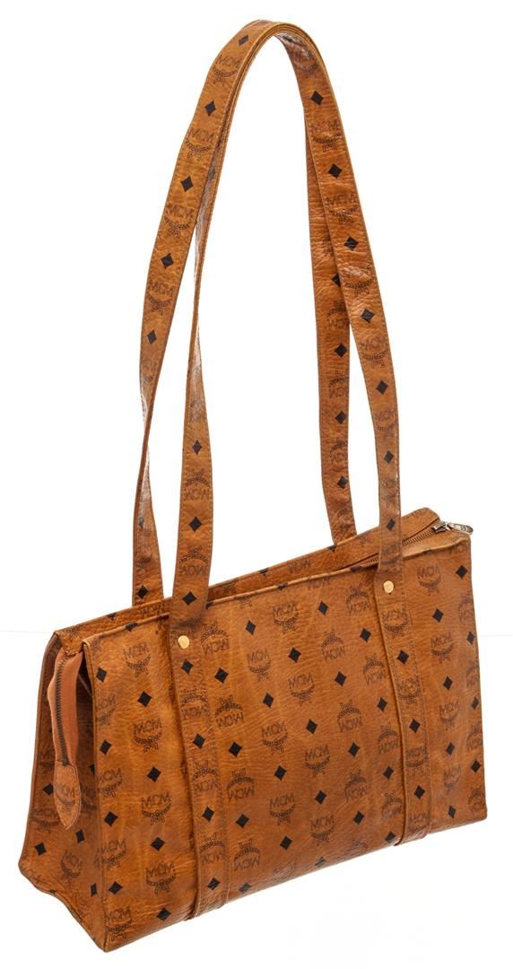 Cognac MCM visetos coated canvas vintage large tote bag with gold-tone hardware, tonal canvas lining, one side zip pocket and overall zipper top closure. Authentic.