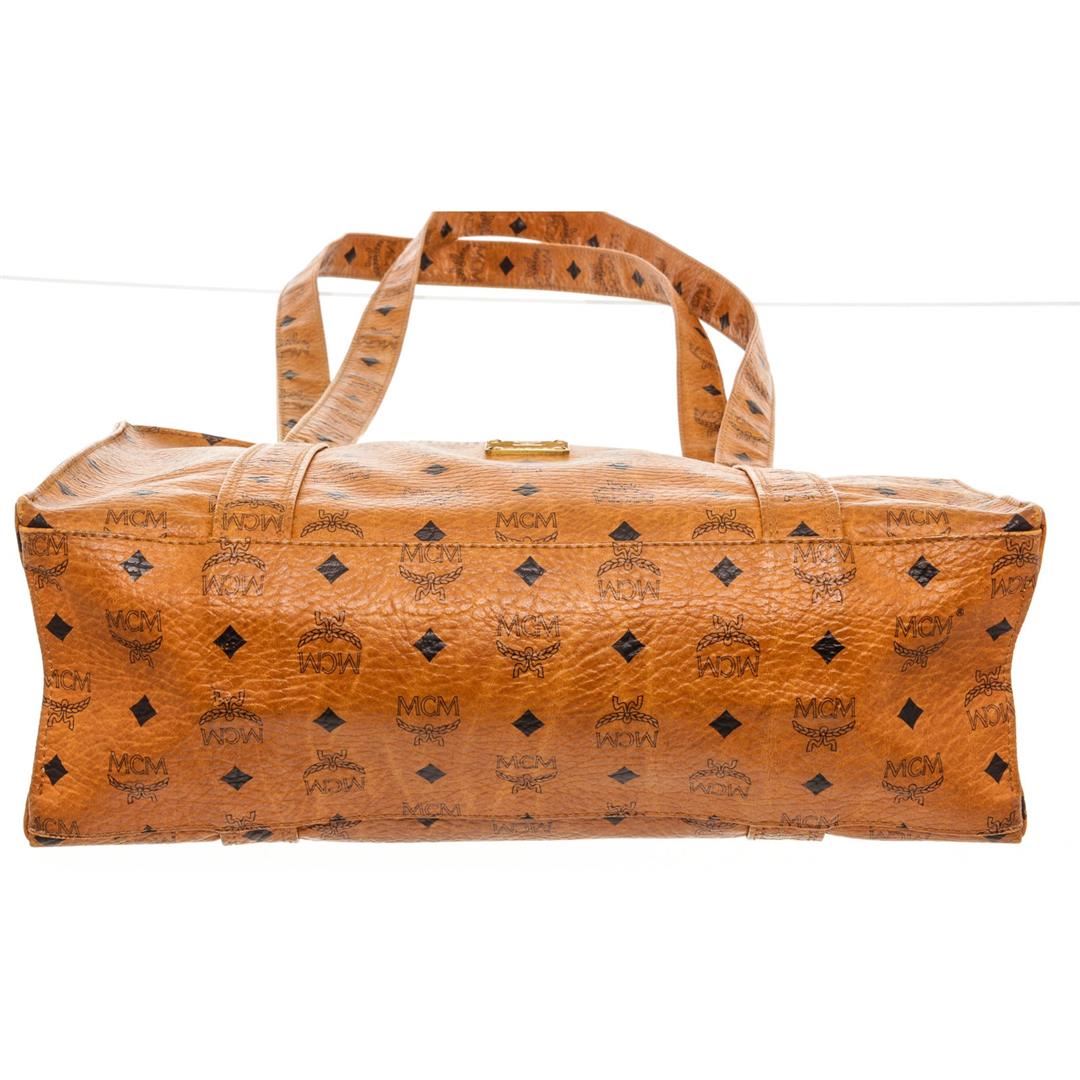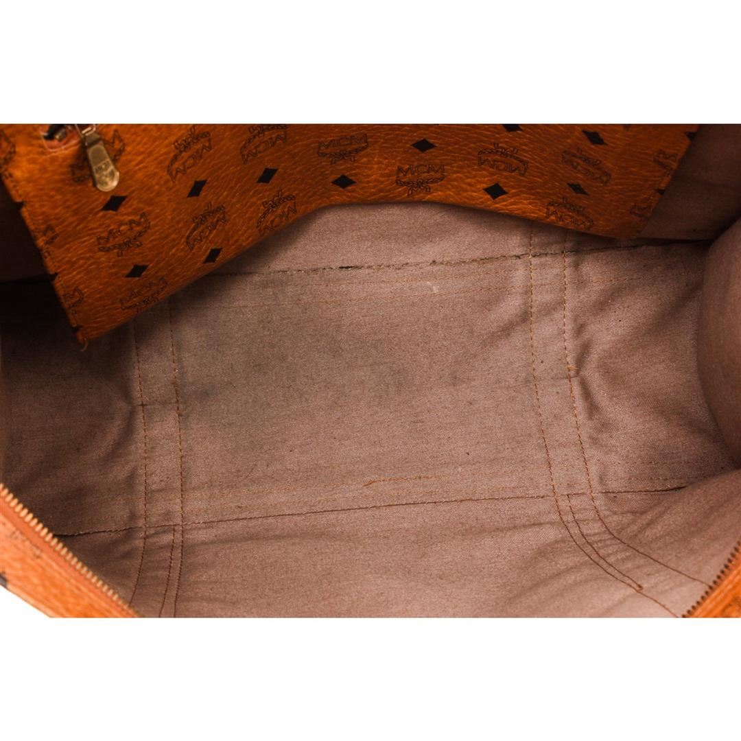 Cognac MCM visetos coated canvas vintage large tote bag with gold-tone hardware, tonal canvas lining, one side zip pocket and overall zipper top closure. Authentic.