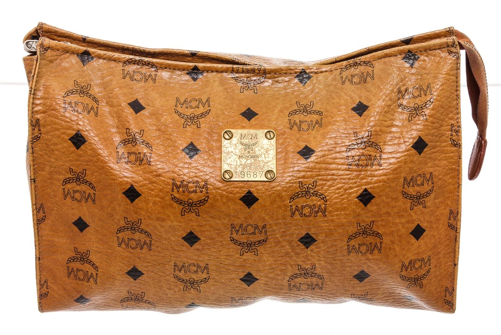 One MCM Cognac Visetos Coated Canvas Pouch Bag. MCM brown Cognac Visetos coated canvas pouch bag with gold-tone hardware, beige leather lining, and zip top closure. Please note: Discoloration along top.