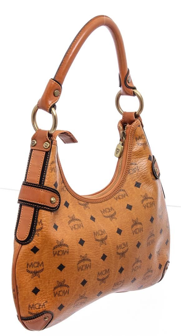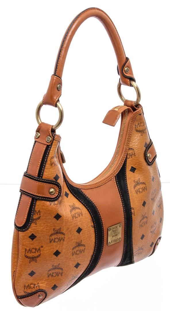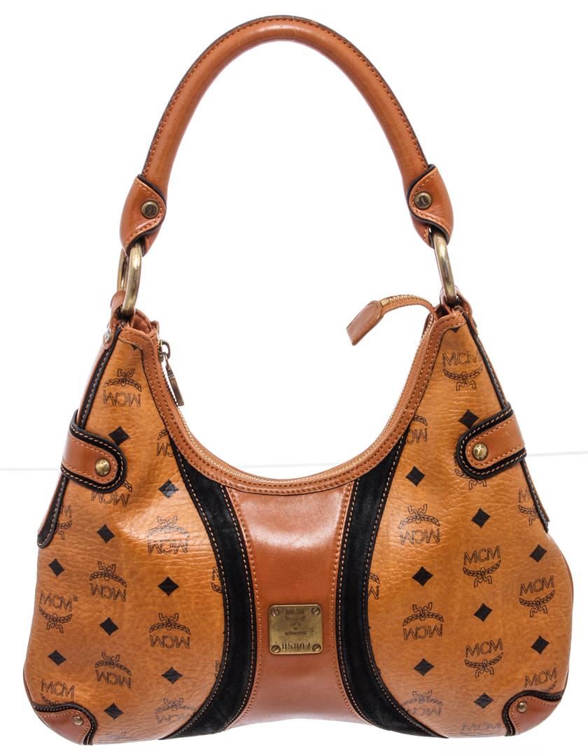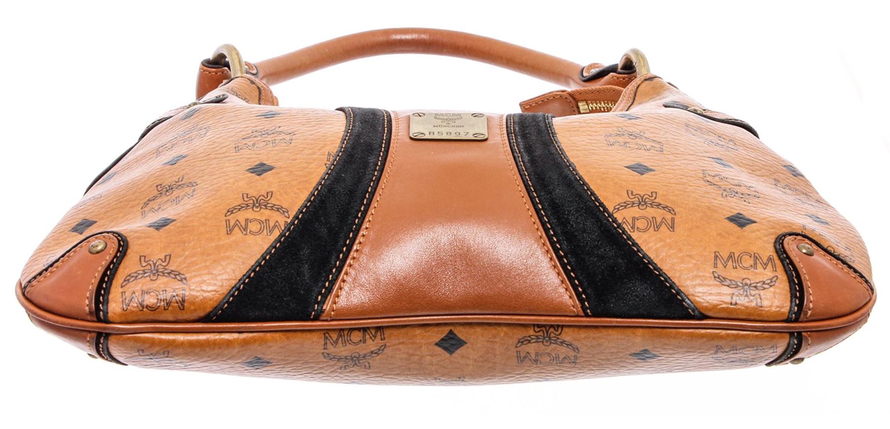Cognac Visetos MCM coated canvas and black suede leather trim hobo bag with antique gold-tone hardware, single rolled handle, tonal canvas lining, one zip pocket at interior wall with zip top closure.