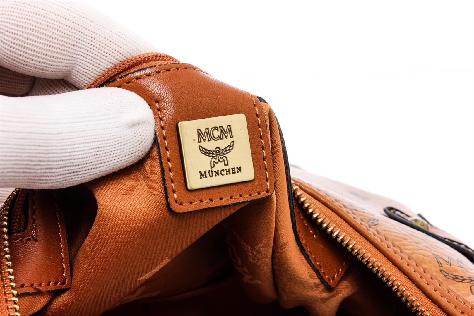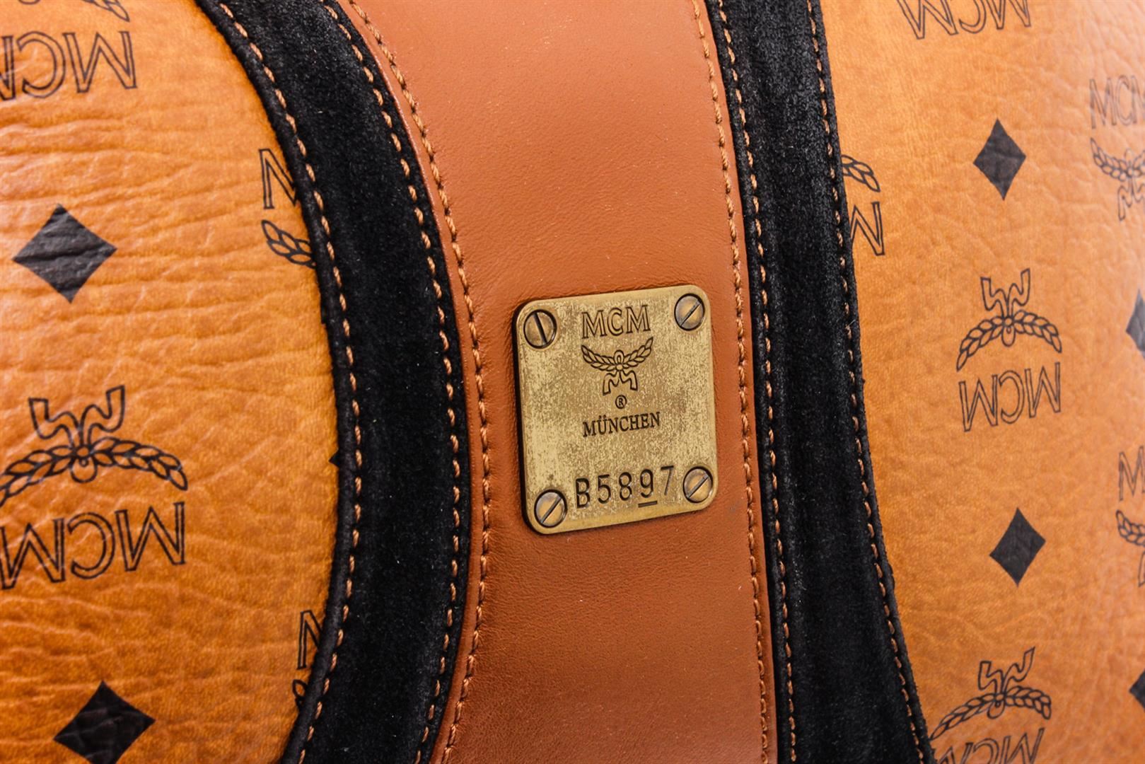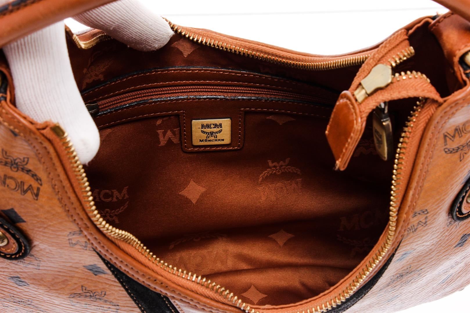 Cognac Visetos MCM coated canvas and black suede leather trim hobo bag with antique gold-tone hardware, single rolled handle, tonal canvas lining, one zip pocket at interior wall with zip top closure.