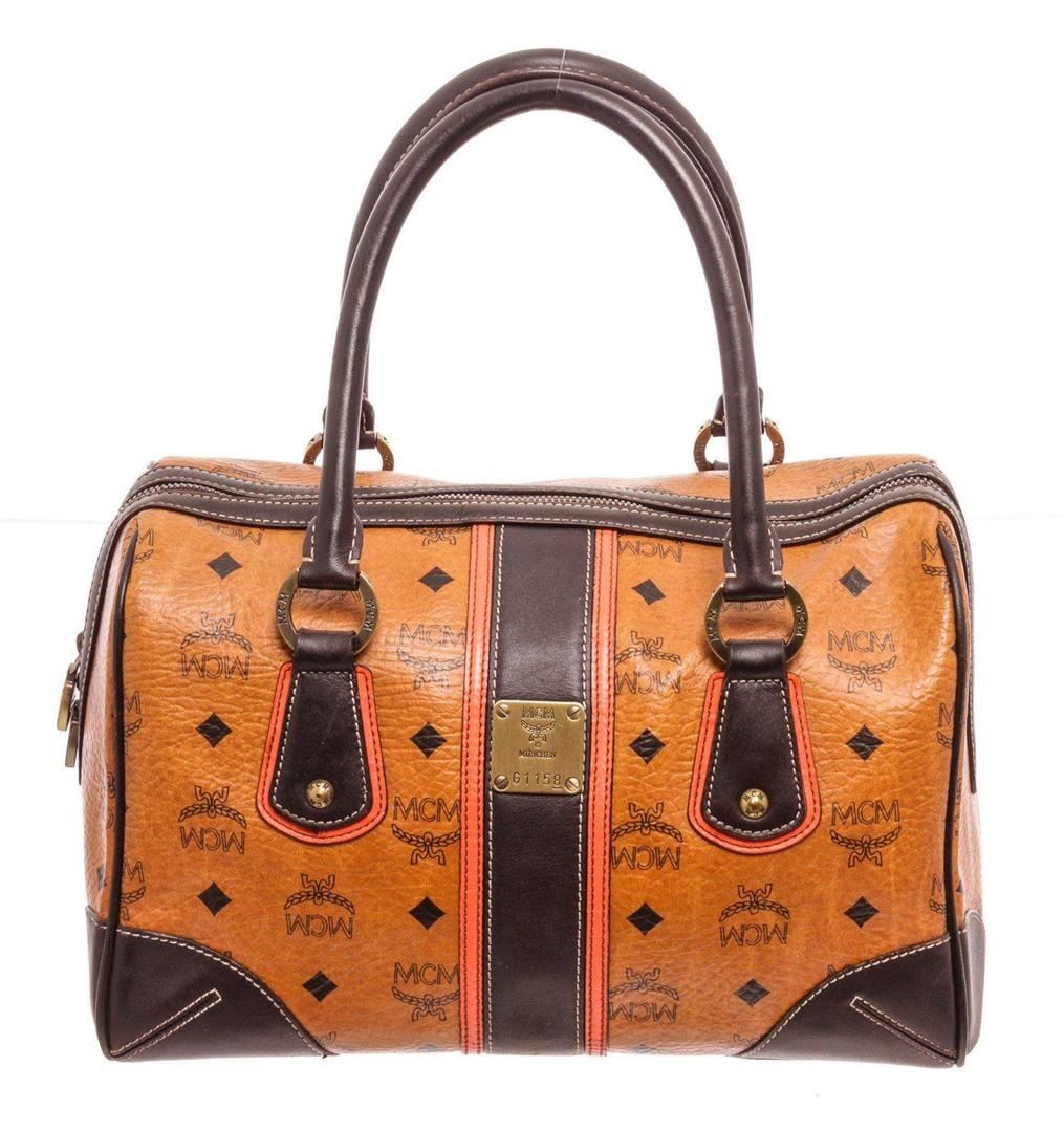 MCM Cognac Visetos Coated Canvas Tote Bag with black Leather trim, gold-tone hardware and dual rolled top handles, logo placard at front face, brown canvas interior lining, one interior slip pocket, protective feet at base and overall zipper closure at top. Measurements: Length: 6 in / 15 cm Width: 12.5 in / 32 cm 8 in / 20 cmCONDITION: Pre-Owned Good overall, please see photographs for detail.