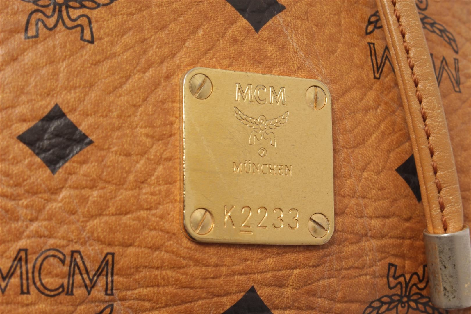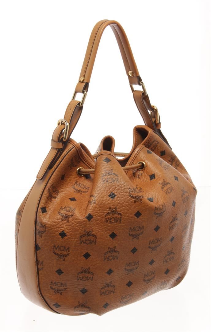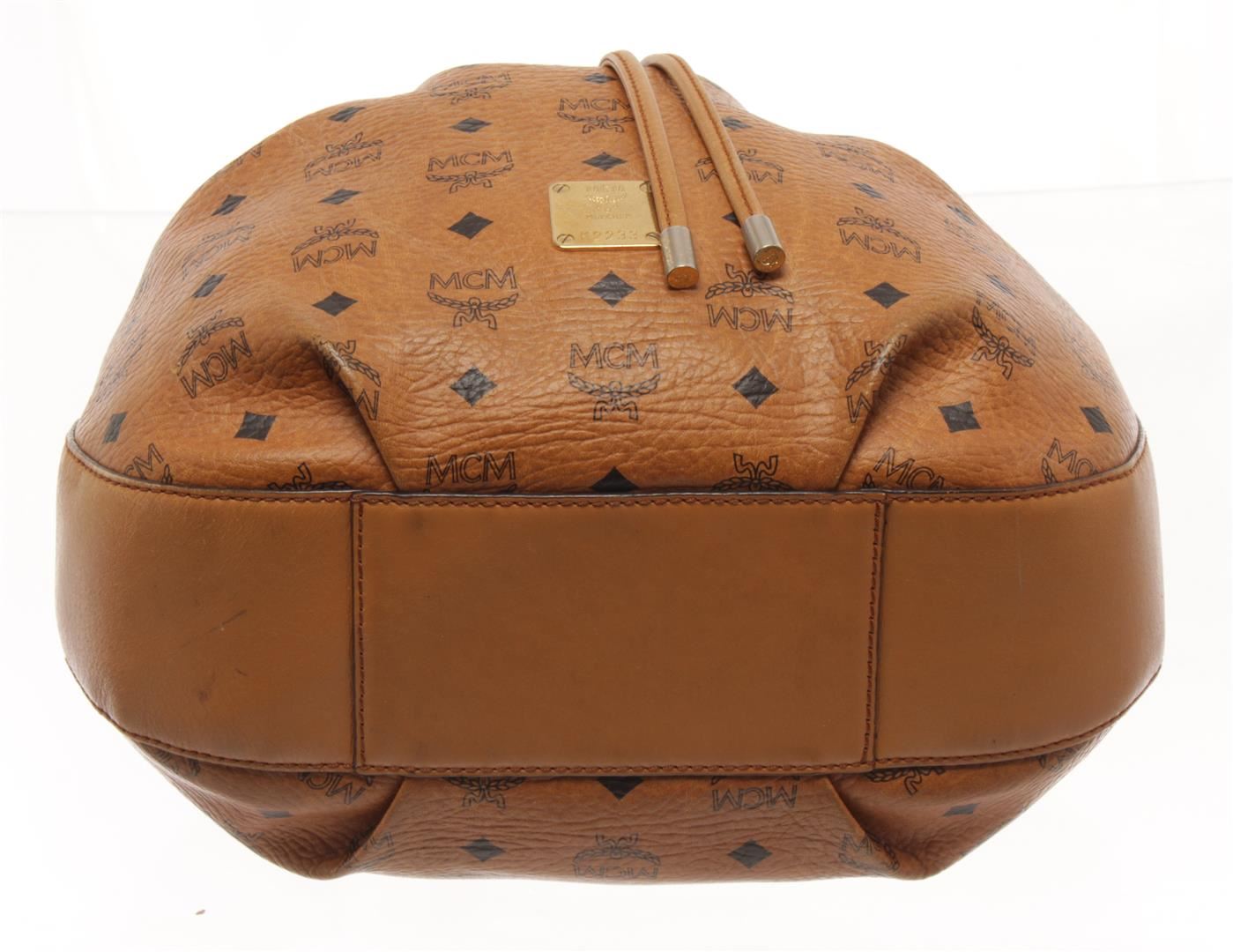 One MCM Cognac Visetos Leather Bucket Bag. Item is sold AS-IS. All available information is listed in the description and shown in the photo. MCM Cognac Visetos Leather Bucket Bag with dark gold-toned hardware, interior side zip pocket and open pocket, visetos coated canvas and trimmed in rich nappa leather, drawstring fastening with concealed magnetic closure, removable top handle, removable leather crossbody strap, drawstring closure. There are a few scratches on the leather. Please refer to photos. 10.2" x 9.1" x 5.5" inches / 4.01 x 3.58 x 2.16 cm