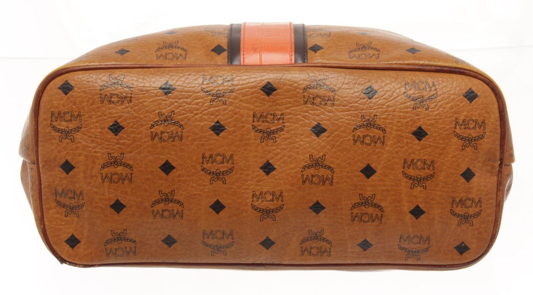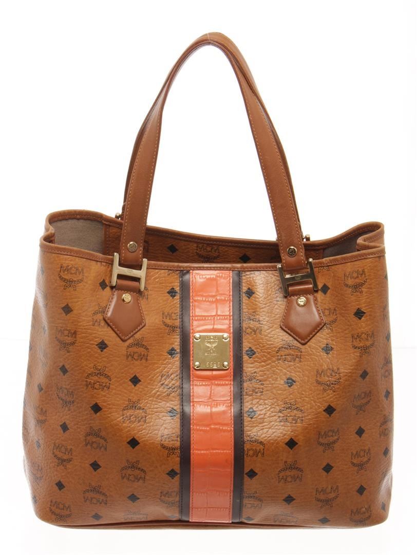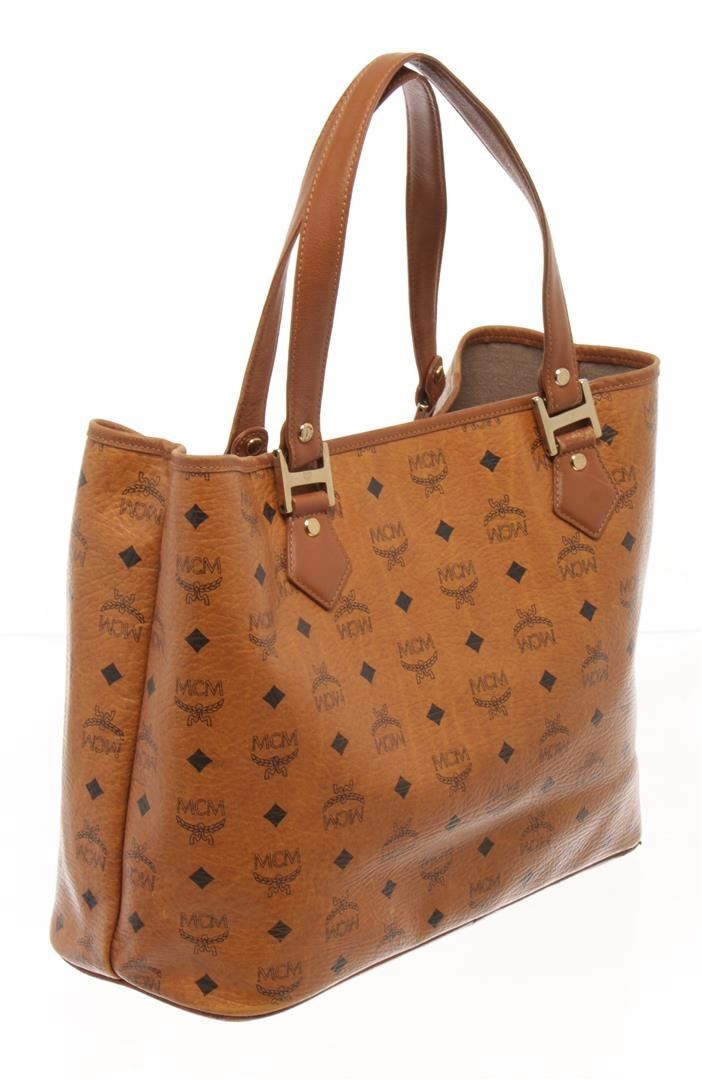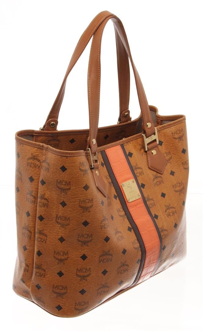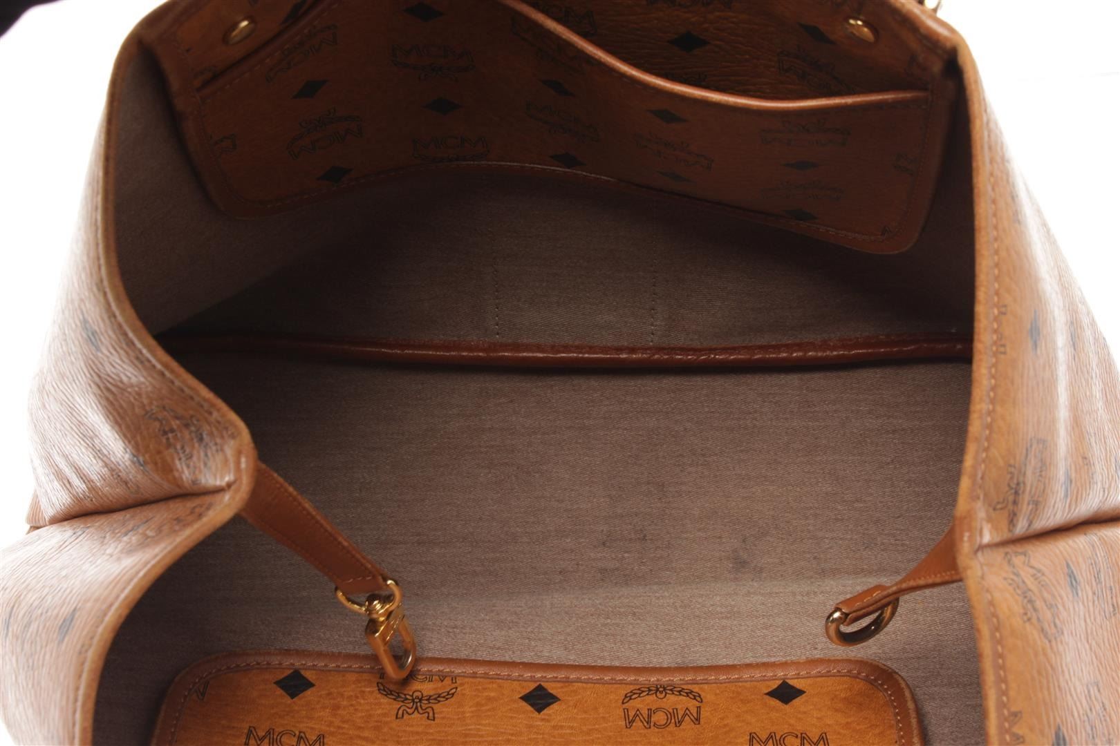 MCM Cognac Visetos Leather Shoulder Bag. All available information is listed in the description and shown in the photos. MCM Cognac Visetos Leather Shoulder Bag with brown mcm visetos leather tote bag with this tote bag features a leather body, flat leather straps, an open top, and a detachable interior zip pouch. 11" L x 16.1" W x 5.7" D/ 27.94 x 40.89 x 14.47 cm