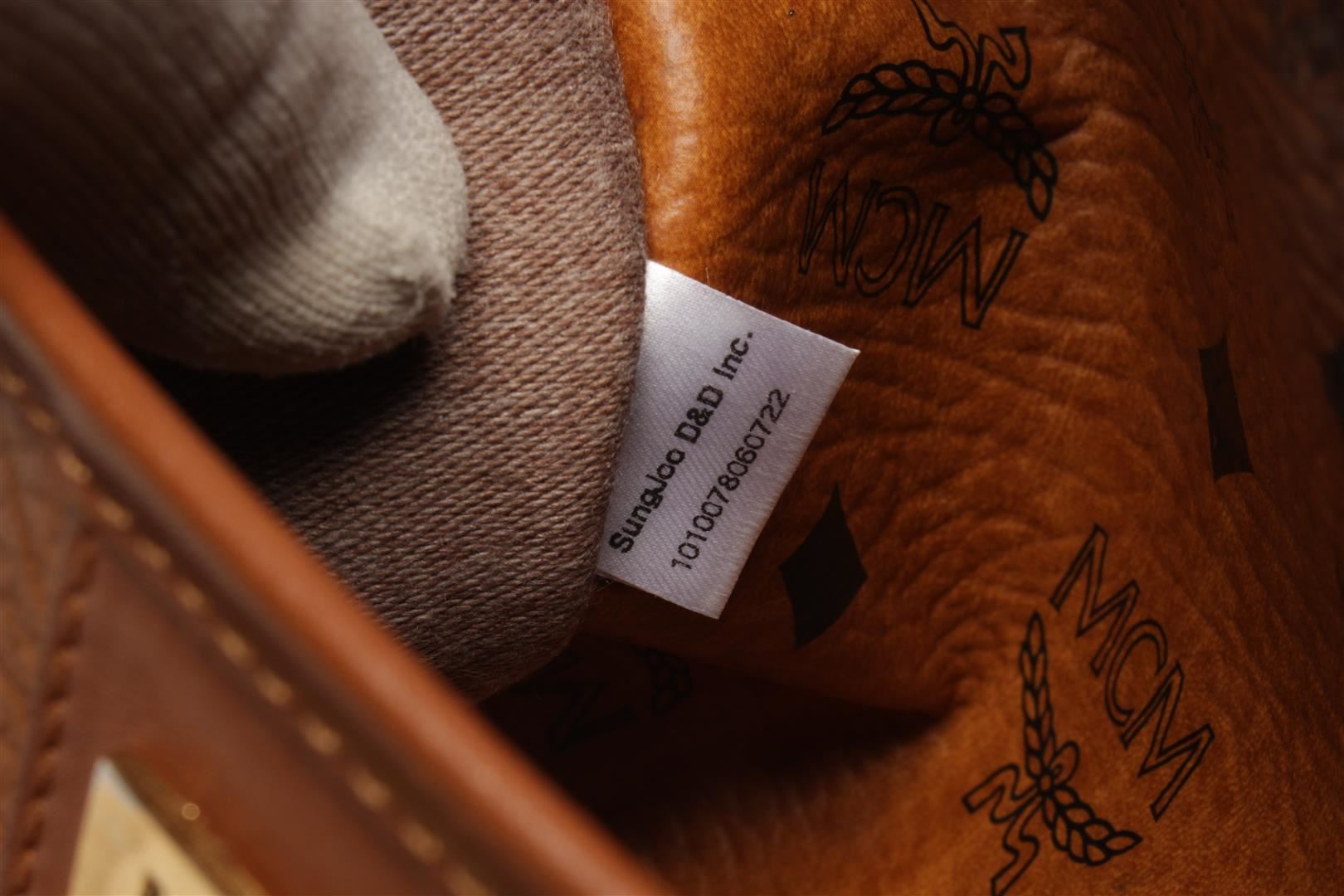 MCM Cognac Visetos Leather Shoulder Bag. All available information is listed in the description and shown in the photos. MCM Cognac Visetos Leather Shoulder Bag with brown mcm visetos leather tote bag with this tote bag features a leather body, flat leather straps, an open top, and a detachable interior zip pouch. 11" L x 16.1" W x 5.7" D/ 27.94 x 40.89 x 14.47 cm