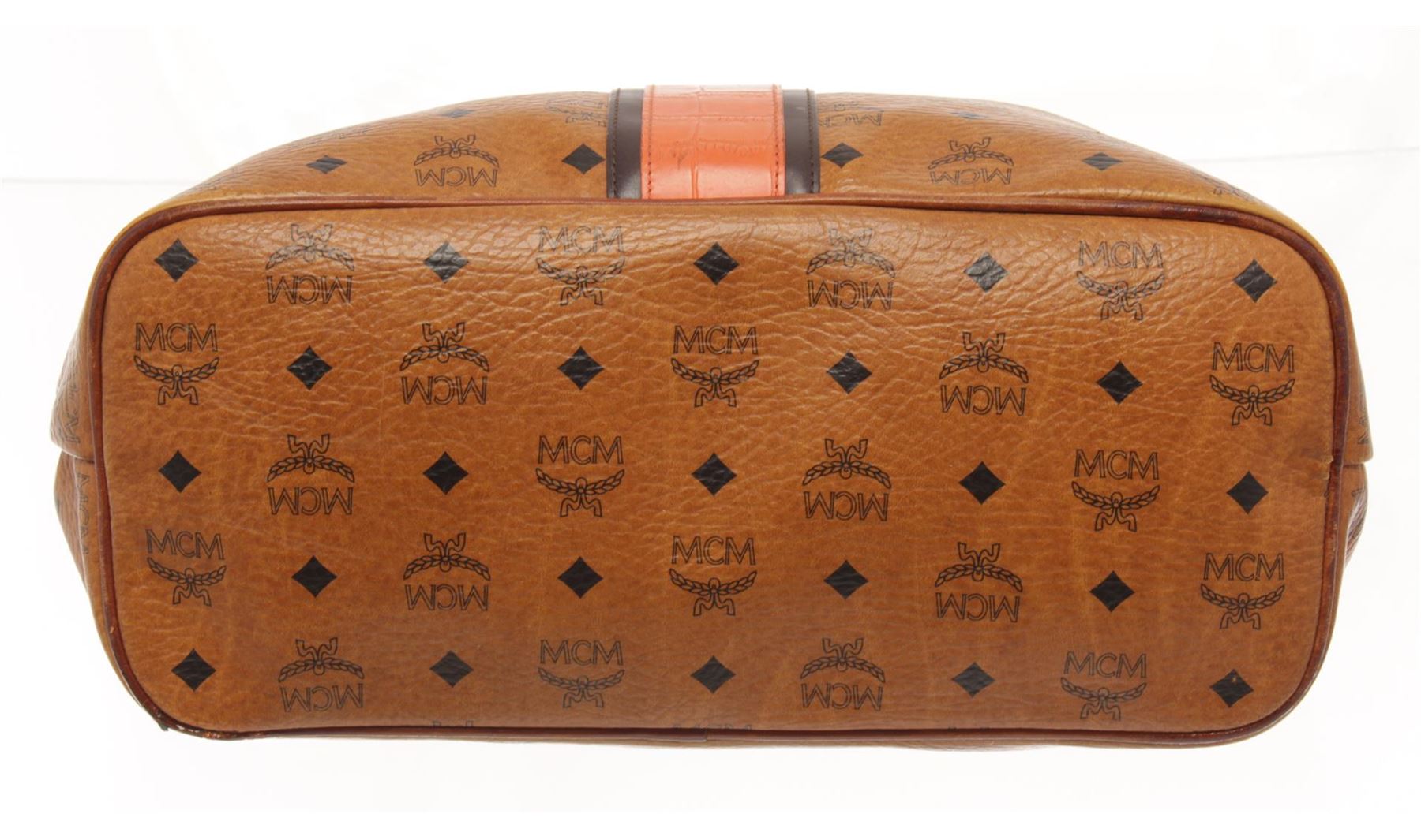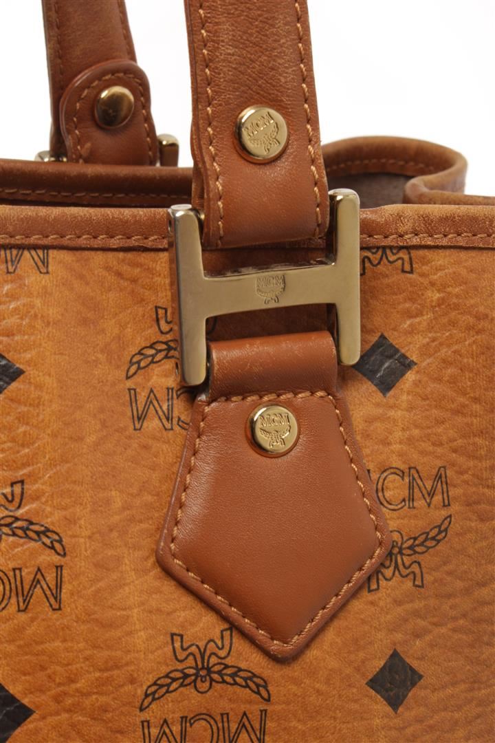 MCM Cognac Visetos Leather Shoulder Bag. All available information is listed in the description and shown in the photos. MCM Cognac Visetos Leather Shoulder Bag with brown mcm visetos leather tote bag with this tote bag features a leather body, flat leather straps, an open top, and a detachable interior zip pouch. 11" L x 16.1" W x 5.7" D/ 27.94 x 40.89 x 14.47 cm