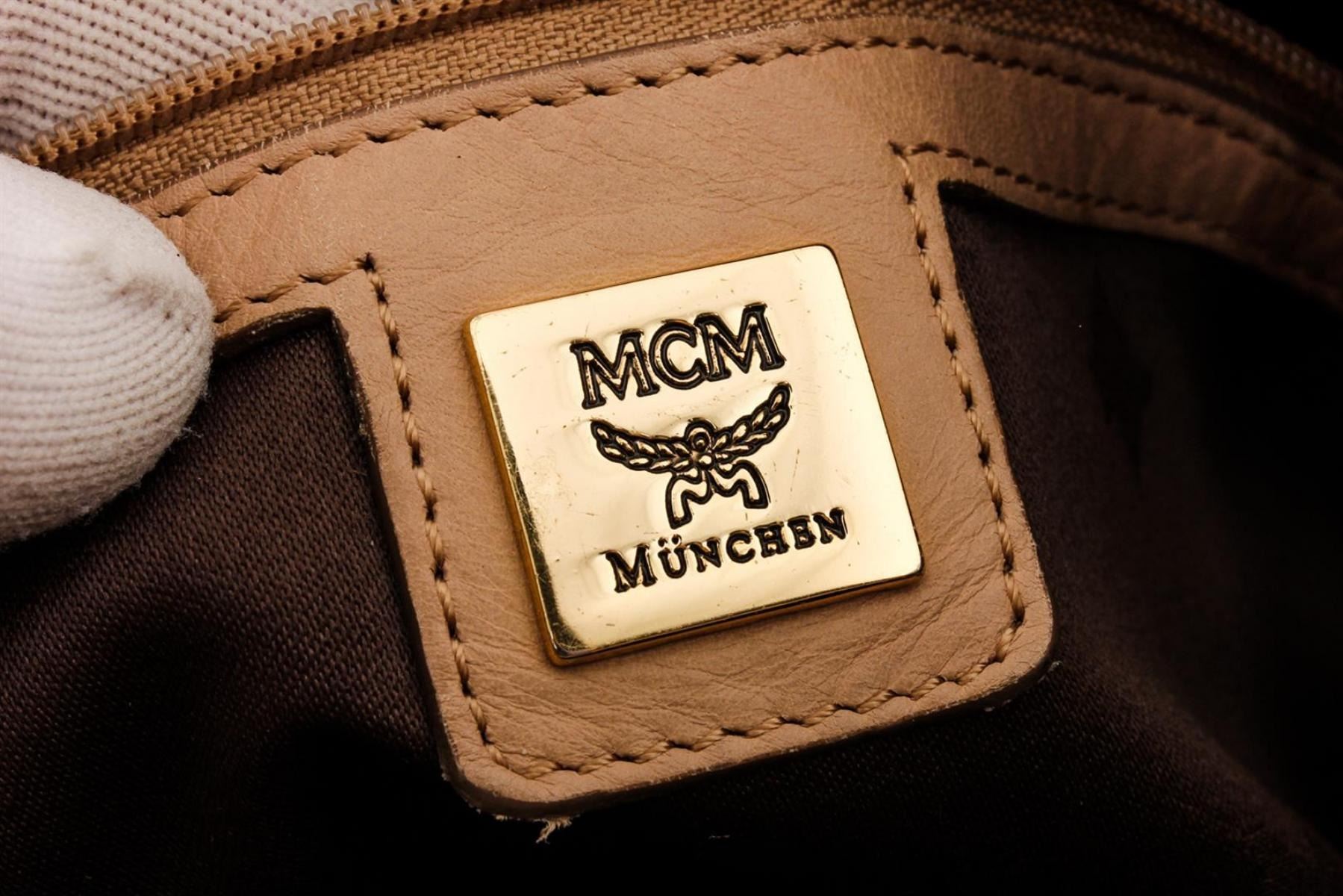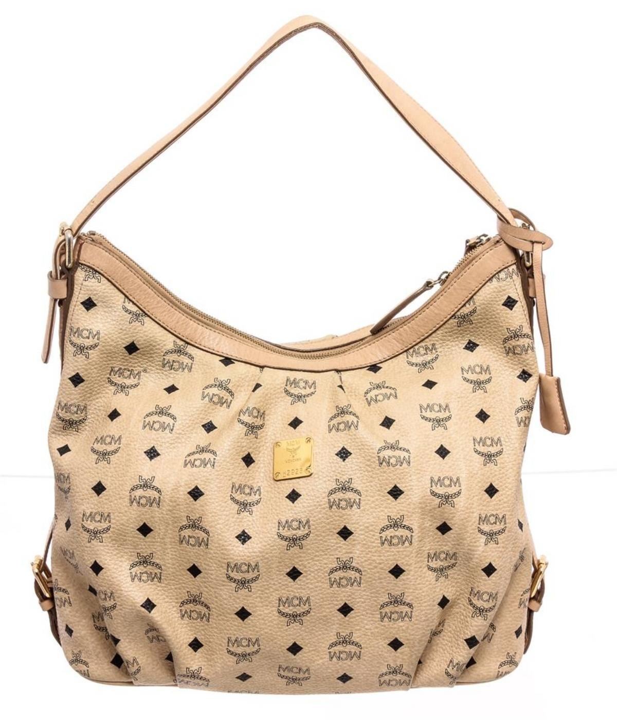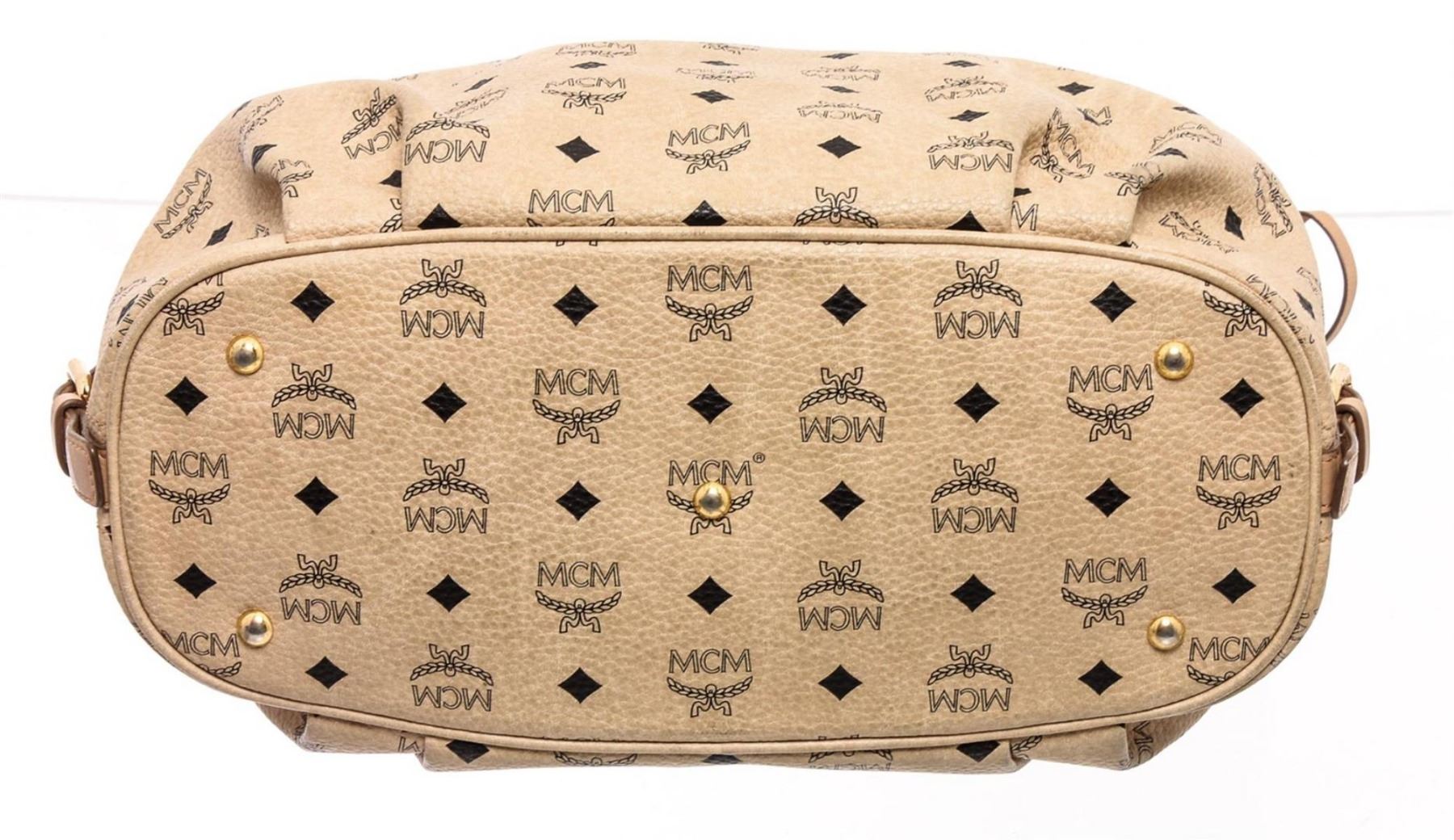 MCM cream coated canvas Visetos Hobo shoulder bag with gold-tone hardware, single flat leather shoulder strap, protective feet at base, brown logo canvas lining, three interior pockets, one with zip closure and overall zip closure at top.