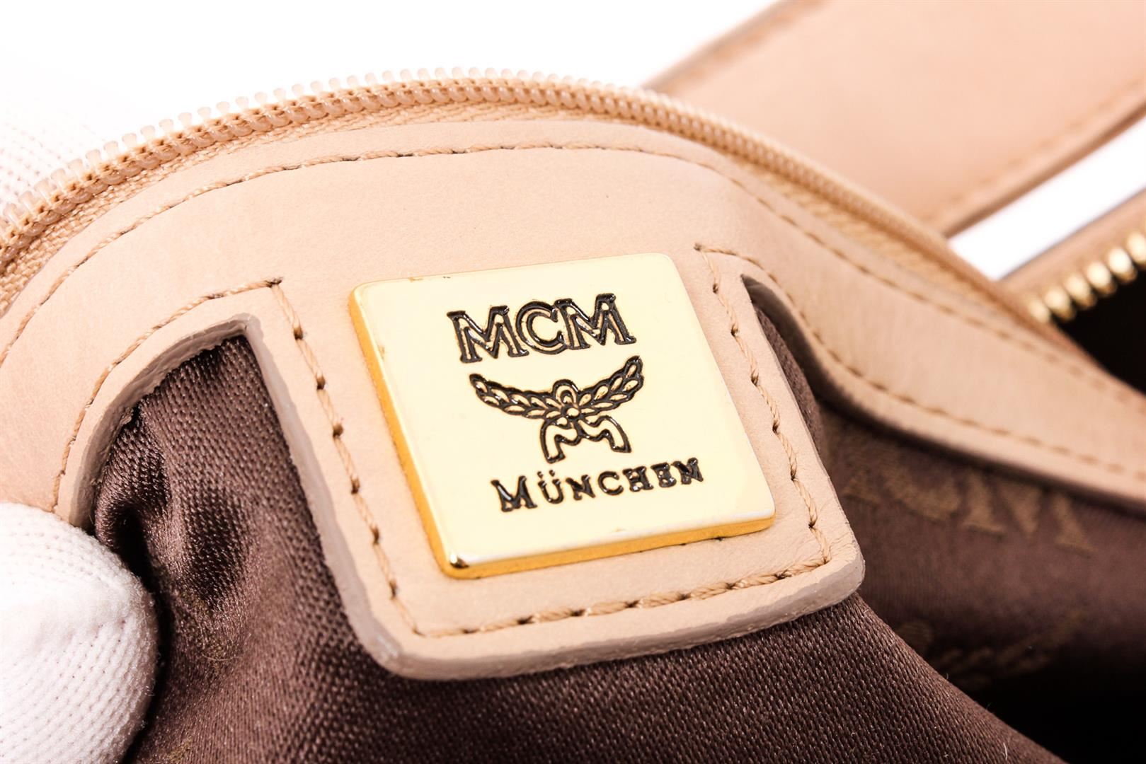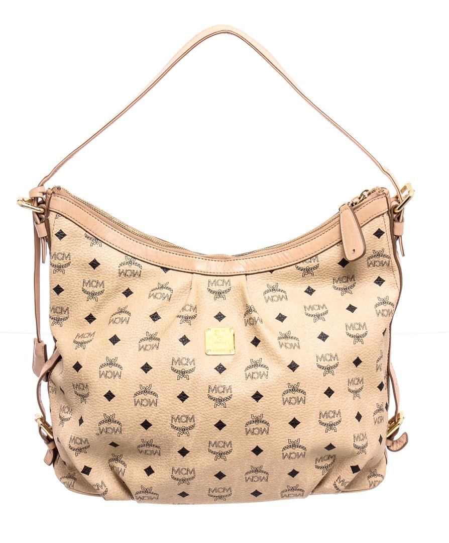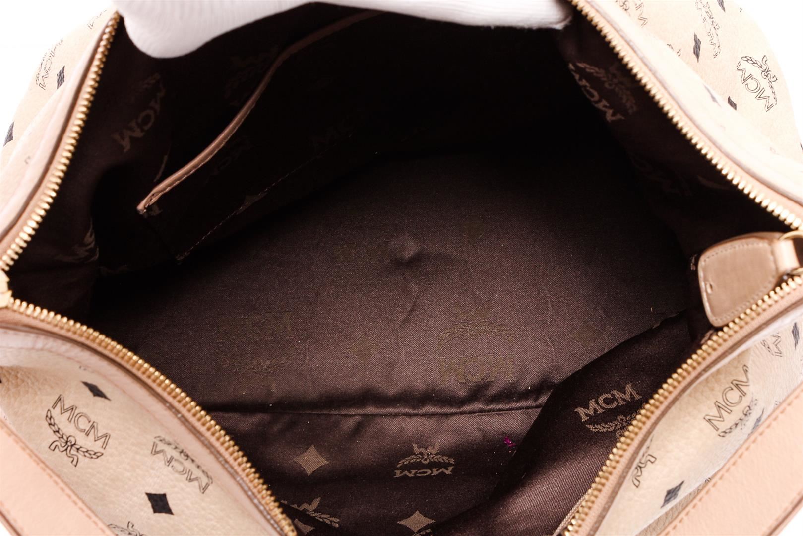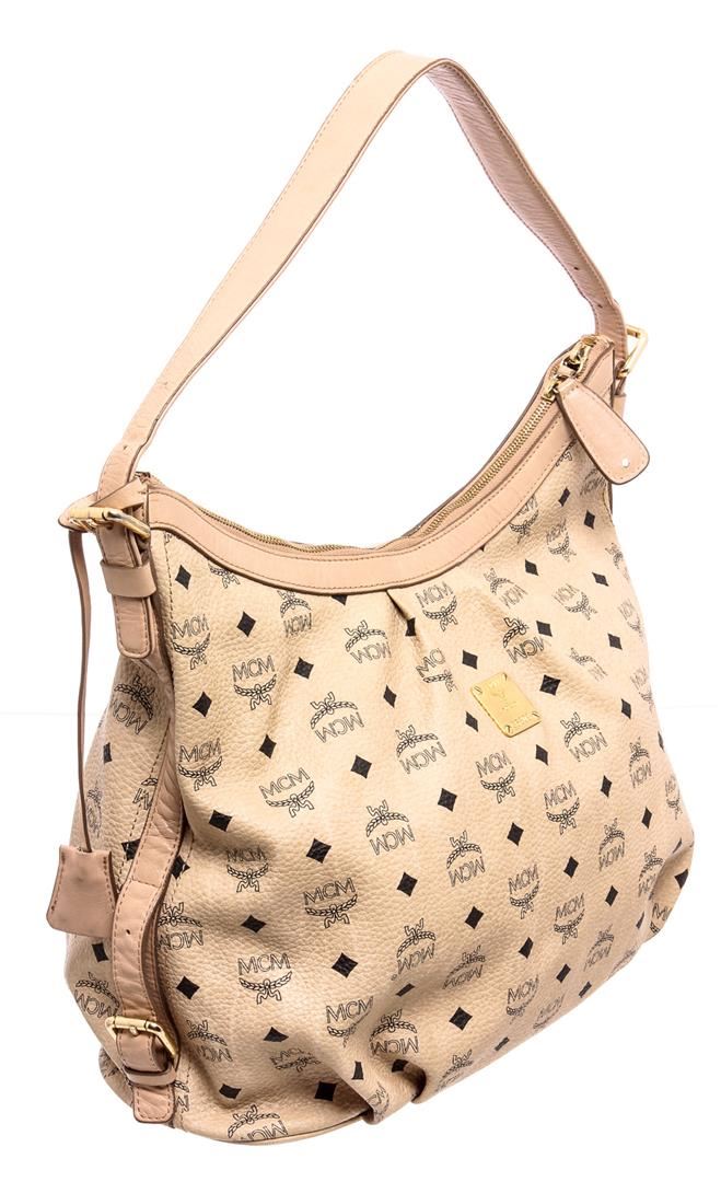 MCM cream coated canvas Visetos Hobo shoulder bag with gold-tone hardware, single flat leather shoulder strap, protective feet at base, brown logo canvas lining, three interior pockets, one with zip closure and overall zip closure at top.
